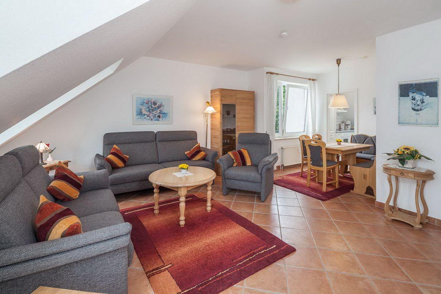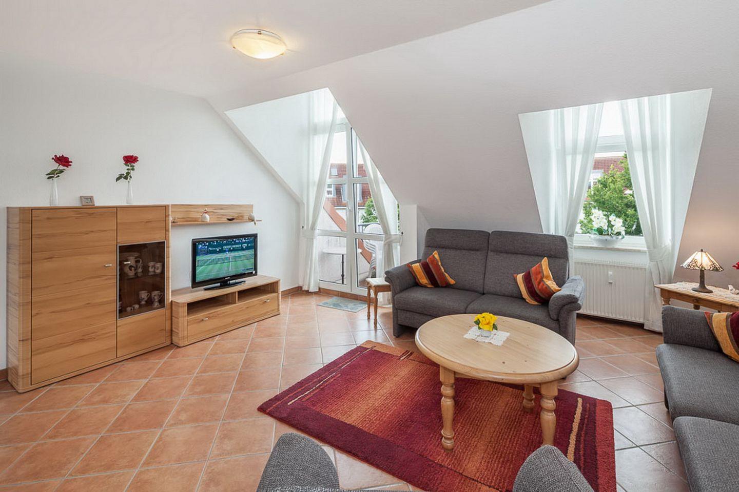 Der helle Wohnbereich dieser Ferienwohnung ist gemütlich und komfortabel ausgestattet. Für deine Unterhaltung an den Abenden oder an Regentagen sorgen ein Flachbild-Fernseher sowie eine Stereoanlage. Die Sitzecke im Wohnzimmer lädt zum Entspannen ein. Der Balkon ist vom Wohnzimmer aus zu betreten und süd-östlich ausgerichtet.