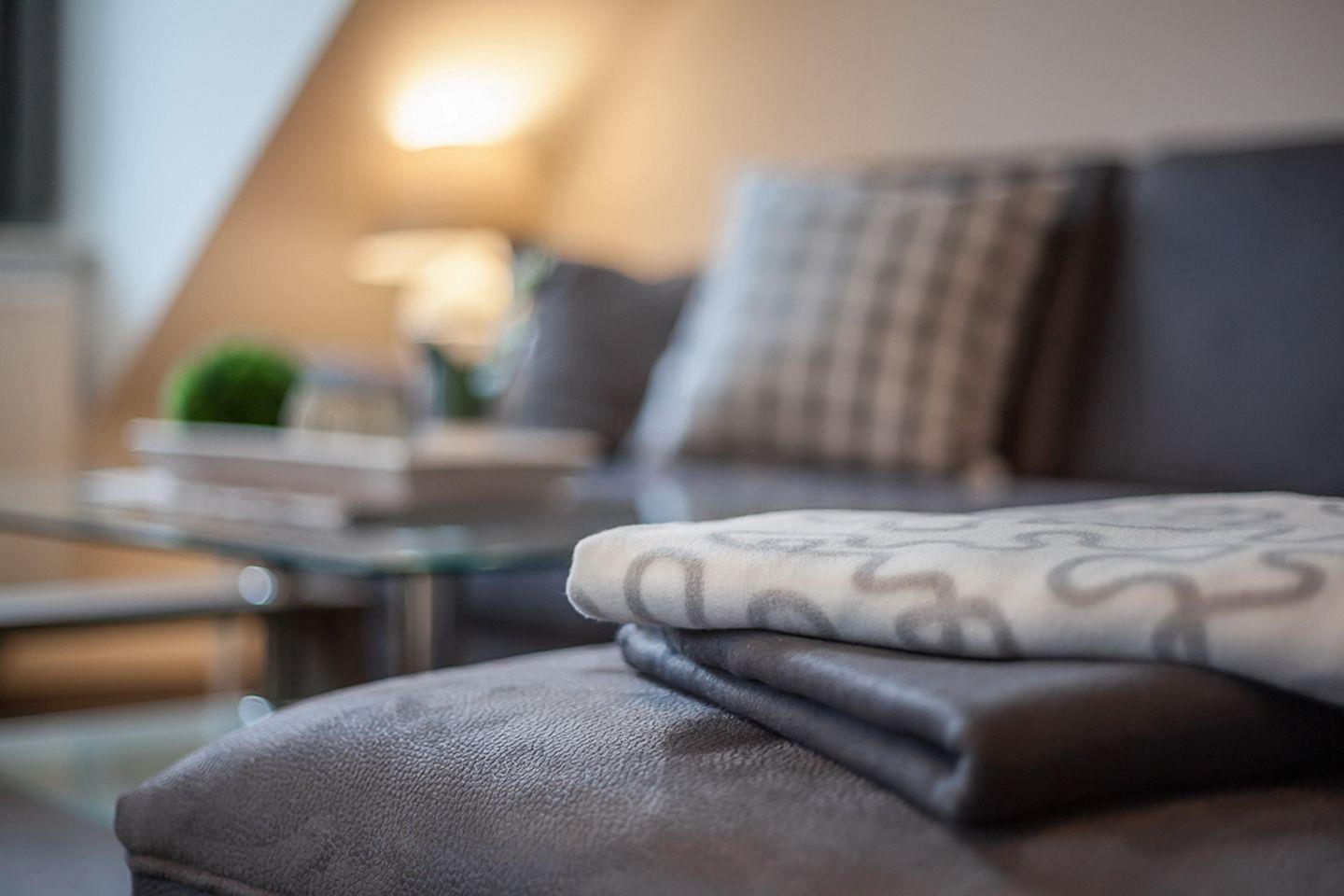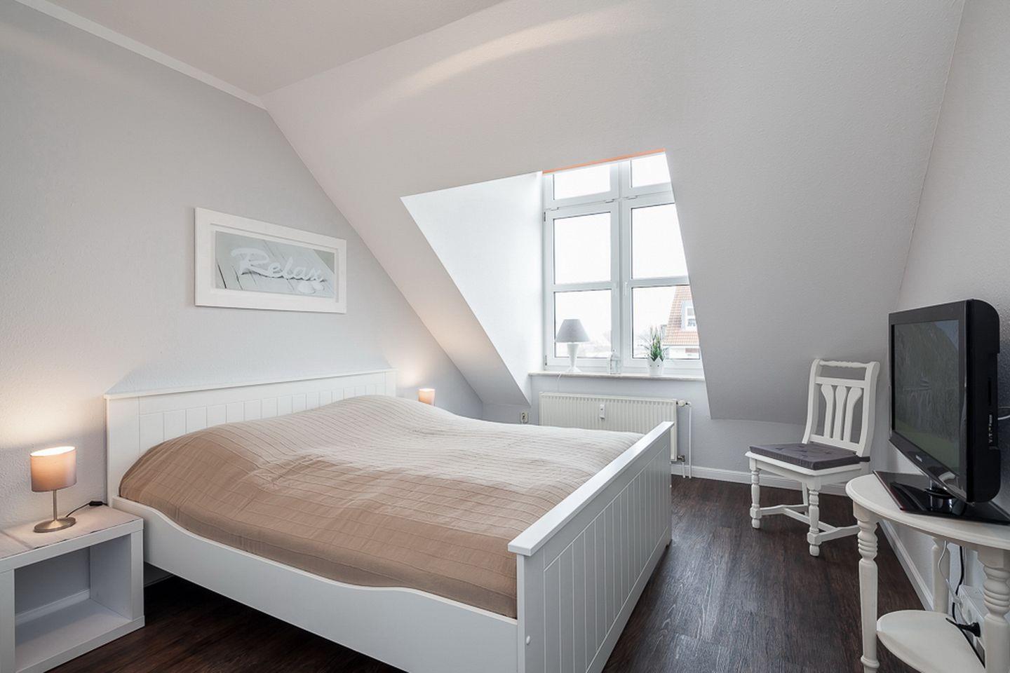 Die beiden unteren Schlafzimmer sind mit jeweils einem Doppelbett (2 x 90 x 200 cm) und einem Kleiderschrank für deine Urlaubsgarderobe möbliert. Der offene Schlafbereich im Dachgeschoss ist über die Treppe im Wohnzimmer zu erreichen. Hier befindet sich ein Doppelbett (2 x 90 x 200 cm) und eine Kommode. An allen Fenstern ermöglichen Verdunkelungsrollos einen erholsamen Schlaf. In der gesamten Wohnung ist hochwertiger Design-Belag verlegt.
