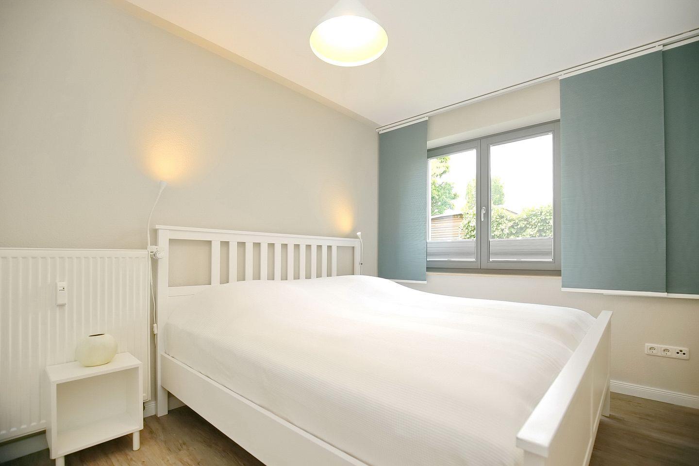 Im Schlafzimmer befindet sich ein Doppelbett (2 x 90 x 200 cm) mit elektrisch verstellbaren Lattenrosten und ein 4-türiger Kleiderschrank für deine Urlaubsgarderobe. Jalousien und Vorhänge dienen als Sicht- und Sonnenschutz. Hinter der 5. Tür verbergen sich Reinigungsmittel und ein Dyson Akkustaubsauger.
