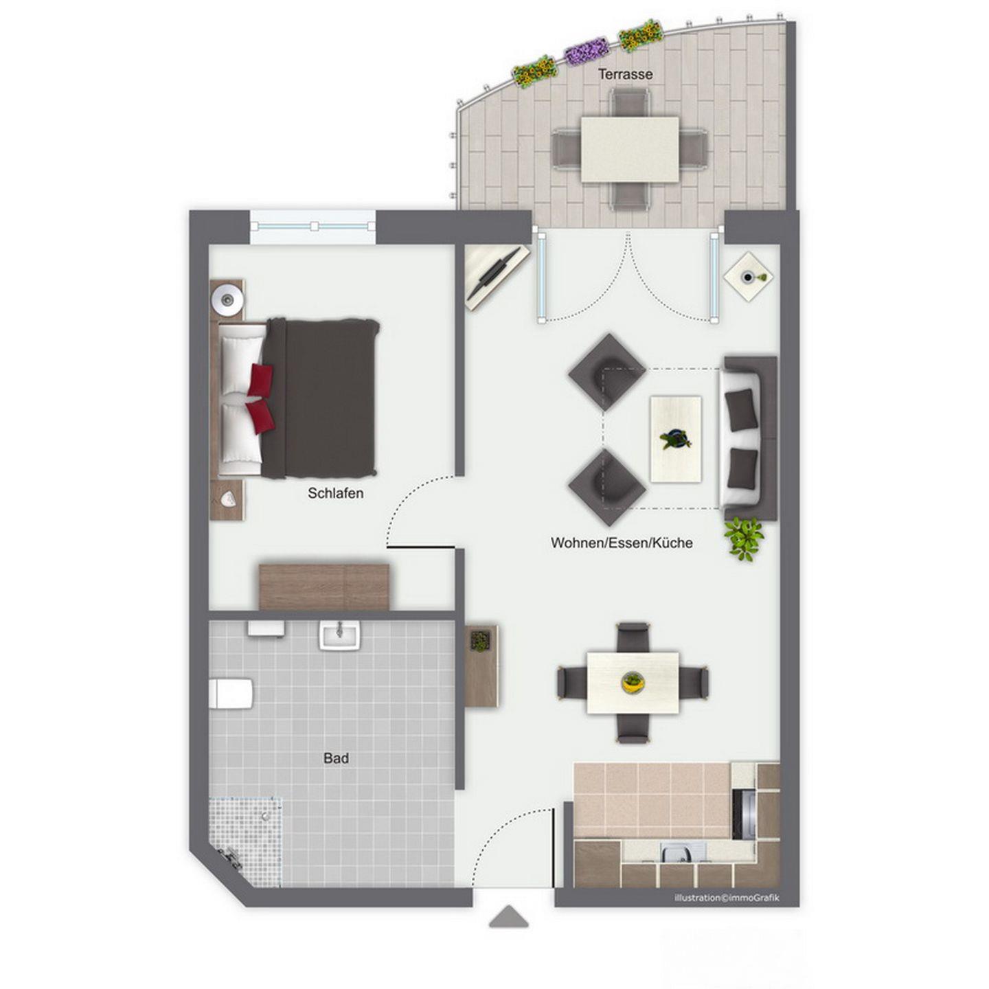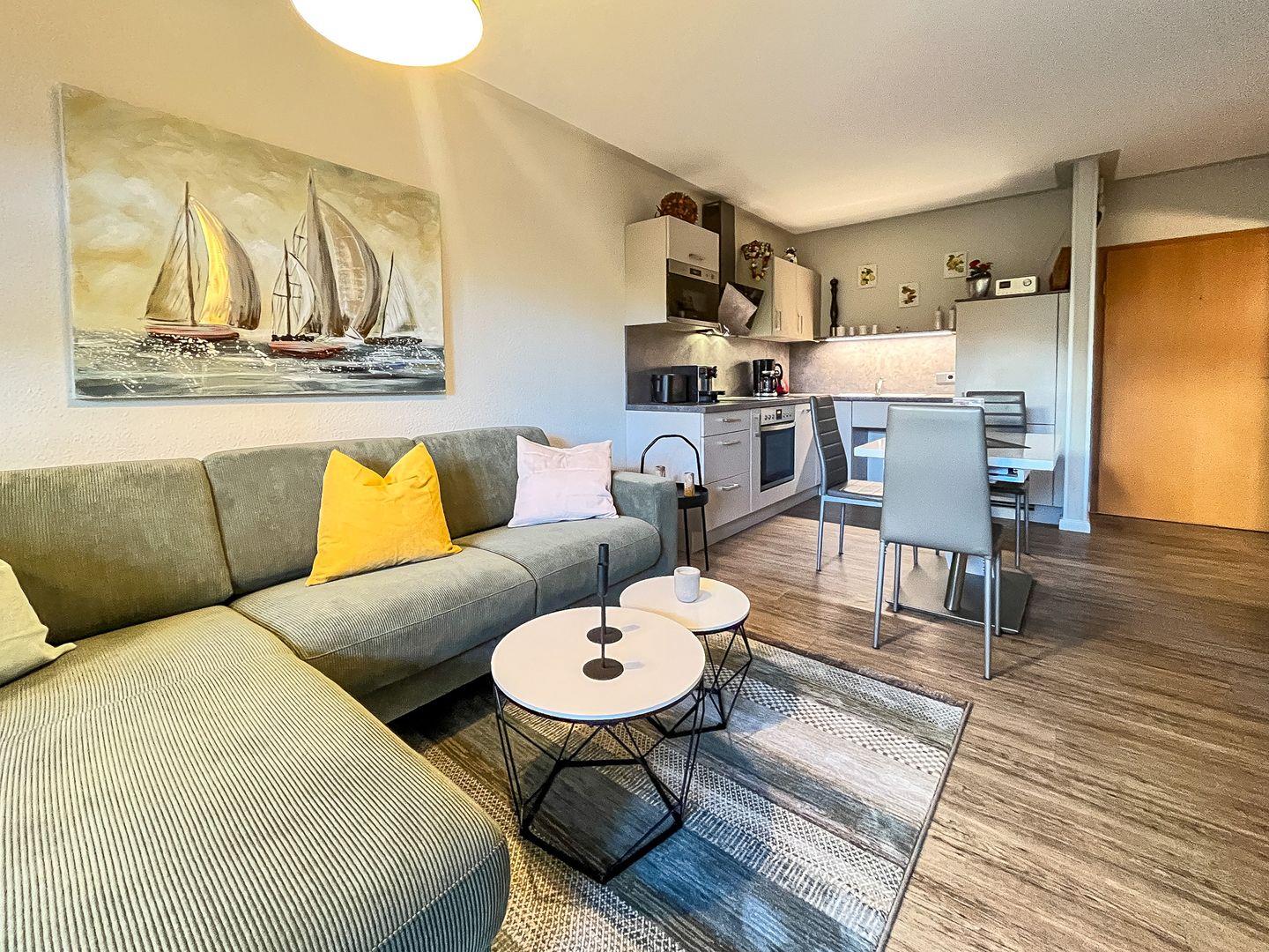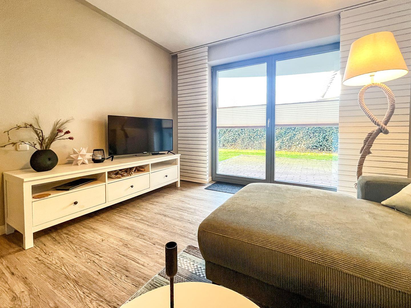 Im Wohnzimmer sorgt ein 42''-Flatscreen für deine Unterhaltung. Auf dem Boden ist Vinylbelag verlegt. Direkt vom Wohnzimmer aus erreichst du die Terrasse in Süd-West-Lage.