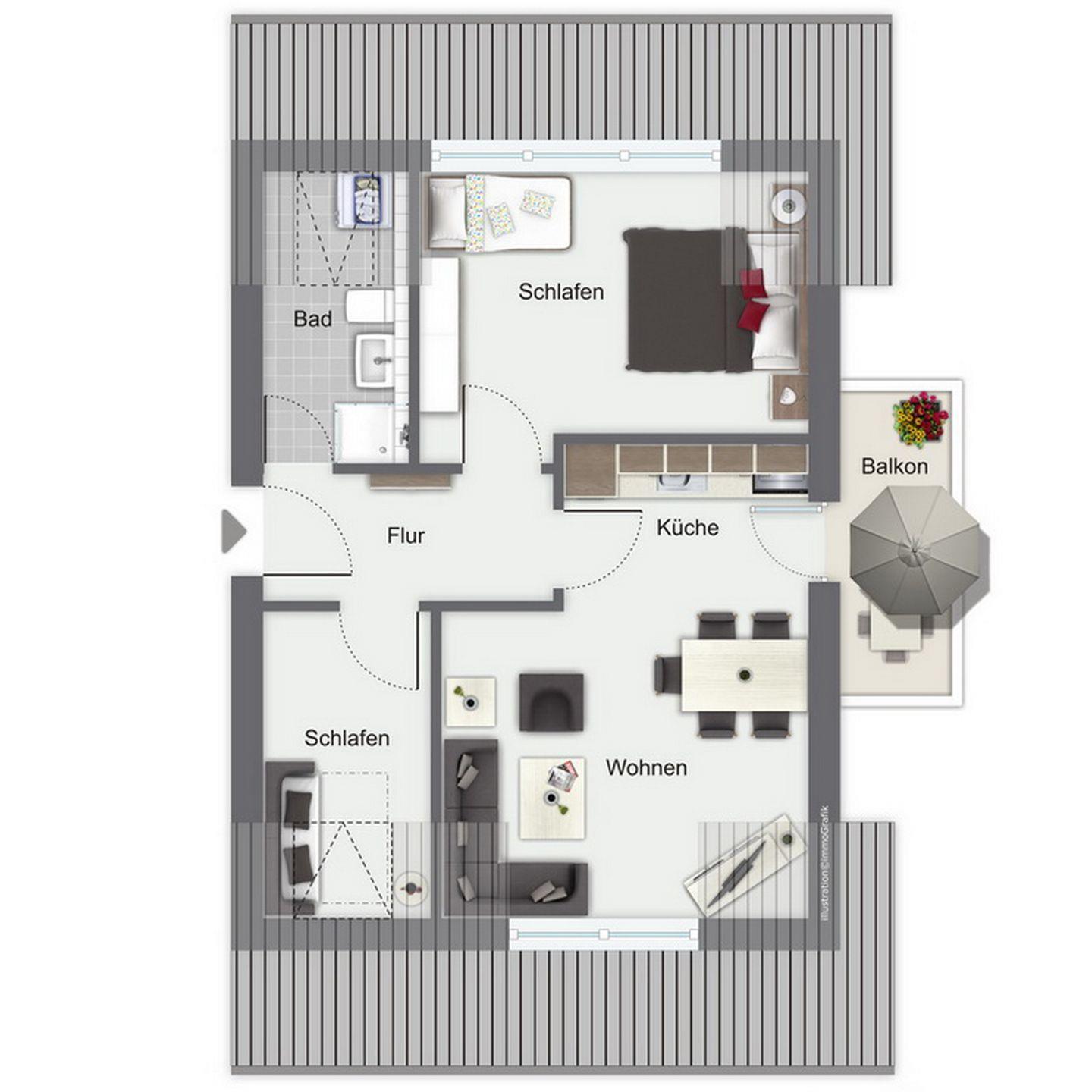 Das erste Schlafzimmer ist mit einem Doppelbett (2 x 90 x 200 cm), einem stabilen Kinderbett und einem 3-türigen-Kleiderschrank möbliert. Das zweite Schlafzimmer ist mit einem Doppelbett (2x 80 x 200 cm) eingerichtet. Zur Verdunklung an den Fenstern dienen in den Schlafzimmern Rollos.