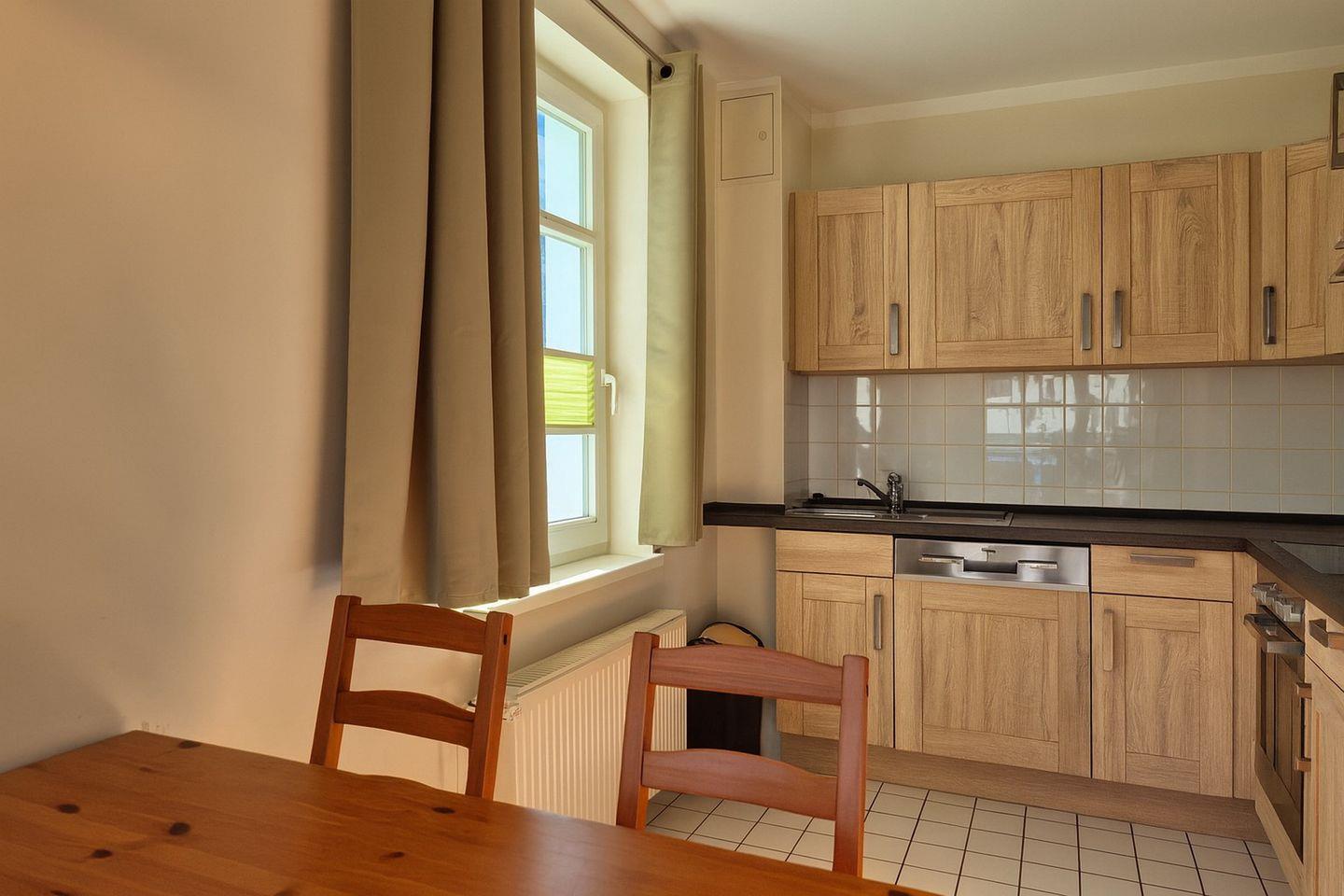 Die integrierte Küchenzeile im Wohnbereich beinhaltet ein Cerankochfeld, einen Backofen, Kühlschrank mit Gefrierfach und einen Geschirrspüler. Die Wohnung verfügt selbstverständlich auch über ein Duschbad/WC. Alle Räume sind gefliest. An den Fenstern befinden sich Plissees. Es handelt sich um eine Nichtraucher-Wohnung und Haustiere sind nicht erlaubt.