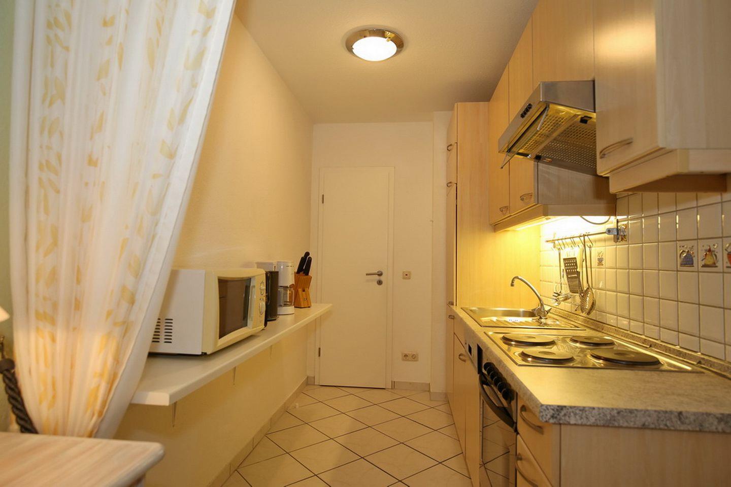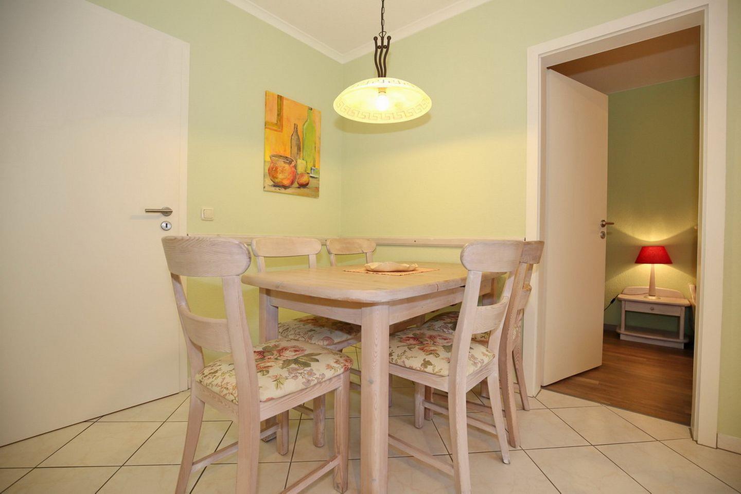 Die modern eingerichtete Küche dieser Ferienwohnung ist u.a. mit Kühlschrank, Herd mit Backofen, Mikrowelle und Geschirrspüler ausgestattet. Der gemütliche Essbereich befindet sich unmittelbar neben der Küche. Die Böden im Wohn- und Essbereich sowie in der Küche sind gefliest.
