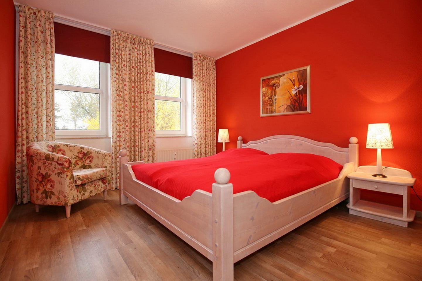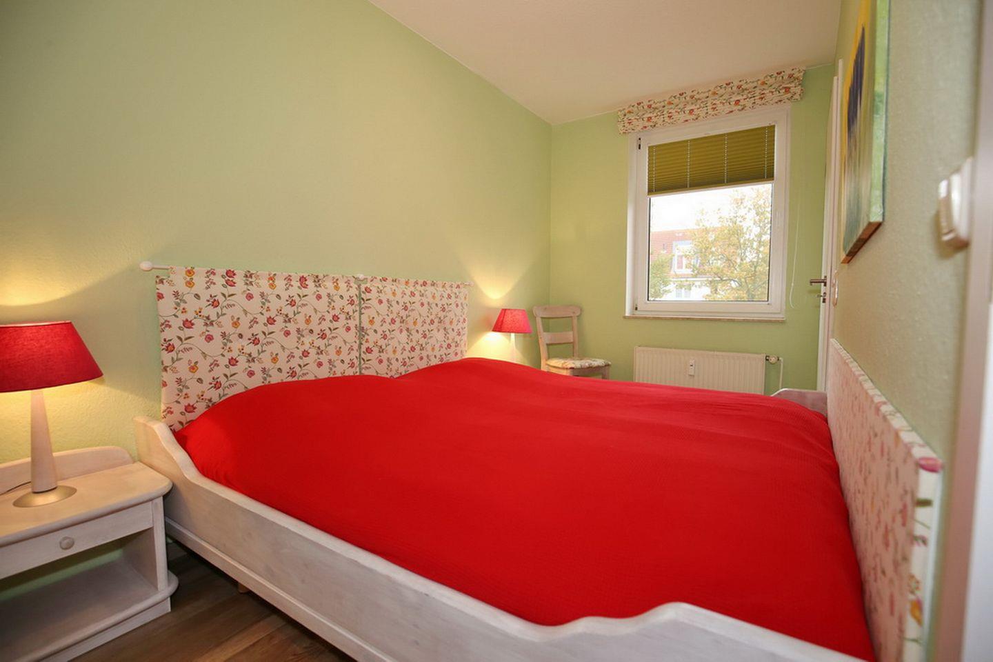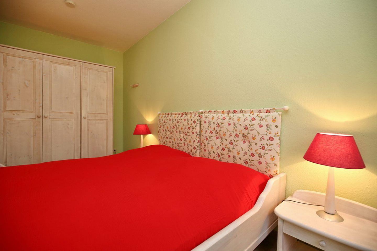 Ein geräumiges, gemütliches Schlafzimmer verfügt über ein Doppelbett (2 x 90 x 200 cm). Der 3-türige Kleiderschrank bietet viel Platz für deine Urlaubsgarderobe. Auch im kleineren Schlafzimmer befindet sich ein Doppelbett (2 x 90 x 200 cm). In beiden Schlafräumen sind die Böden mit Laminat ausgelegt. Blickdichte Vorhänge dienen in dieser Ferienwohnung als Sicht- bzw. Sonnenschutz.