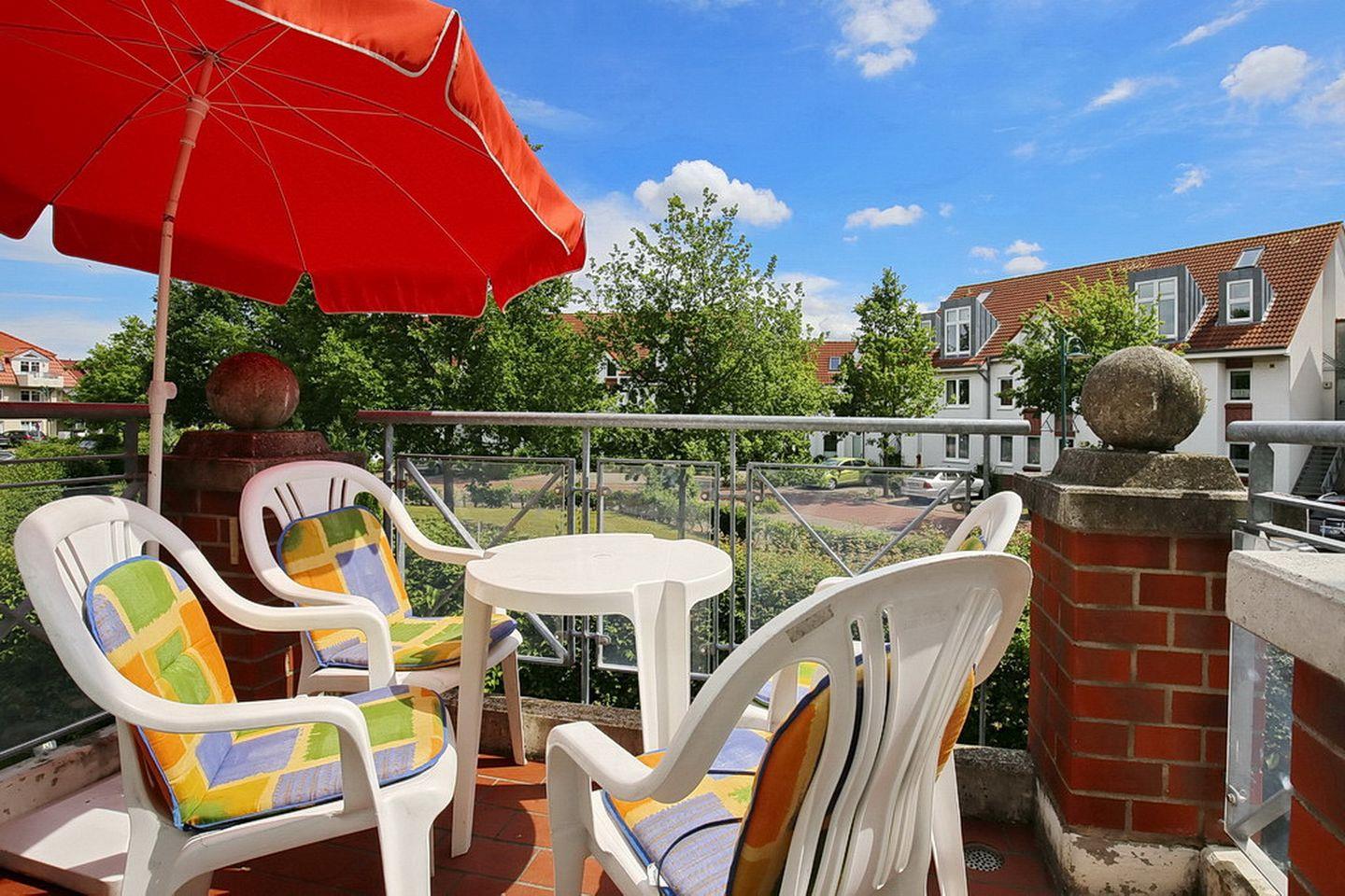 Die ansprechend eingerichtete Wohnung im 1. Obergeschoss bietet auf ca. 59 m² ein Wohnzimmer mit Küchenzeile, zwei Schlafzimmer, das Duschbad sowie den Süd-Ost-Balkon. Der Strand befindet sich in ca. 400 m Entfernung.