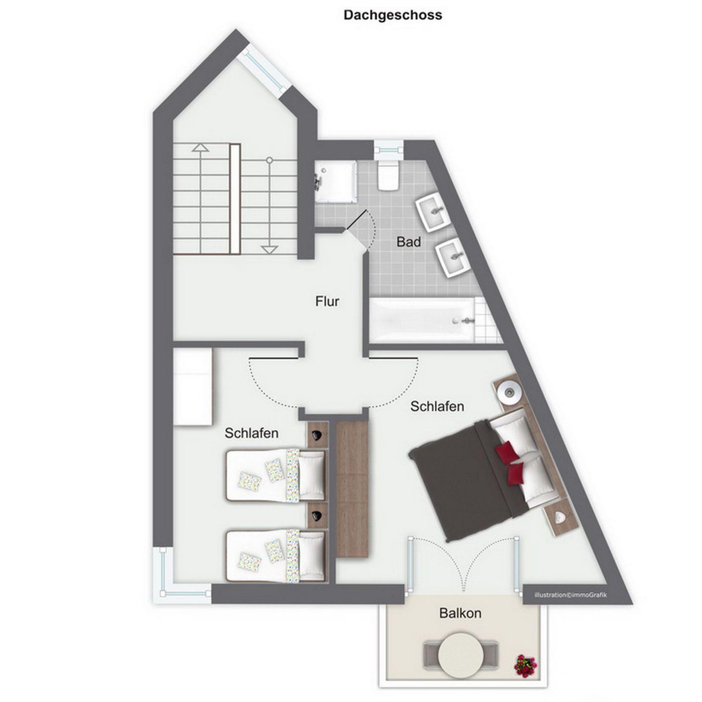 Ein kleines, freundliches Schlafzimmer mit einem Etagenbett befindet sich ebenfalls im Erdgeschoss. Eine Treppe höher im OG findest du ein modernes Bad mit Dusche, Badewanne und zwei Waschbecken sowie zwei schöne Schlafzimmer mit jeweils 1 Doppelbett. Der Boden ist mit Fliesen und Laminat ausgelegt.