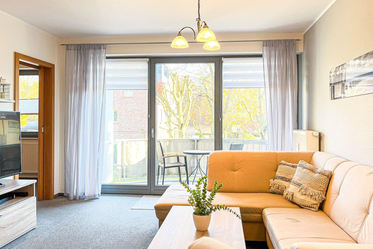 Die gemütlich eingerichtete, ca. 40 m² große 2-Zimmer-Ferienwohnung im 1. Obergeschoss bietet ein Wohnzimmer mit Küchenzeile, ein Schlafzimmer, das Duschbad und einen östlich ausgerichteten Balkon. Die Strandentfernung beträgt ca. 60 Meter.
