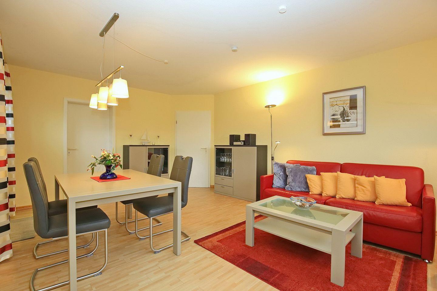 Diese 53 m² große Ferienwohnung im 1. OG mit Süd-West-Balkon verfügt über ein Wohnzimmer, ein Schlafzimmer, eine separate Küche und ein Duschbad. Die Strandentfernung beträgt ca. 100 Meter.