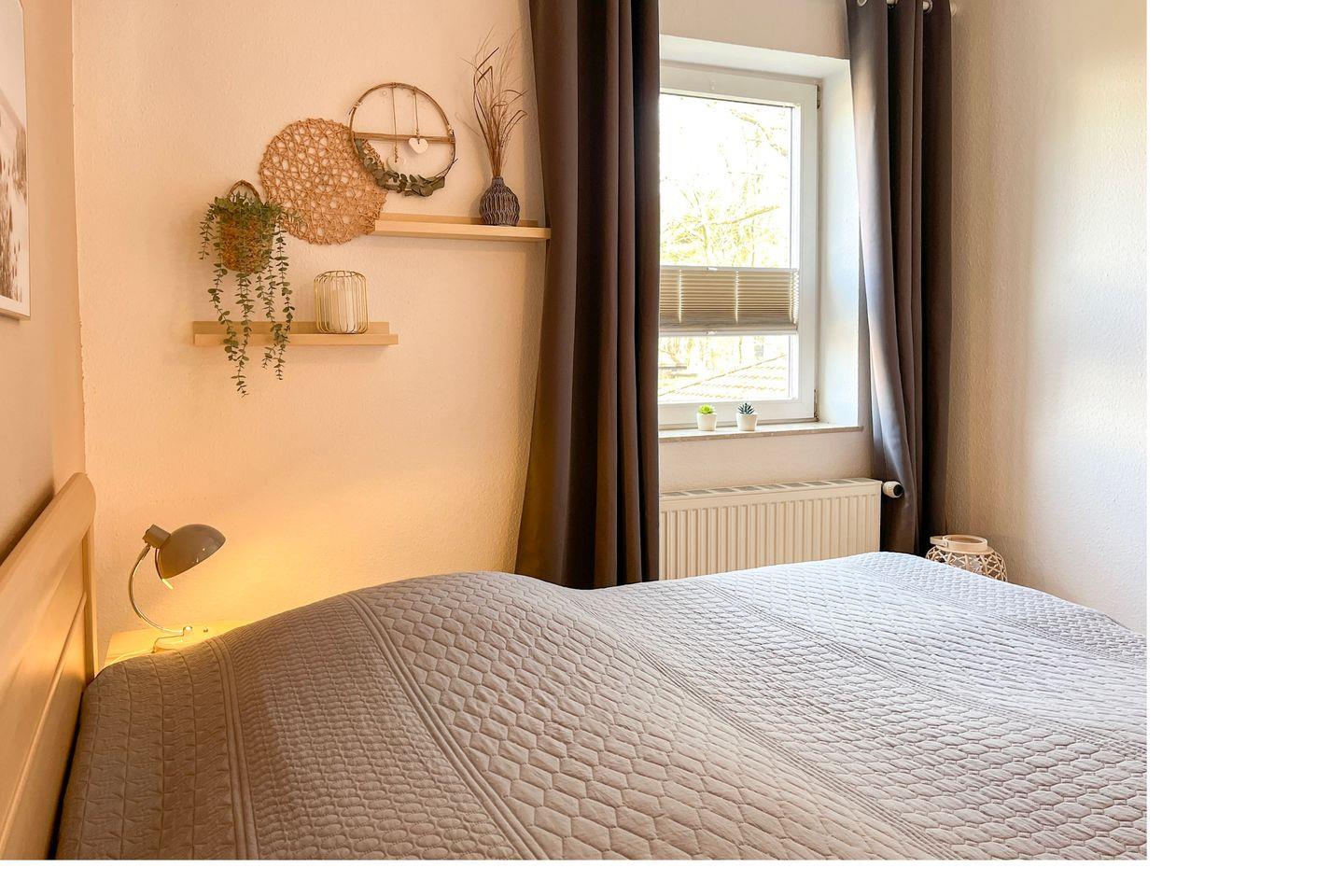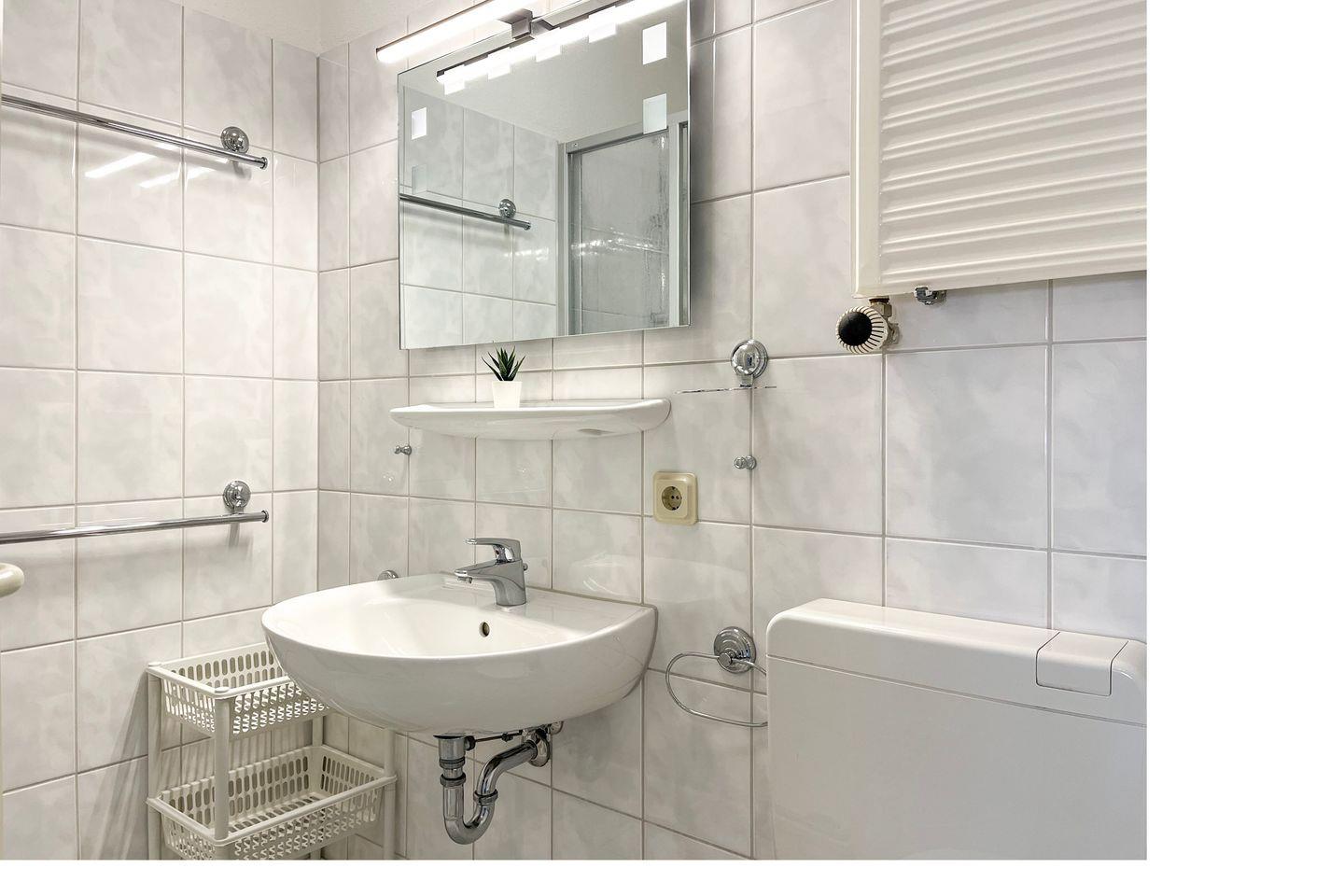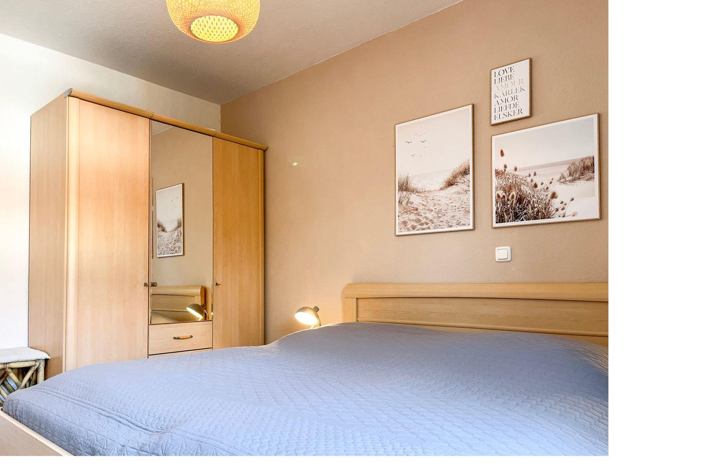Das gepflegte Schlafzimmer mit einem 3-türigen Kleiderschrank mit Spiegel und dem Doppelbett mit Komforthöhe (2 x 90 x 200 cm) lädt zum Träumen ein. Selbstverständlich gehört ein modernes Duschbad zur Wohnung.