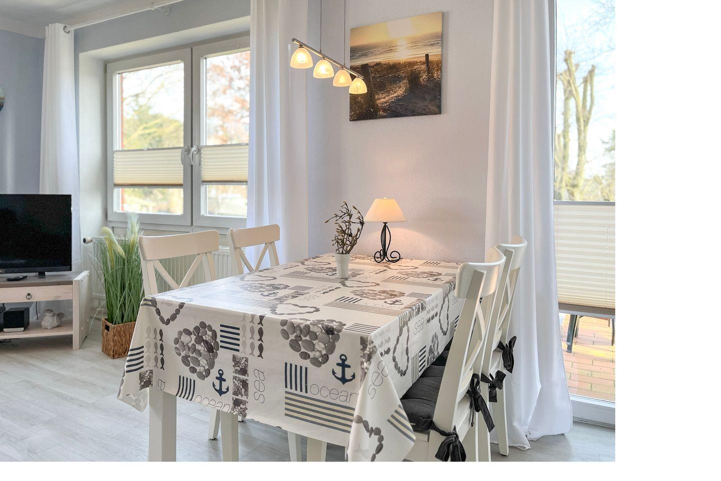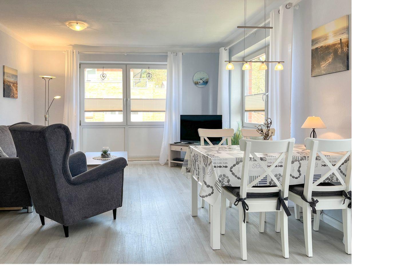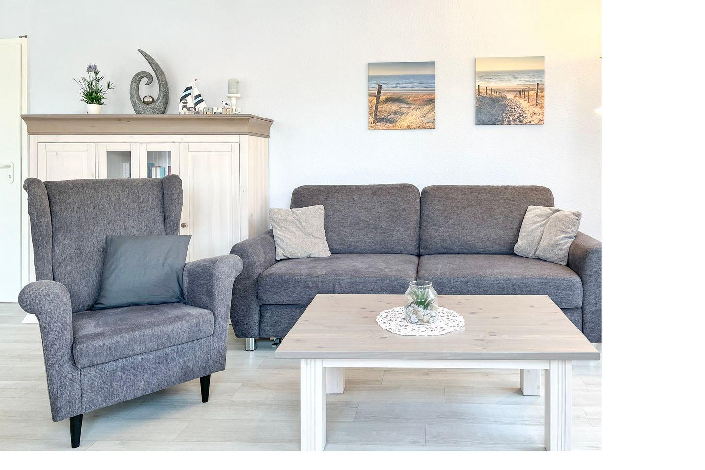 Liebevoll möbliert und urlaubsgerecht ausgestattet – so präsentiert sich diese Wohnung. Im geräumigen Wohnzimmer findest du einen modernen Essplatz für 4 Personen. Ein farbenfrohes Schlafsofa (150 x 200 cm) bietet Schlafplätze für zwei Personen. Ein Flachbild-TV und eine Stereoanlage versprechen kurzweilige Urlaubsabende. Auch eine kleine Auswahl an Lektüre und einige Spiele stehen dir zur Verfügung.