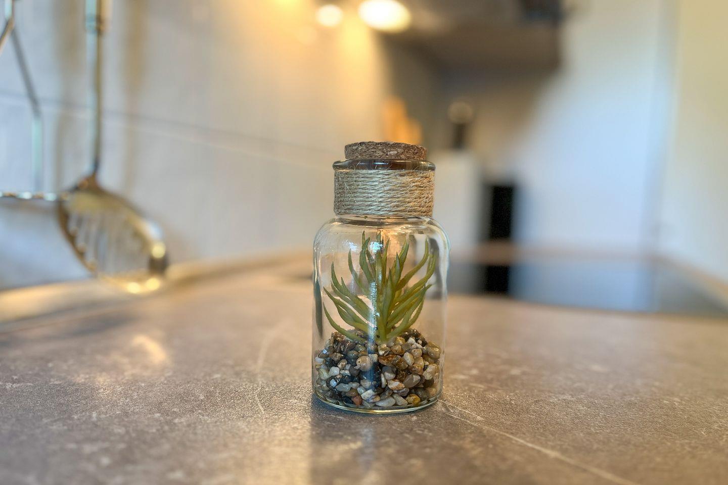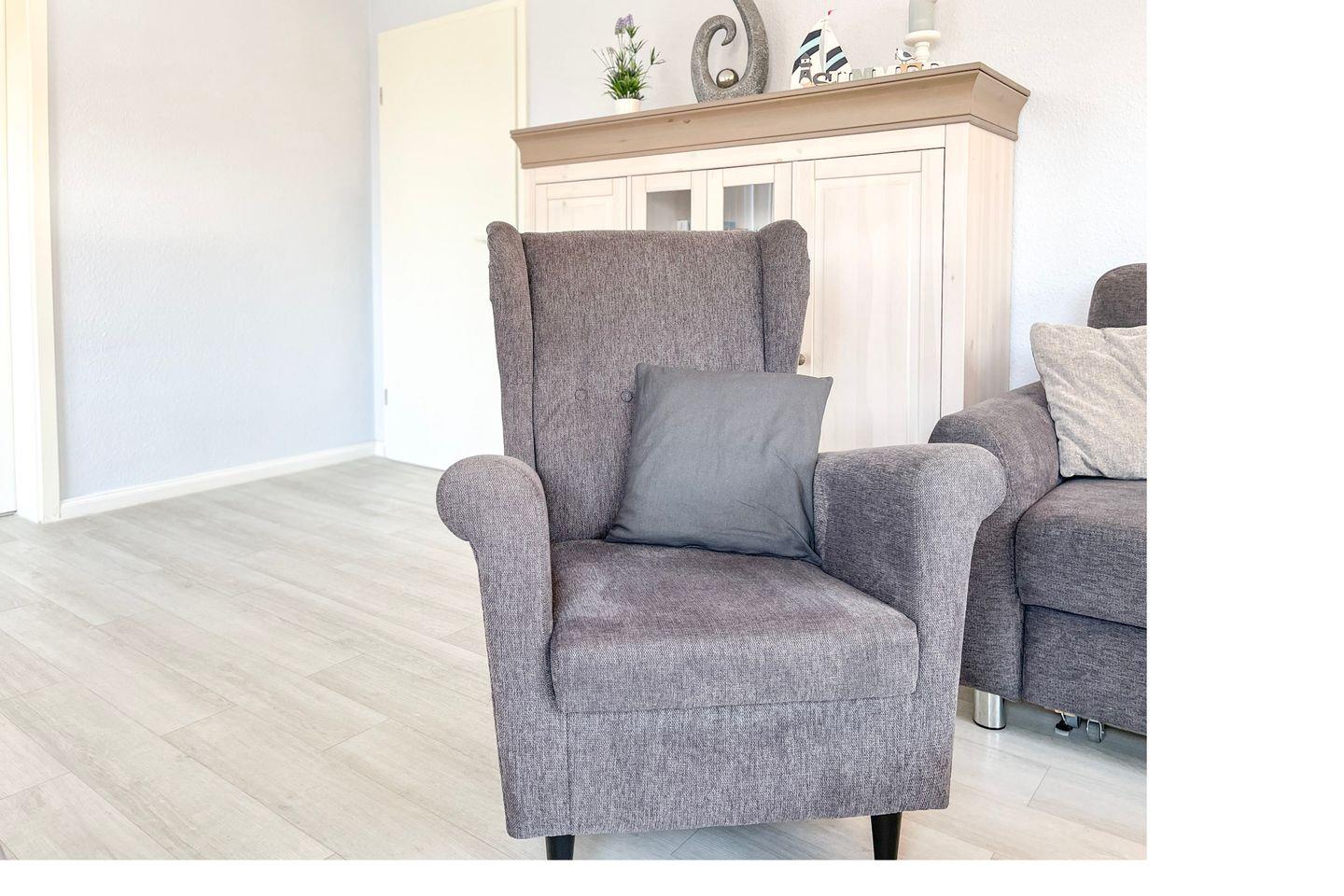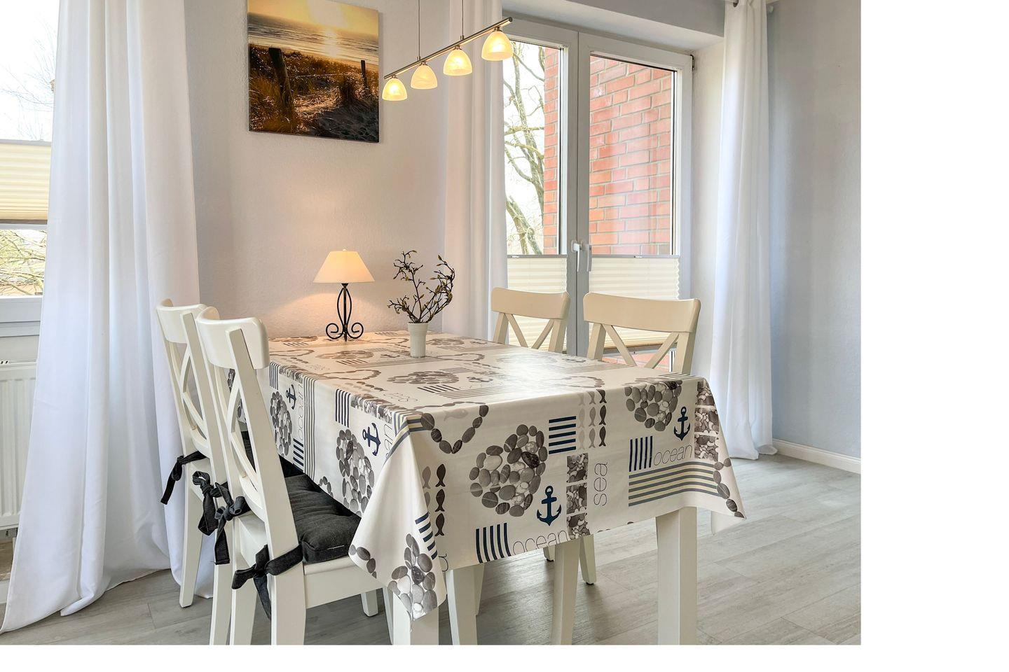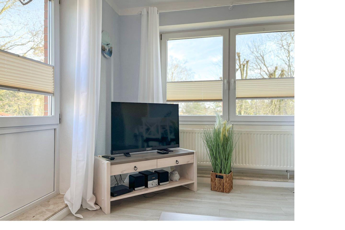 Liebevoll möbliert und urlaubsgerecht ausgestattet – so präsentiert sich diese Wohnung. Im geräumigen Wohnzimmer findest du einen modernen Essplatz für 4 Personen. Ein farbenfrohes Schlafsofa (150 x 200 cm) bietet Schlafplätze für zwei Personen. Ein Flachbild-TV und eine Stereoanlage versprechen kurzweilige Urlaubsabende. Auch eine kleine Auswahl an Lektüre und einige Spiele stehen dir zur Verfügung.