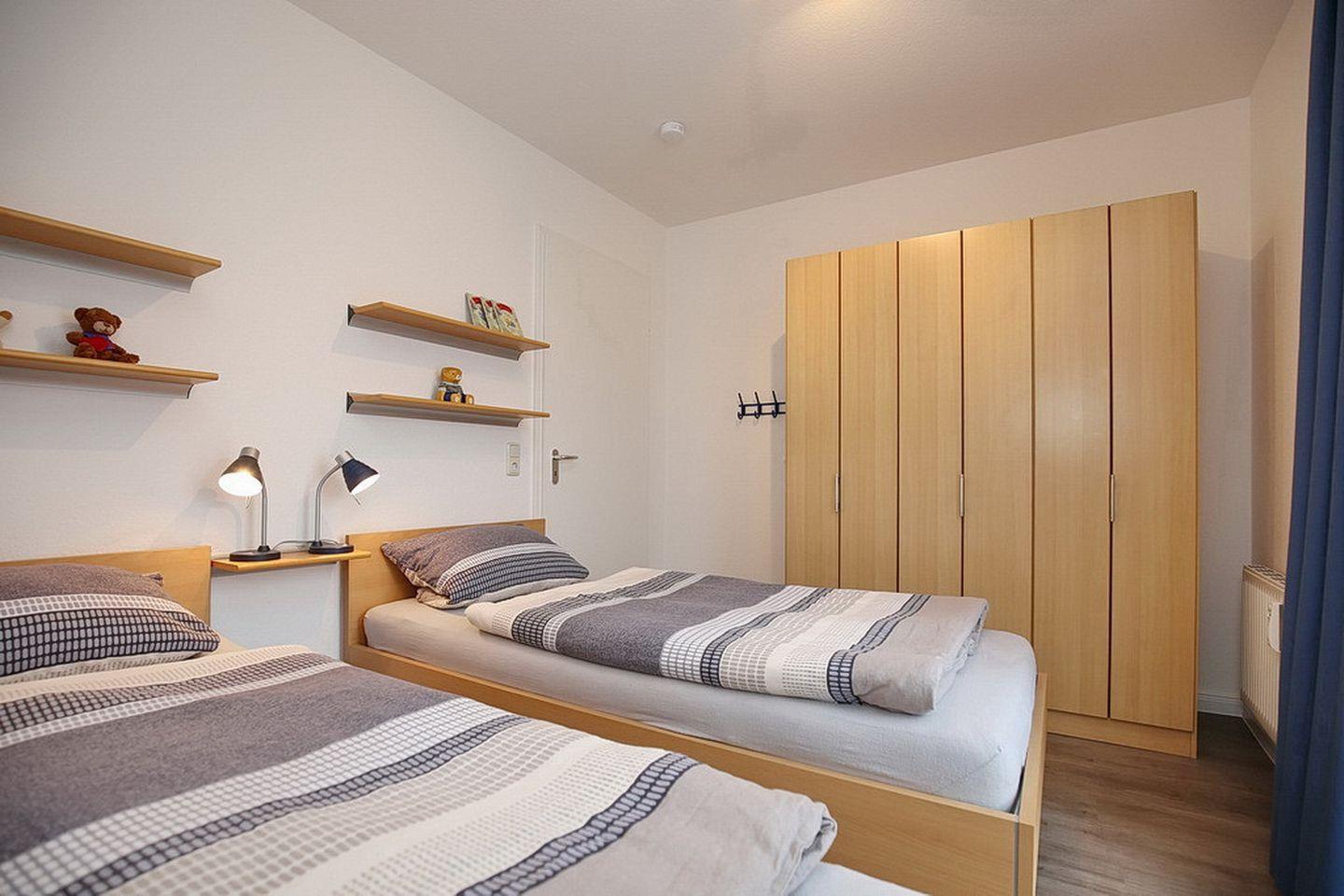 Zur Ausstattung im ersten Schlafzimmer gehören ein Doppelbett in Komforthöhe (2 x 90 x 200 cm) und im zweiten Schlafzimmer zwei Einzelbetten (90 x 200 cm). Beide Schlafräume bieten mit einem Kleiderschrank ausreichend Stauraum für deine Urlaubsgarderobe. Zur Verdunkelung gibt es Vorhänge an den Fenstern. Ein zusätzliches Kinderreisebett passt jedoch nicht in die Schlafzimmer.