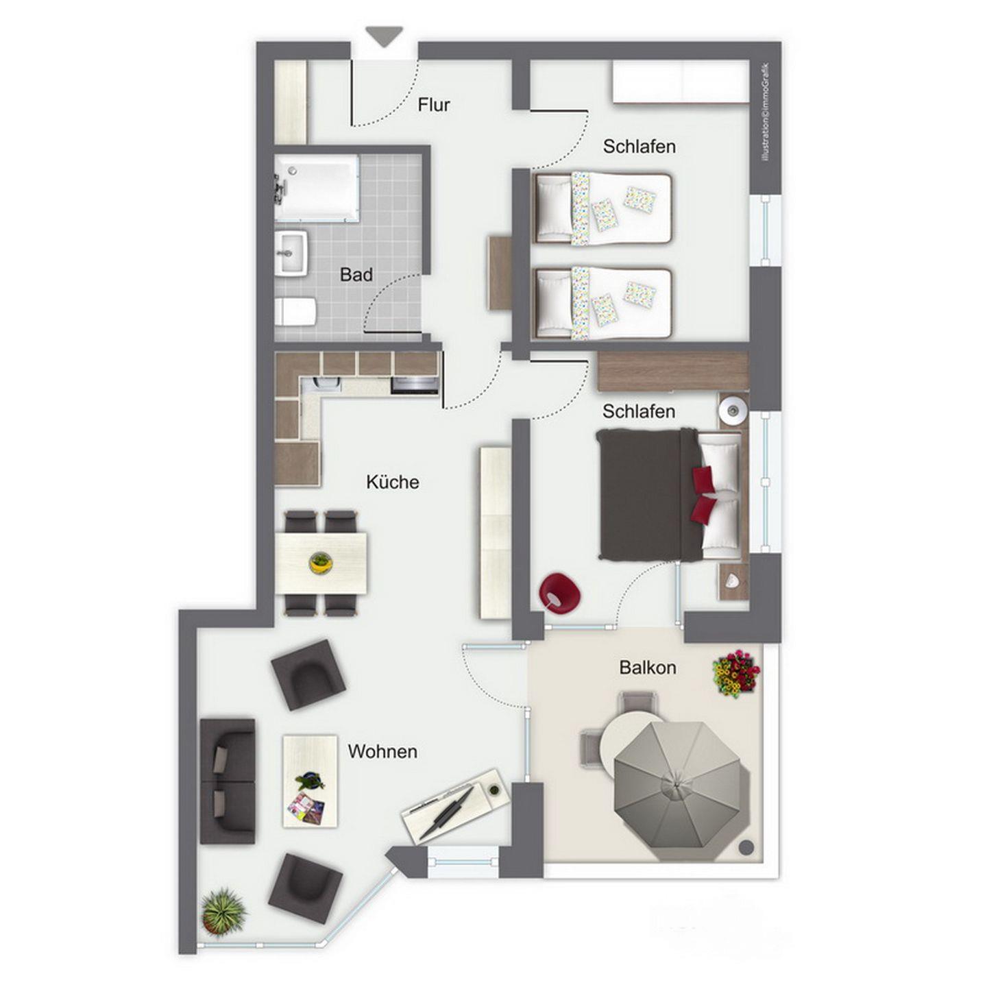 Das modern ausgestattete Duschbad ist gefliest. Im Wohnzimmer und den Schlafräumen ist Designbelag verlegt. Bitte berücksichtige, dass in dieser Nichtraucherwohnung keine Haustiere erlaubt sind. Ein PKW-Stellplatz befindet sich in der Tiefgarage.