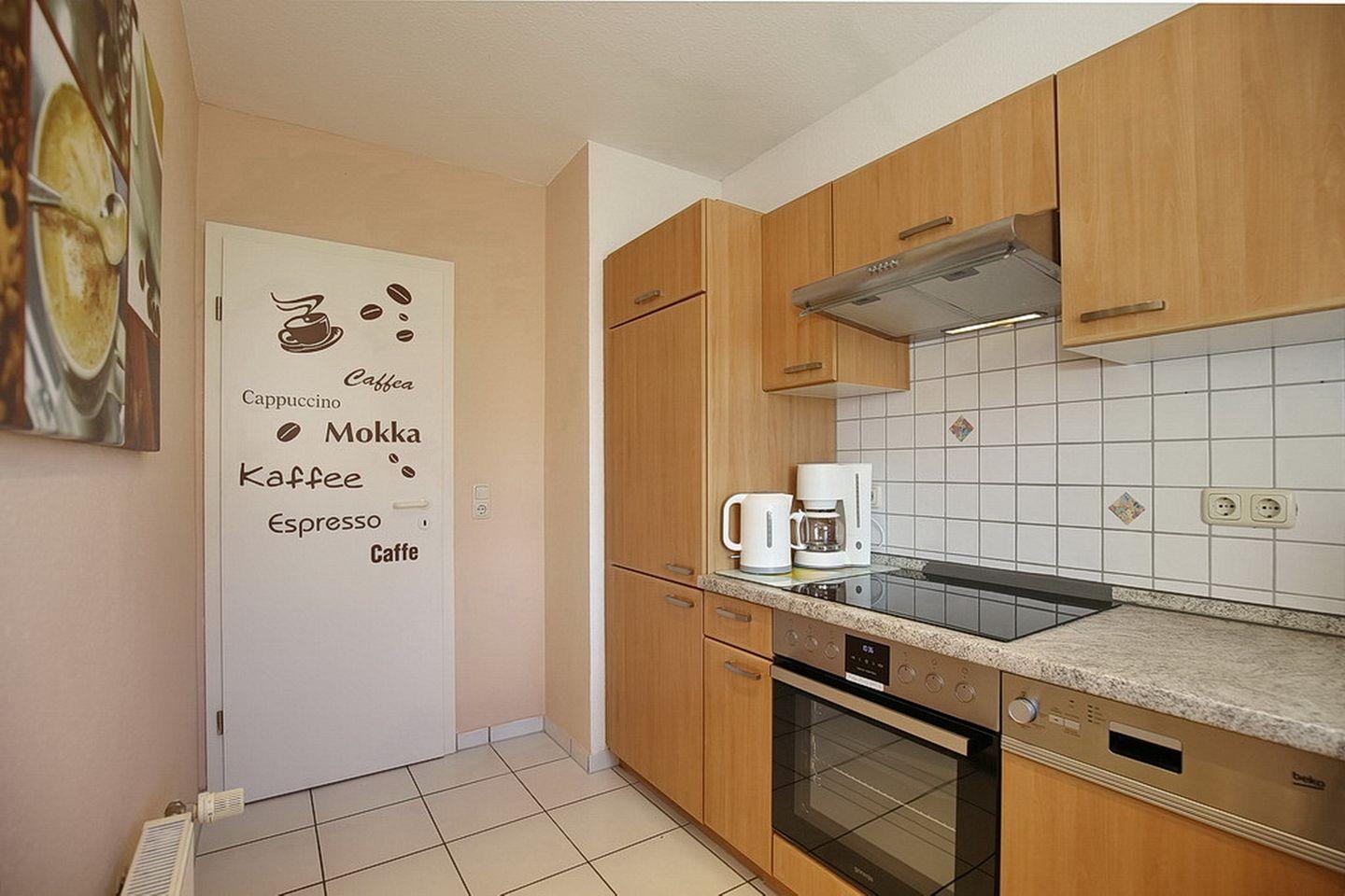 Die separate Küche ist mit Geschirrspüler, 4-Plattenkochfeld mit Backofen und Kühlschrank mit Gefrierfach, sowie einer Mikrowelle gut ausgestattet. Im gesamten Wohn- und Essbereich sind Fliesen verlegt.