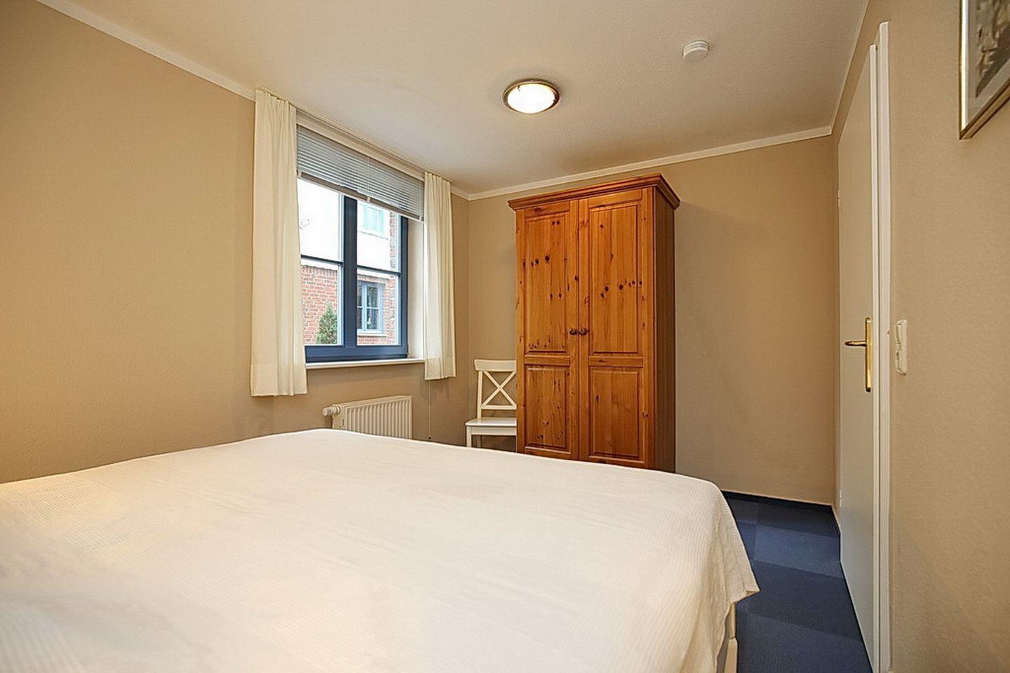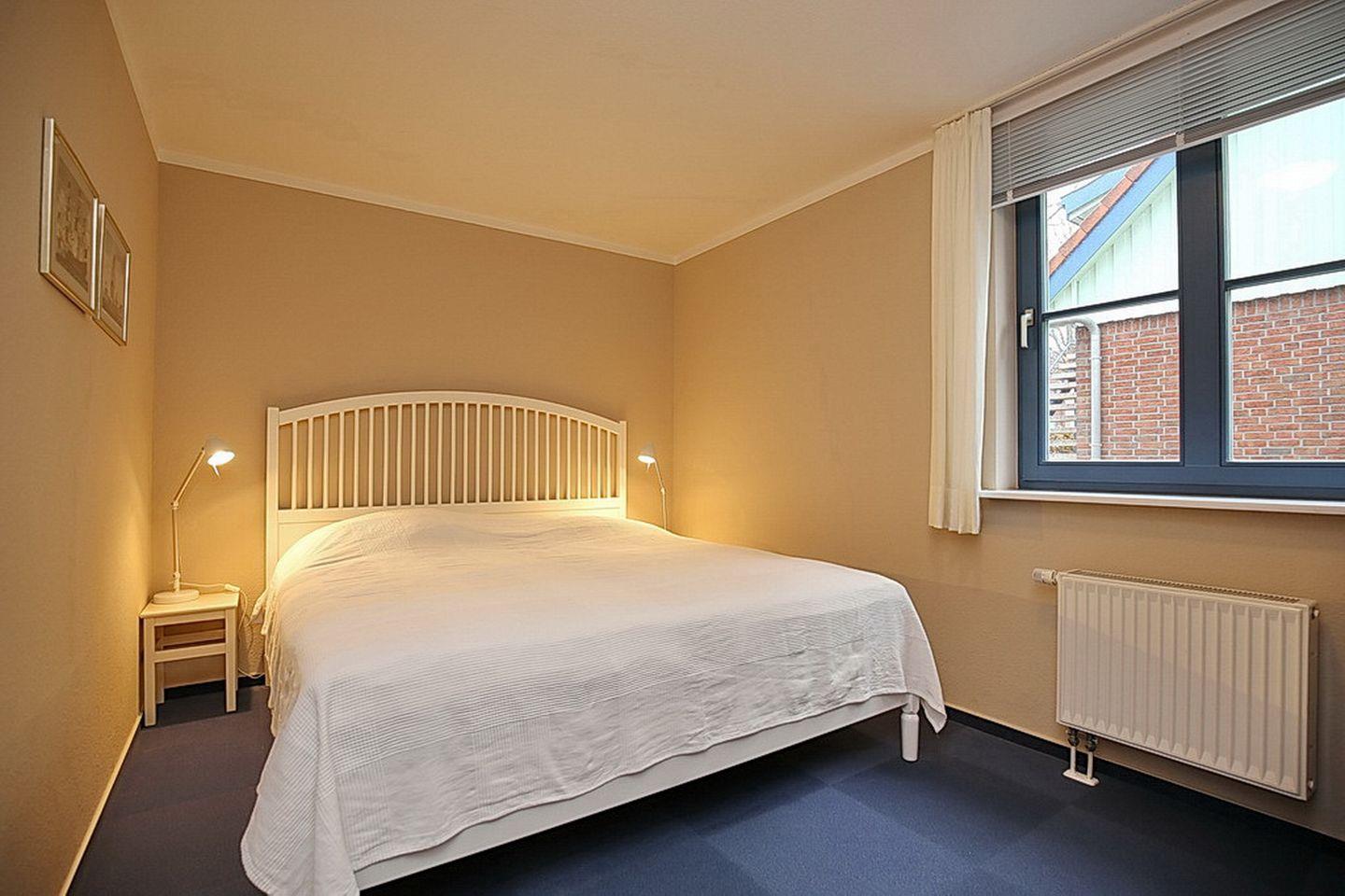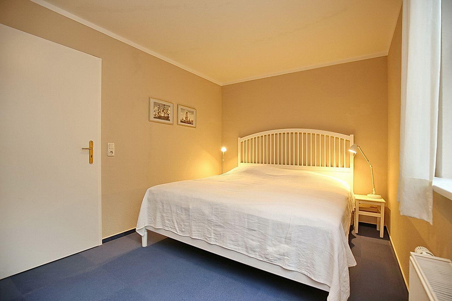 Zur Schlafzimmereinrichtung gehört ein komfortables Doppelbett (2x 90 x 200 cm) und ein zweitüriger Kleiderschrank. Die Fenster werden im Schlaf- und Wohnraum mit Vorhängen verdunkelt. Der Boden ist mit Teppich ausgelegt.