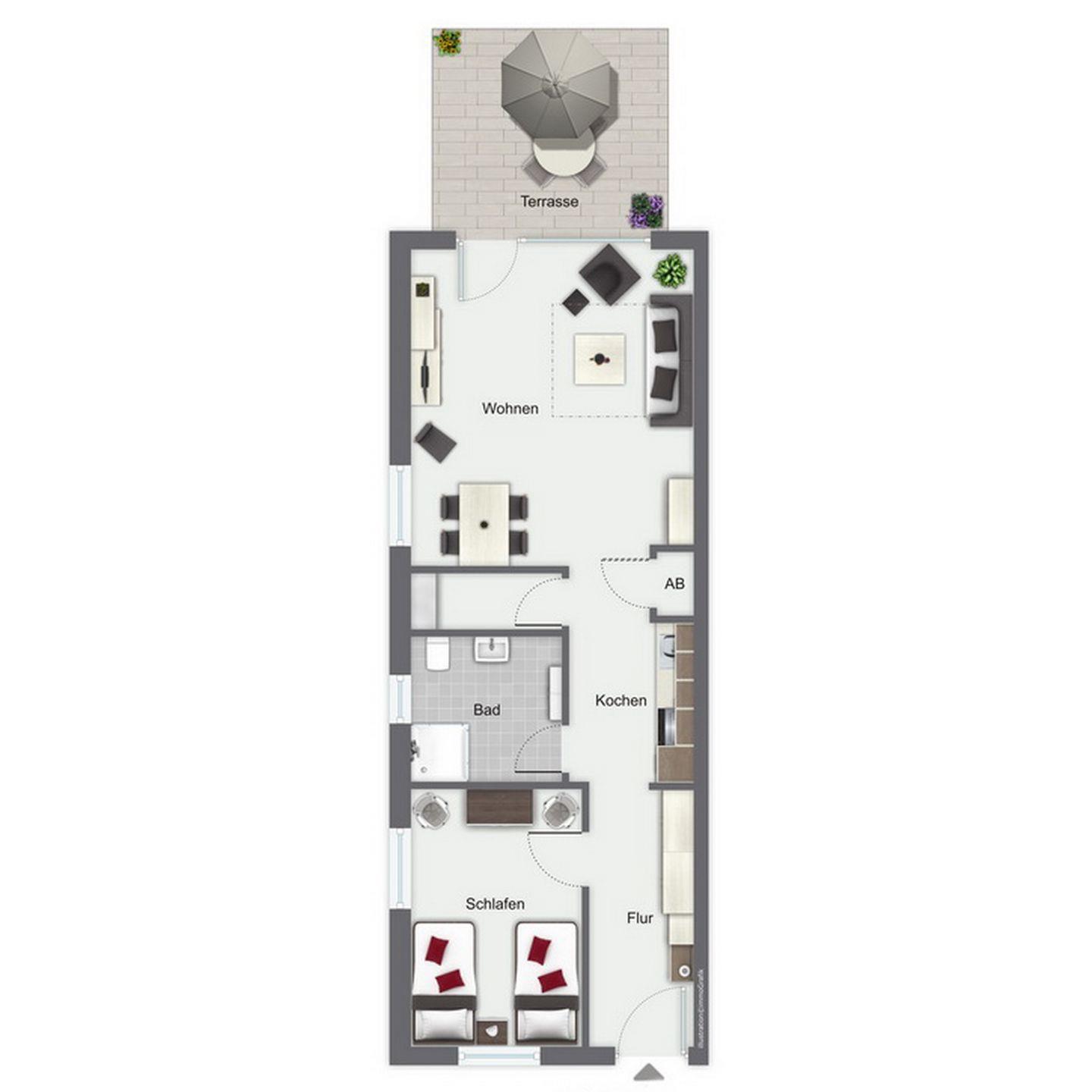 Die möblierte Terrasse lädt zum entspannten Aufenthalt im Freien ein. Diese erreichst du über den Wohnraum. Es erwarten dich im Wohnzimmer eine Schlafcouch (200 x 200 cm) und ein Essplatz für vier Personen. Zum Zeitvertreib dienen ein Flachbild-TV, eine Stereoanlage, ein Blu-ray-Player und eine Auswahl an Büchern und Spielen.