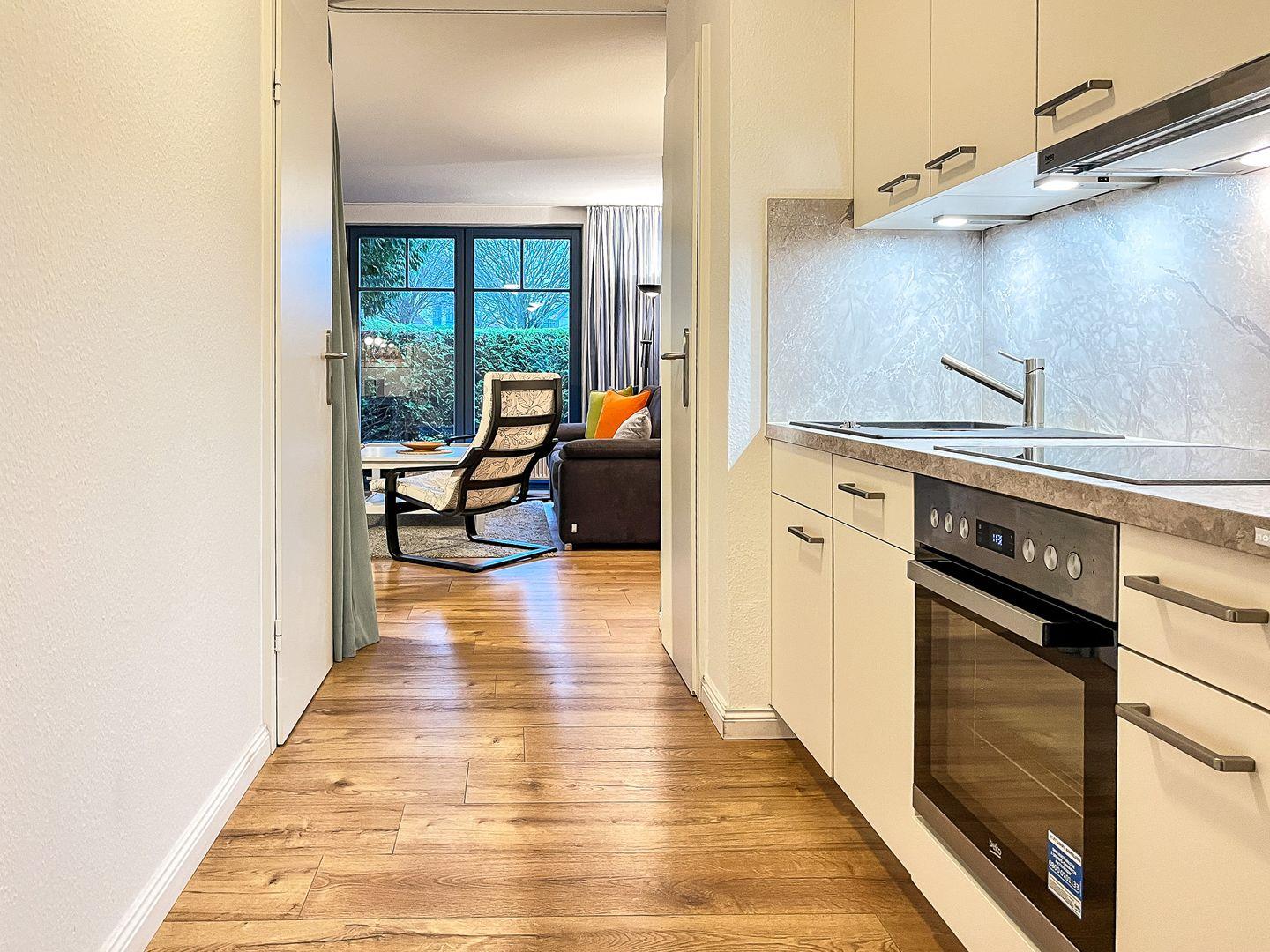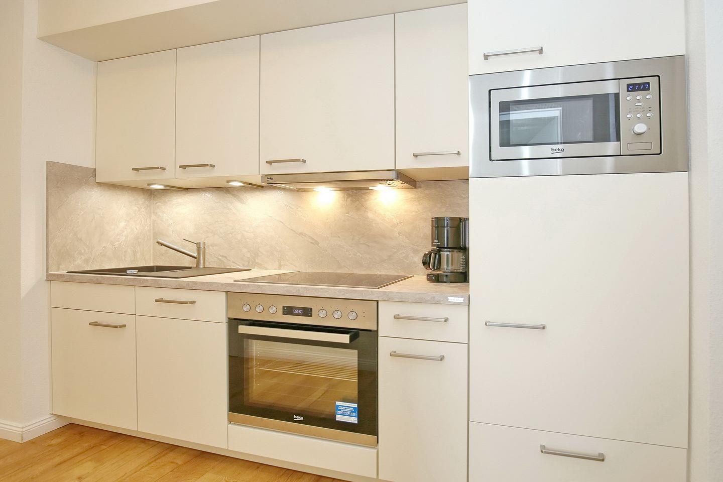 In der integrierten Küchenzeile findest du einen Backofen mit einem Cerankochfeld, einen Kühlschrank mit Gefrierfach, einen Geschirrspüler und eine Mikrowelle vor. Als Bodenbelag wurde im Wohn- und Küchenbereich Laminat gewählt.