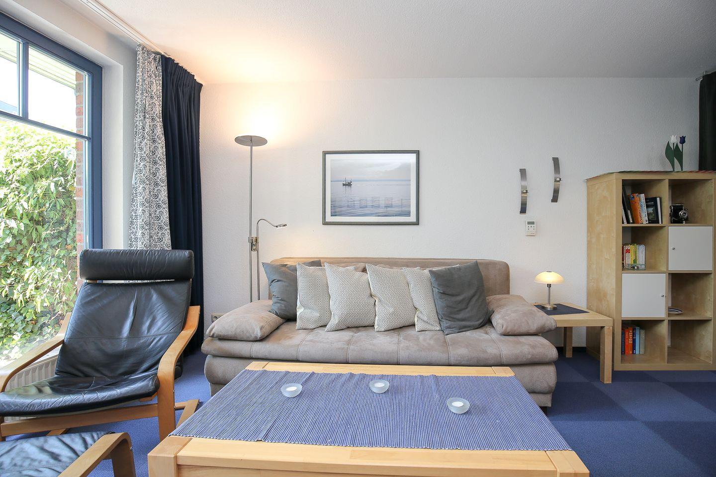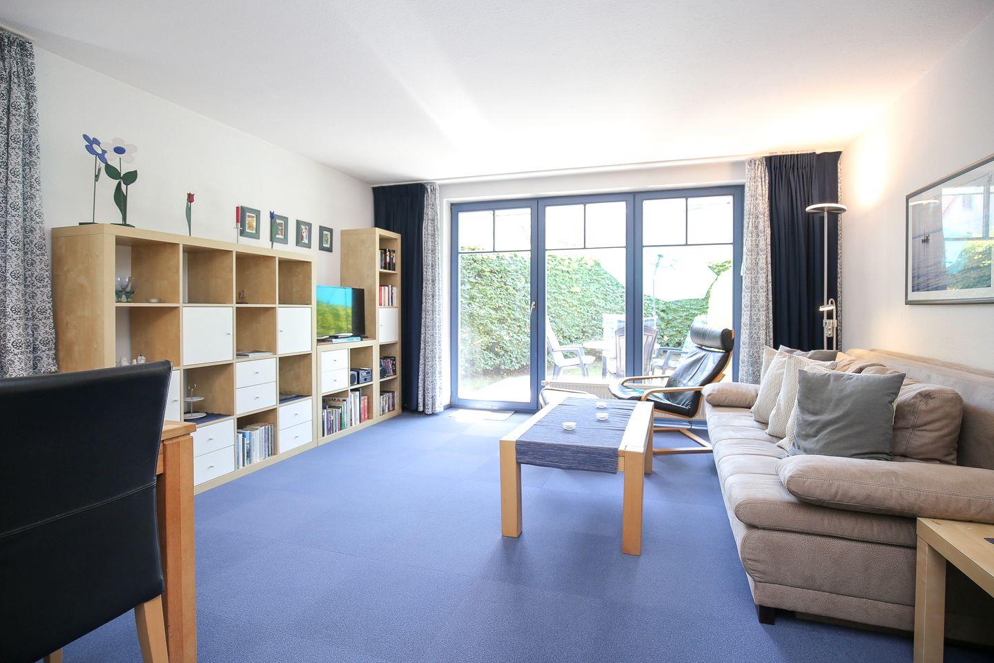 Die Terrasse schließt sich direkt dem Wohn- und Essbereich an und ist mit Liegestuhl, vier Sesseln mit Auflagen, Tisch und Sonnenschirm möbliert. Der Wohnbereich ist mit gemütlichem Schlafsofa (140 x 200 cm), Relax-Sessel und Essecke offen gestaltet. Zur Ausstattung gehören ein Flachbild-TV, ein DVD-Player, eine Stereoanlage mit USB-Anschluss und Dockingstation, sowie eine kleine Auswahl an DVDs, CDs und Büchern.