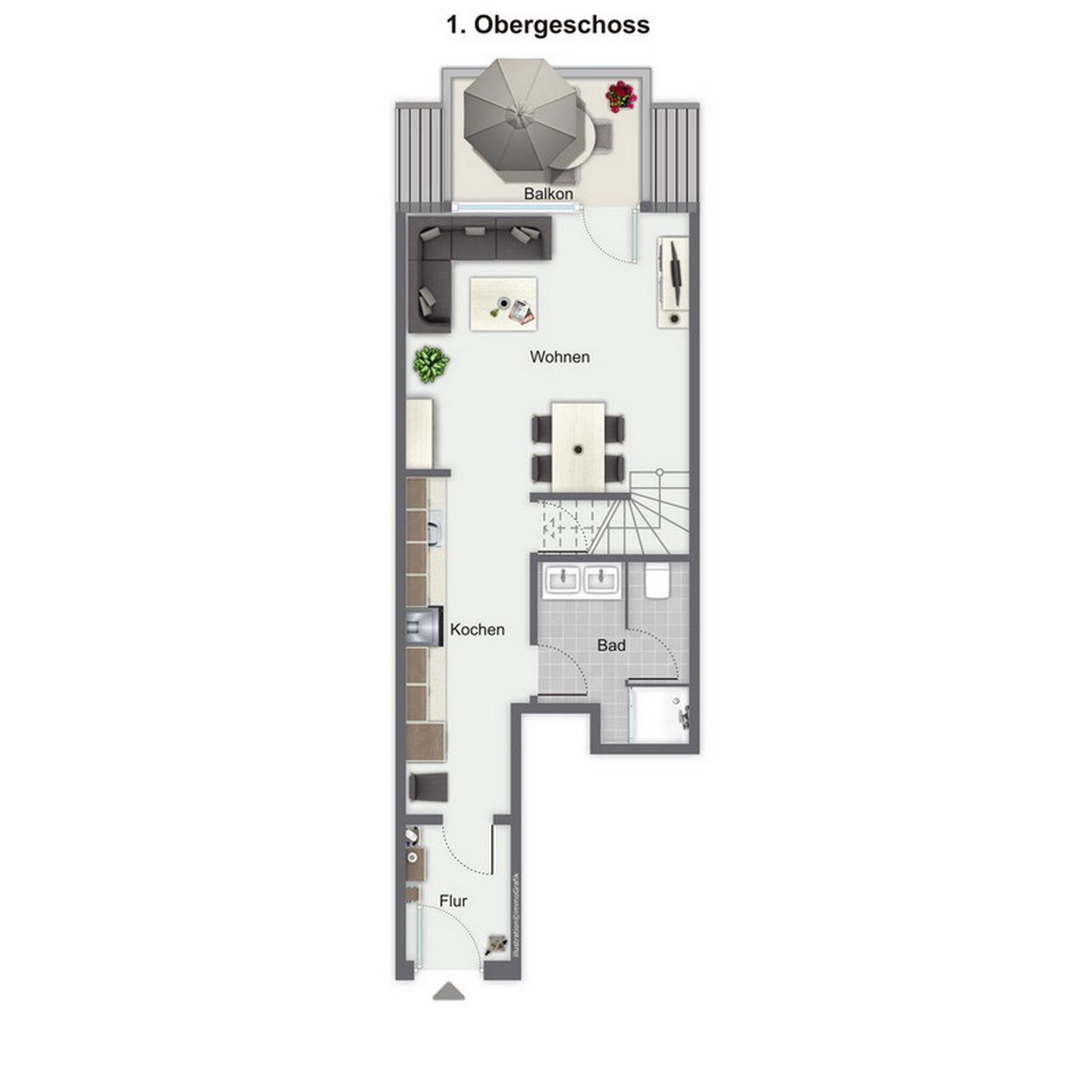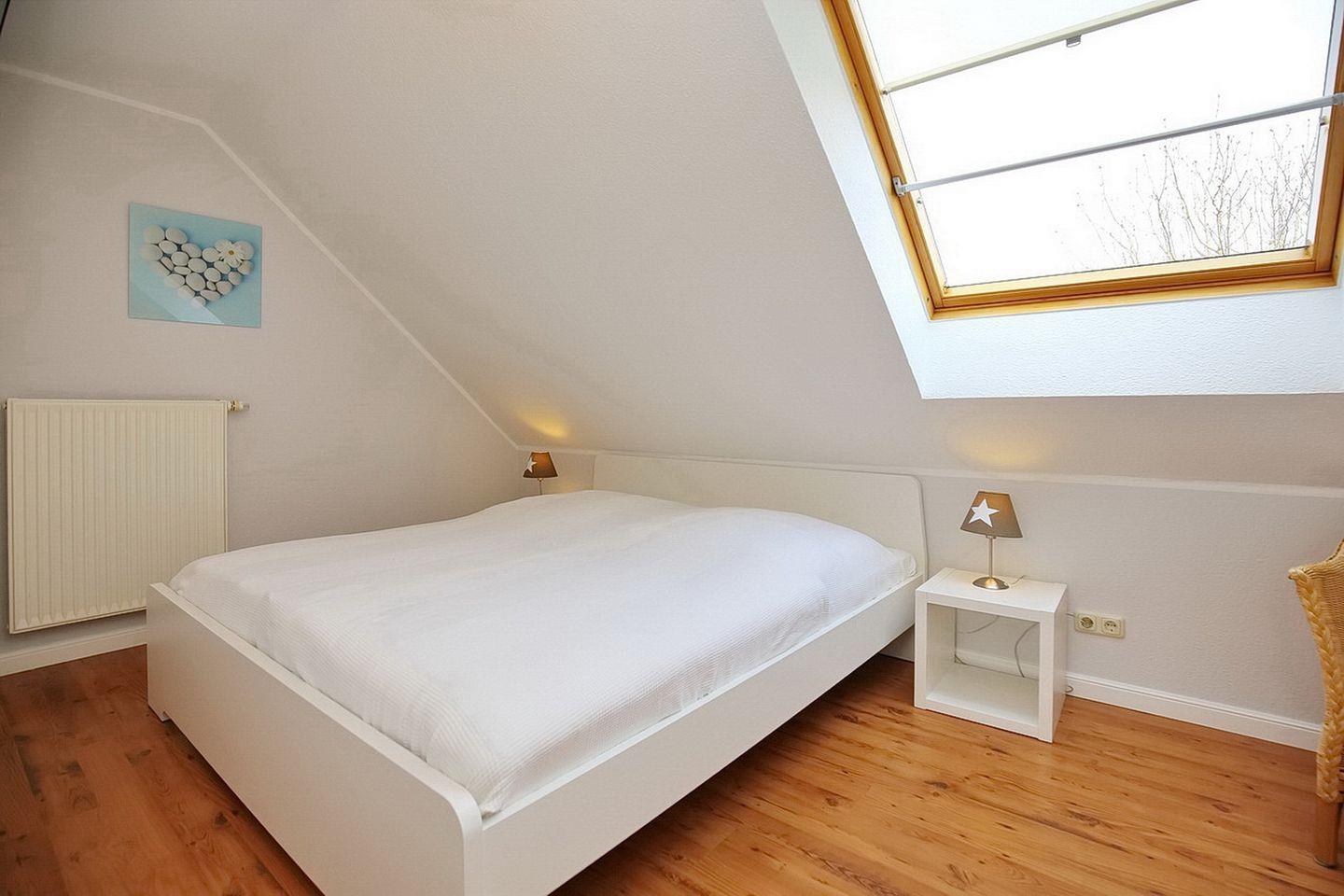 Über die innenliegende Treppe erreichst du das Dachgeschoss mit zwei Schlafräumen. Dort findest du jeweils ein Doppelbett (2 x 90 x 200 cm) und ein Kleiderschrank vor. An den Fenstern sind in allen Schlafbereichen Rollos angebracht.