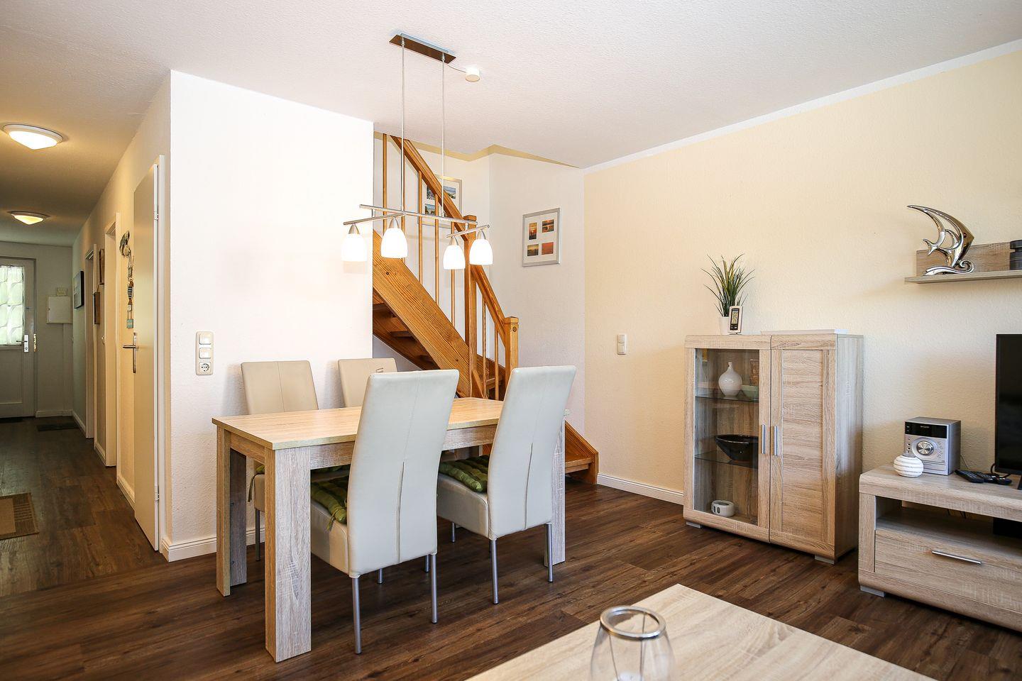 Die Küchenzeile ist mit einem Cerankochfeld mit Backofen, einem Geschirrspüler und einem Kühlschrank mit Gefrierfach ausgestattet. Als Bodenbelag wurde in der unteren Etage Design-Belag gewählt.