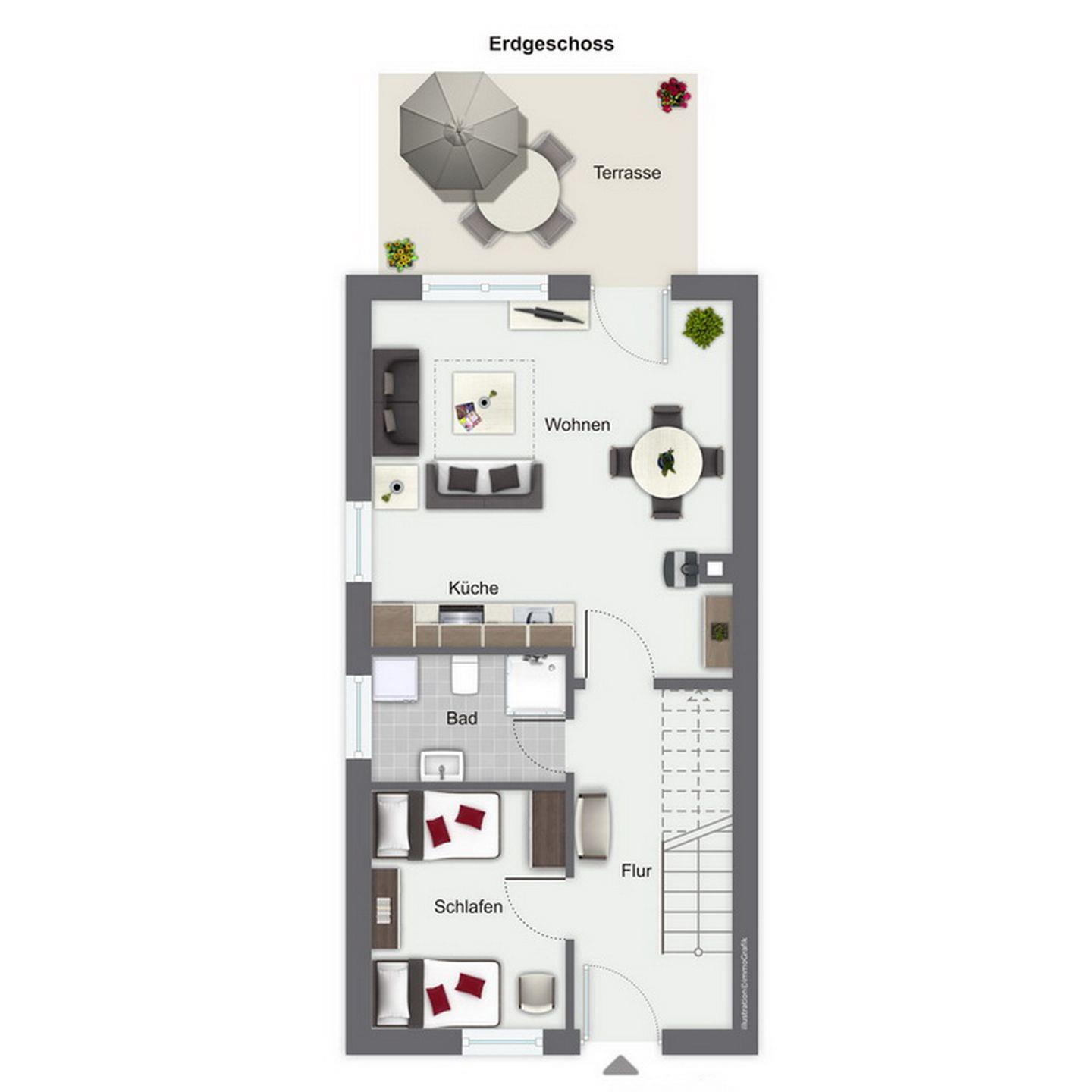 In diesem Ferienhaus erwarten dich auf ca. 63 m² und über 2 Etagen ausgestreckt ein Wohnzimmer mit Küchenzeile, 2 Schlafzimmer, 1 Duschbad und ein Gäste-WC. Die Terrasse ist süd-/westlich ausgerichtet. Die Strandentfernung beträgt ca. 350 Meter.