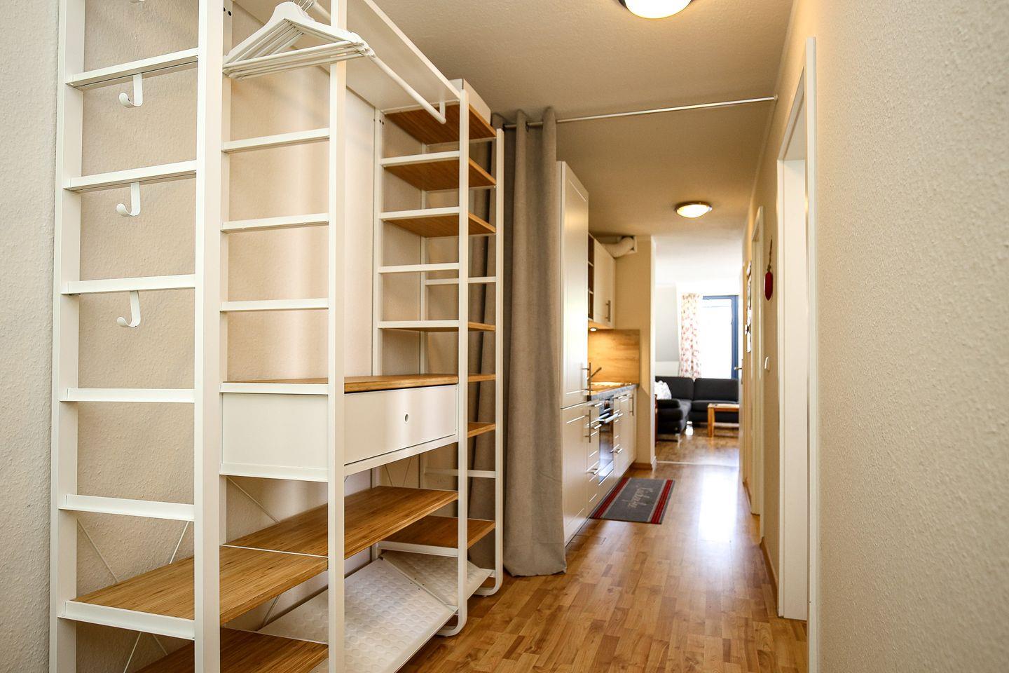 Die integrierte Küchenzeile verfügt über ein 4-Plattenkochfeld mit Backofen, einen Geschirrspüler und ein Kühlschrank mit Gefrierfach. Als Bodenbelag wurde in der gesamten Wohnung Laminat gewählt. Im Schlafzimmer im Untergeschoss ermöglichen zwei Einzelbetten (90 x 200 cm) einen ruhigen Schlaf. Mitgebrachte Garderobe kann in den Kleiderschränken im Schlafraum und im Eingangsbereich verstaut werden.