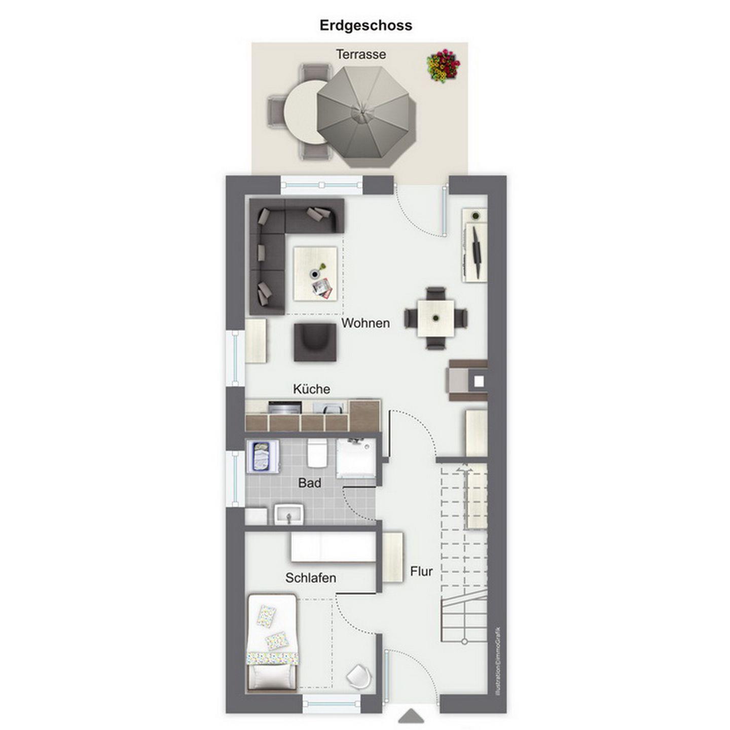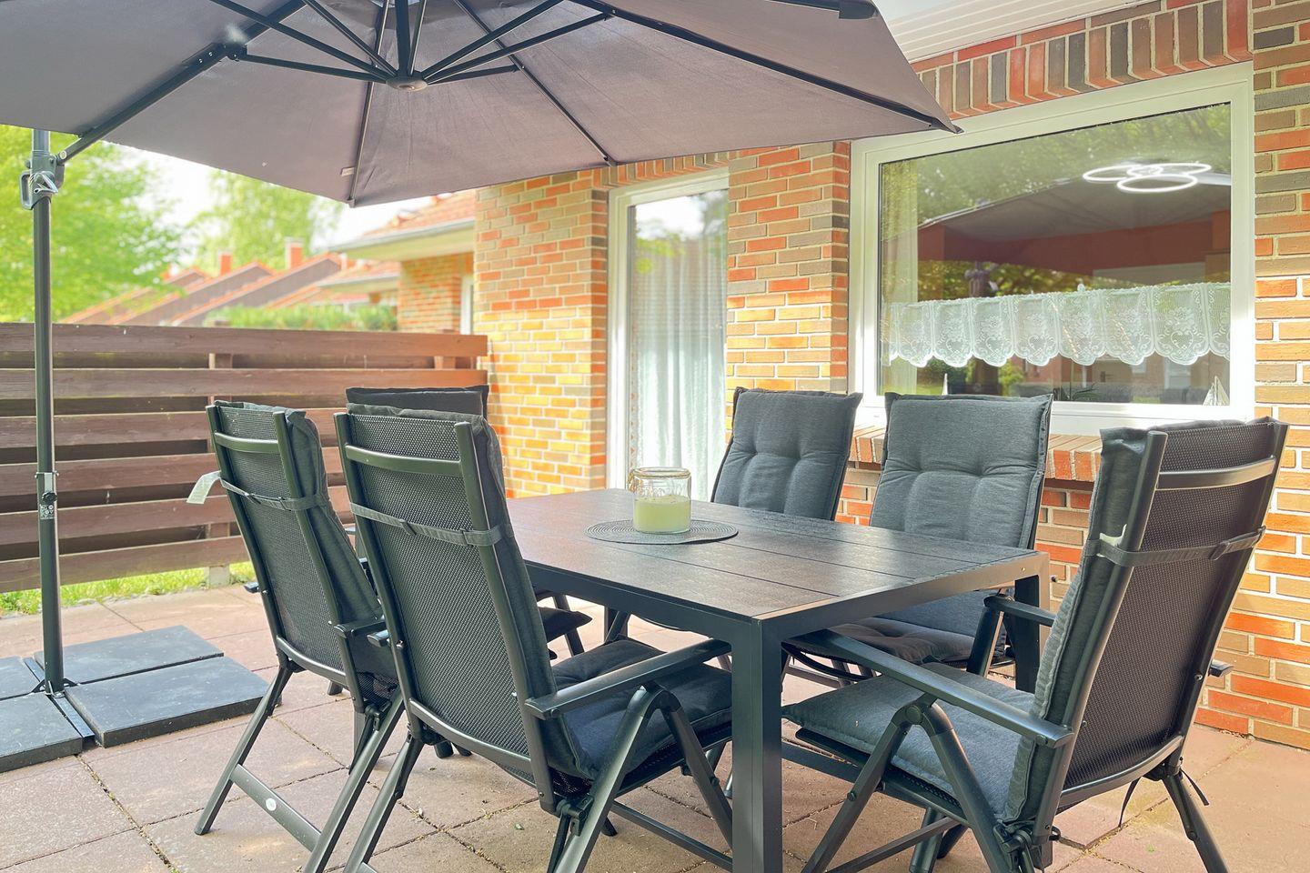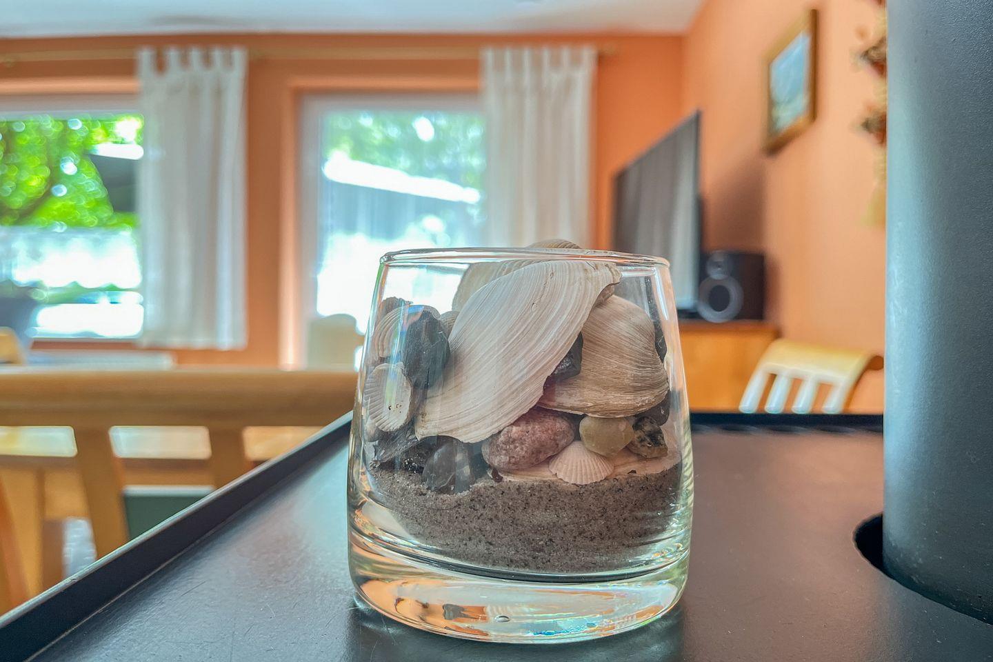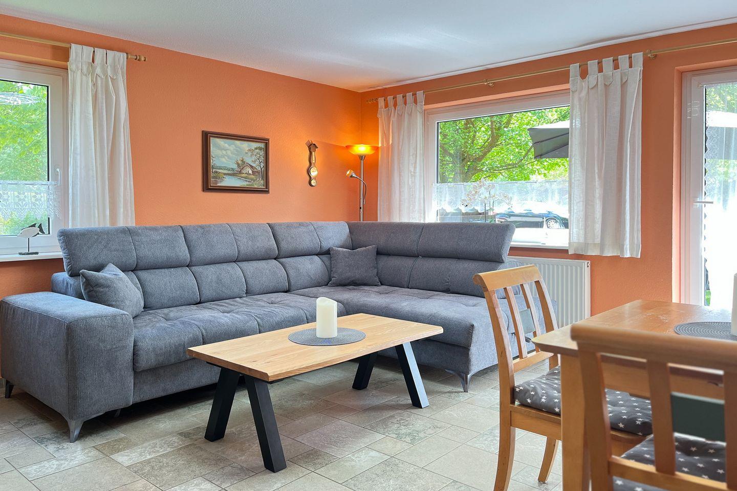 Für eine gemütliche Atmosphäre im ganzen Ferienhaus sorgen warme Farben und der eigene elegante Stil. Im Wohnzimmer gibt es für zwei Gäste eine ausziehbare Doppelschlafcouch (140 x 190 cm). Sollte das Wetter einmal weniger schön sein, wird es im Wohnzimmer durch den Kamin kuschelig warm. Des Weiteren gibt es zu deiner Unterhaltung einen Flachbildfernseher und eine Stereoanlage. Die möblierte Südterrasse ist vom Wohnzimmer aus betretbar. Hier findest du an sonnigen Tagen Ruhe und Entspannung.