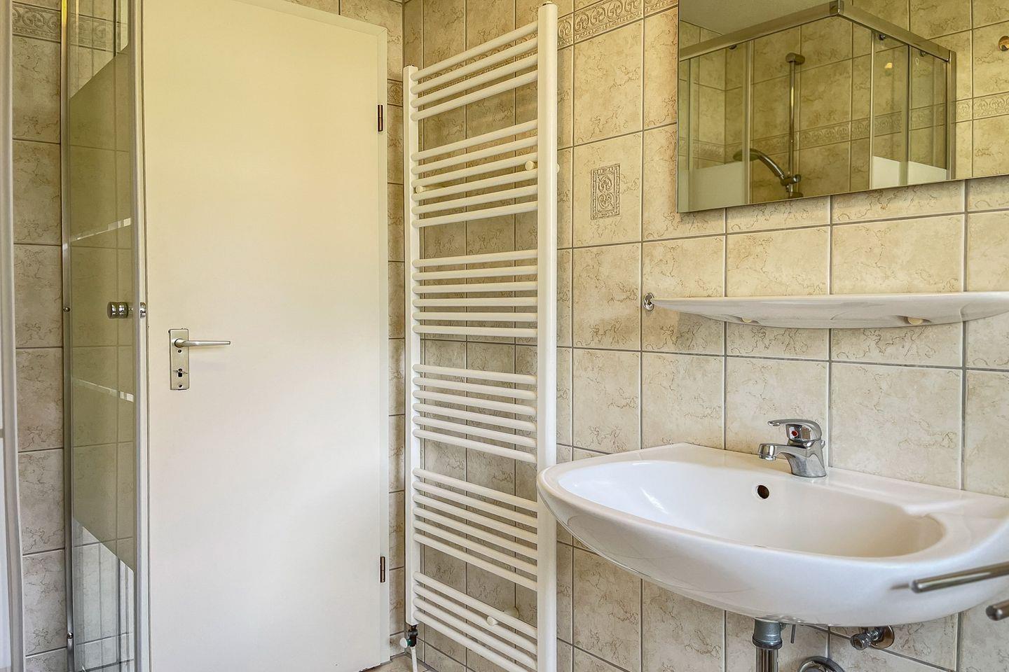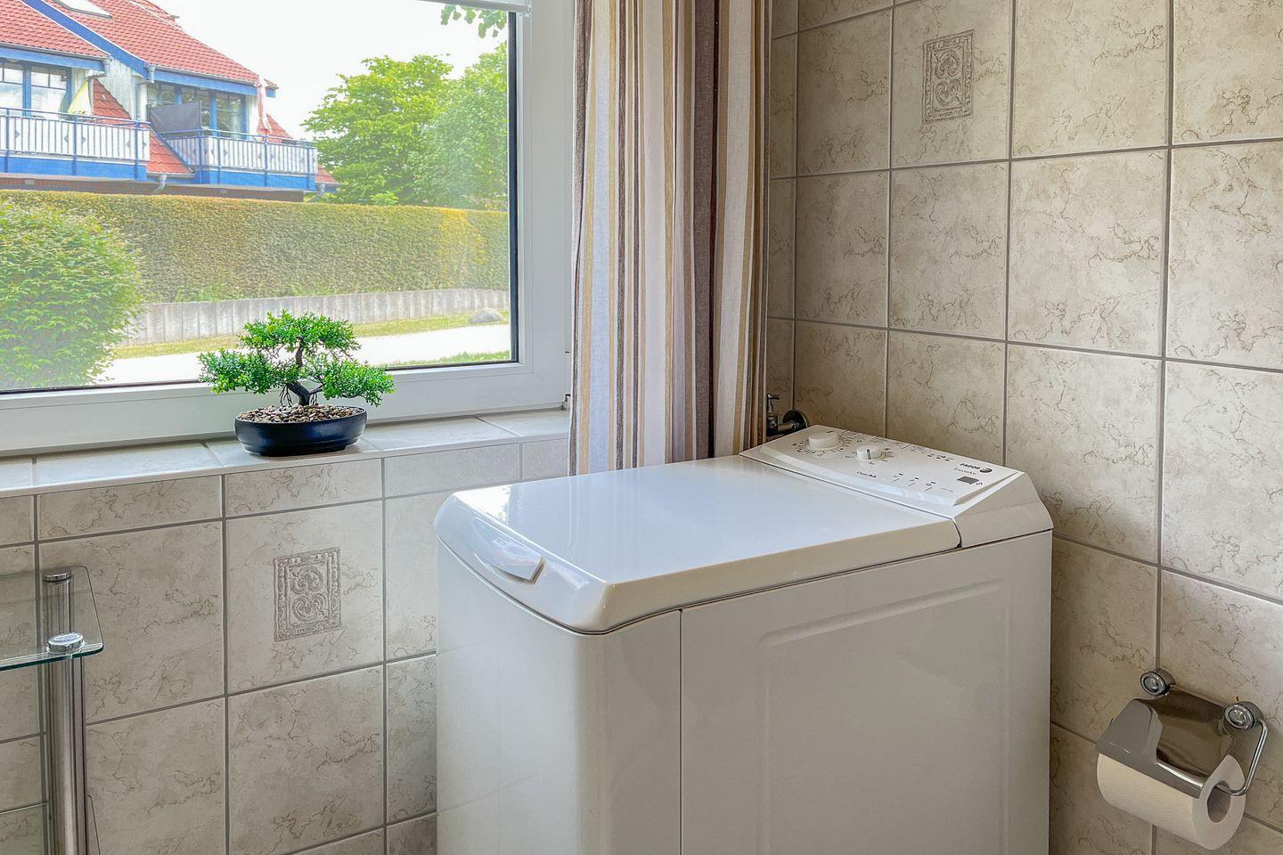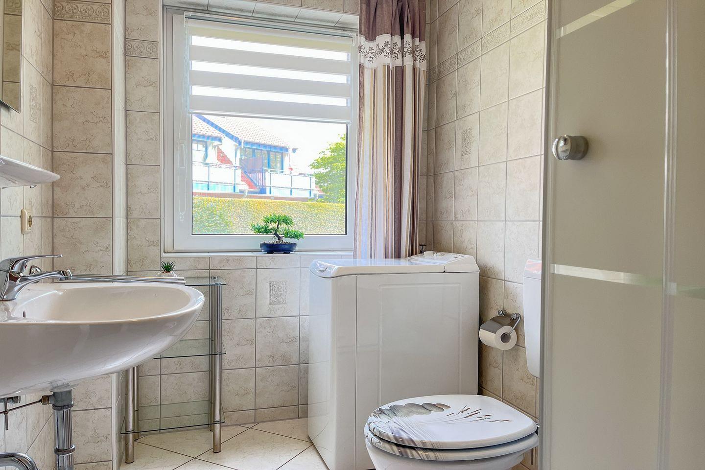 Das Duschbad ist hell gefliest und bietet eine Waschmaschine.