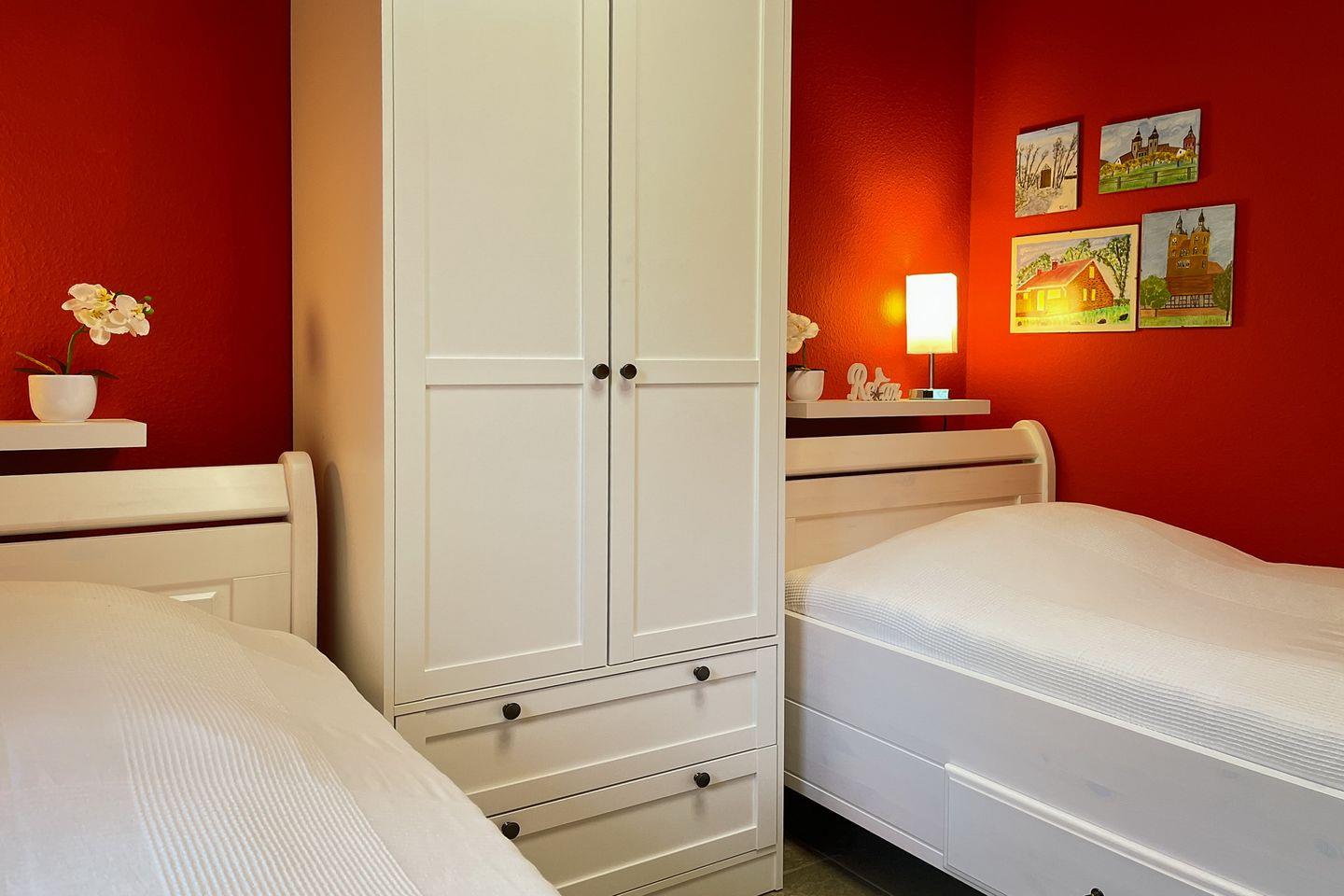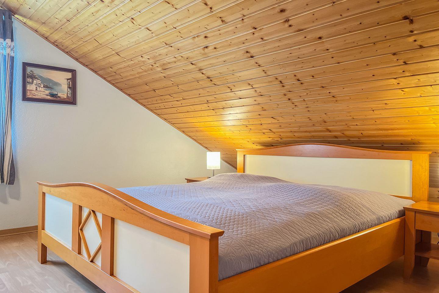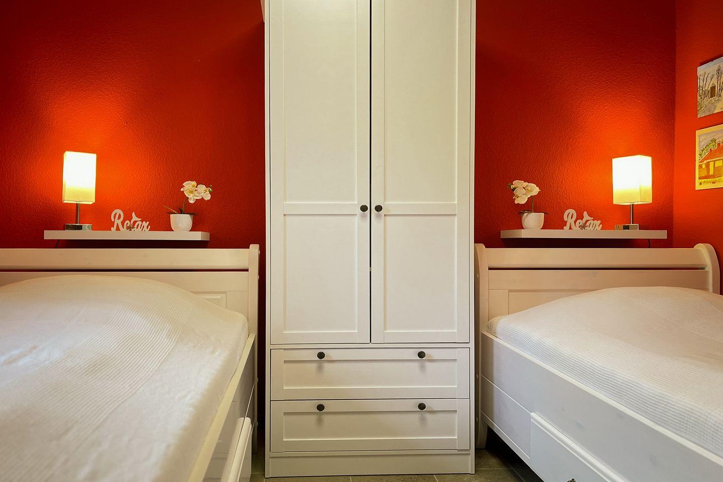 Als Schlafgelegenheit stehen dir in dem Schlafzimmer im Obergeschoss des Ferienhauses ein Doppelbett (2 x 90 x 200 cm) sowie ein großer Kleiderschrank für deine Urlaubsgarderobe zur Verfügung. Im Erdgeschoss findest du ein weiteres Schlafzimmer mit einer Schlafcouch.