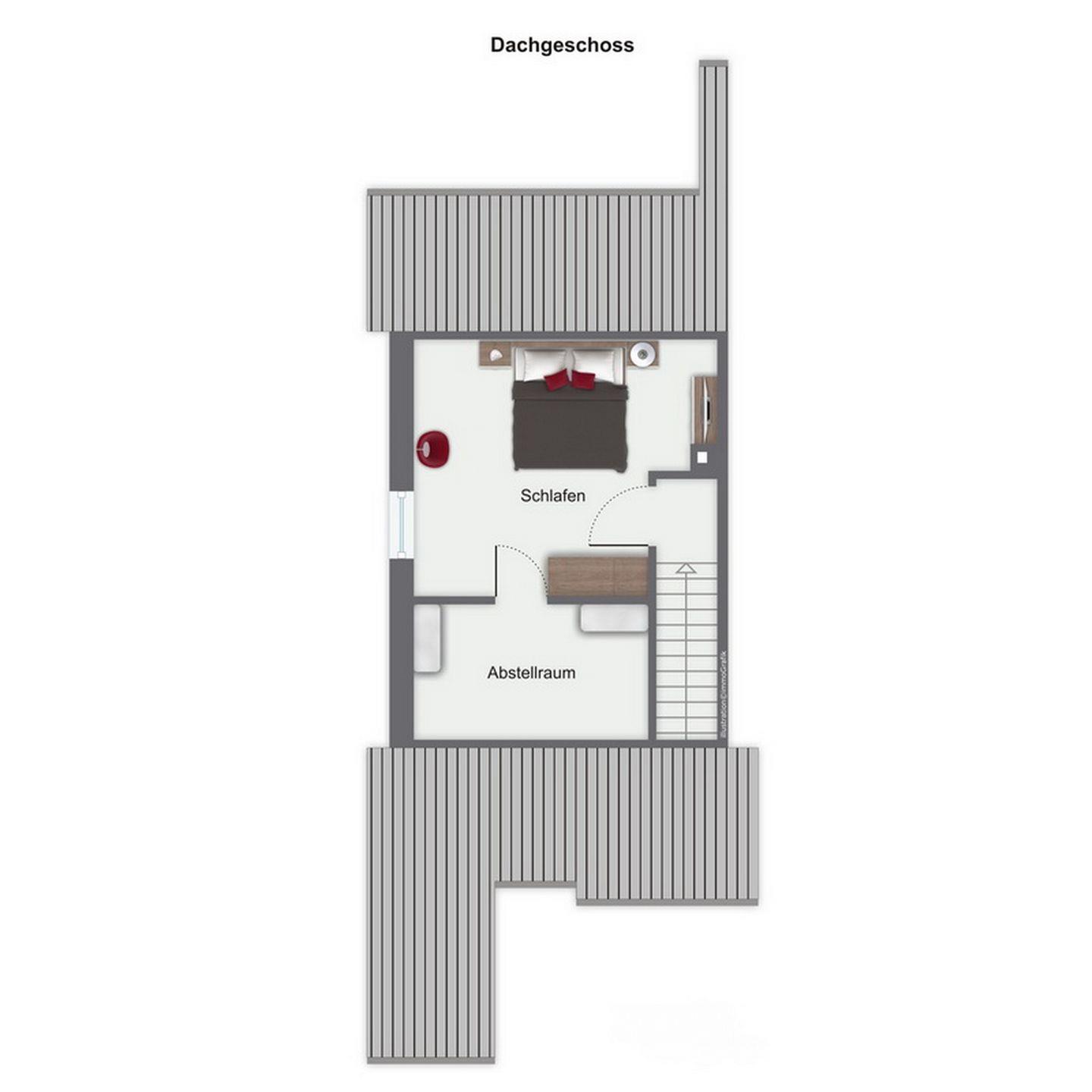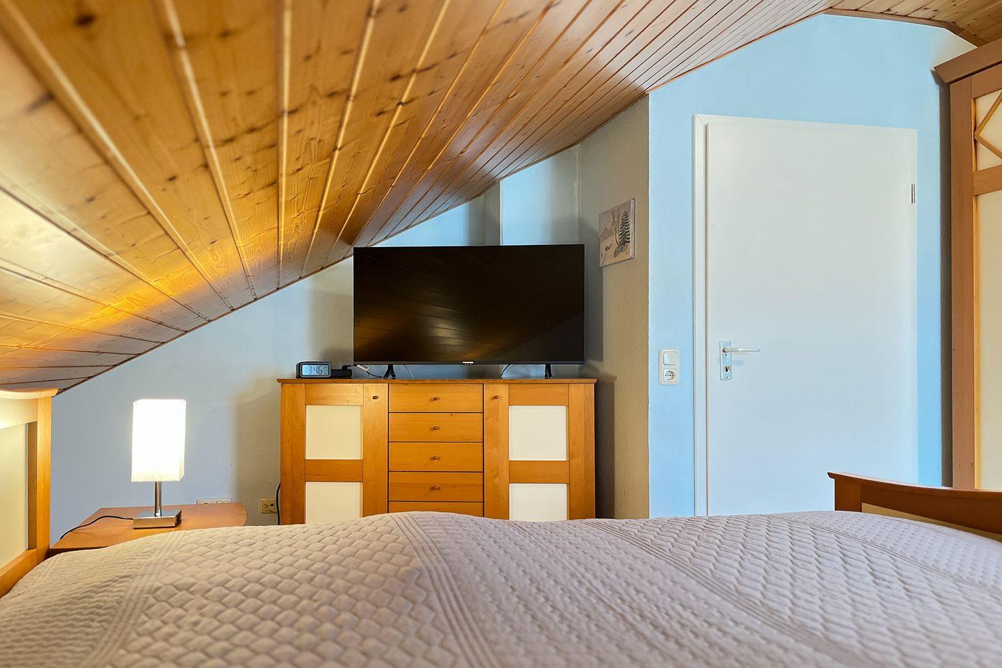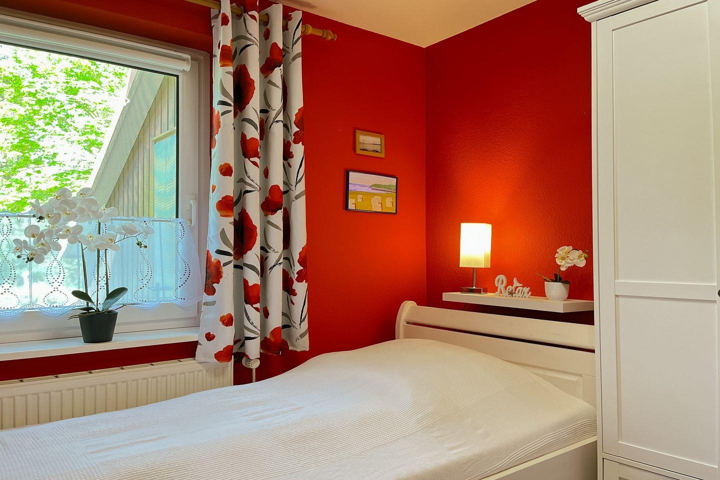 Als Schlafgelegenheit stehen dir in dem Schlafzimmer im Obergeschoss des Ferienhauses ein Doppelbett (2 x 90 x 200 cm) sowie ein großer Kleiderschrank für deine Urlaubsgarderobe zur Verfügung. Im Erdgeschoss findest du ein weiteres Schlafzimmer mit einer Schlafcouch.