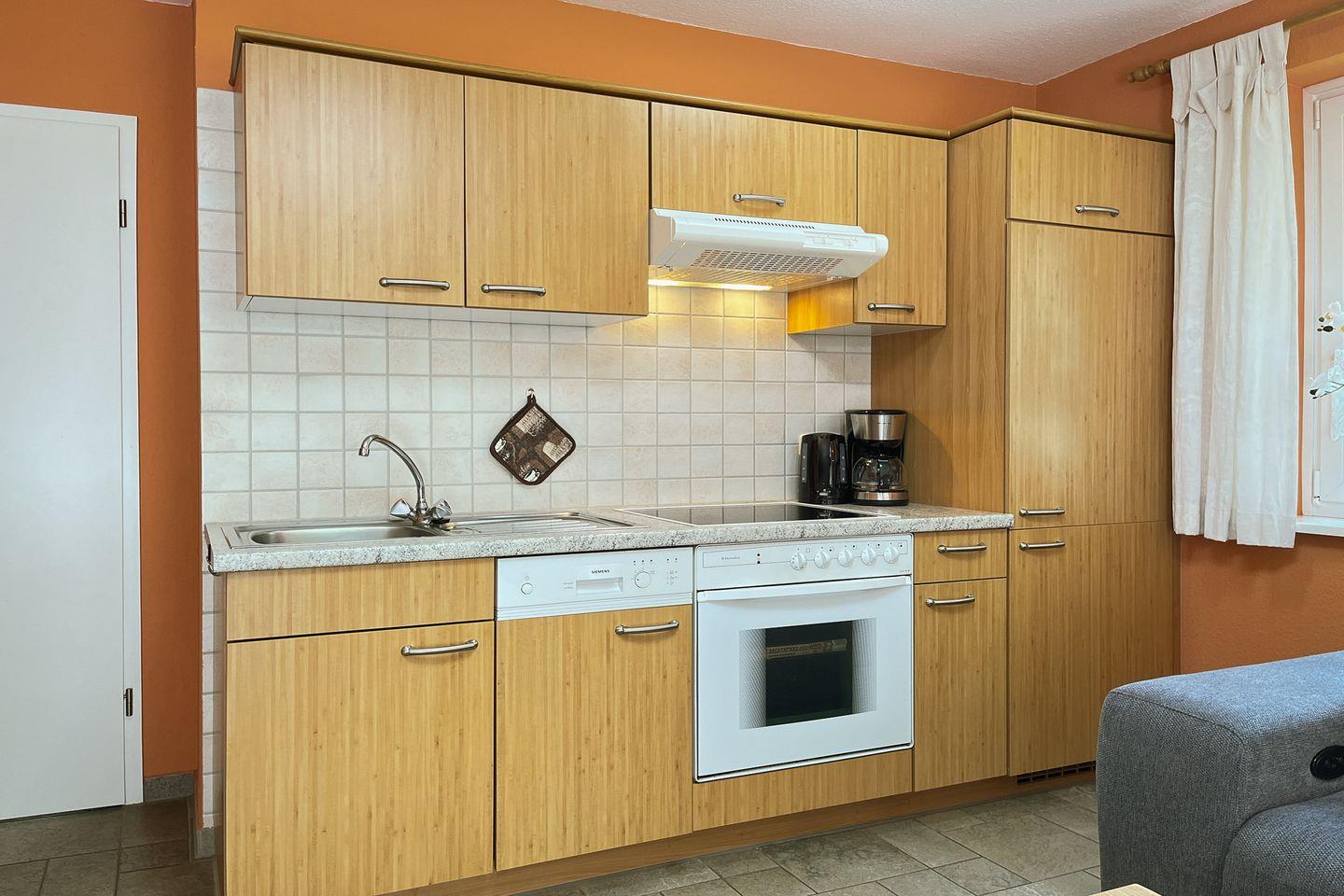 In den Wohnbereich ist die Küchenzeile integriert, die keine Wünsche offen lässt. Ob Mikrowelle, Geschirrspüler, Kühlschrank mit Gefrierfach, 4-Platten-Cerankochfeld und natürlich den Backofen: hier findest du alles, was du zum Kochen und Schlemmen benötigst. Der gemütliche Essplatz befindet sich in unmittelbarer Nähe der Küchenzeile.