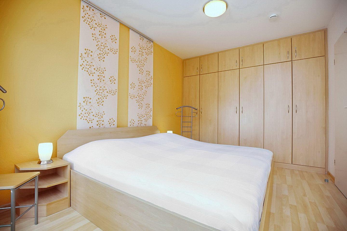 Das Schlafzimmer ist mit einem Doppelbett (2 x 90 x 200 cm) und einem großen, 3-türigen Kleiderschrank eingerichtet. Die gesamte Wohnung ist mit Fliesen ausgelegt. Im Schlafzimmer befindet sich Laminat. Im Wohnbereich hängen Jalousien und im Schlafzimmer befinden sich Plissees und Vorhänge.