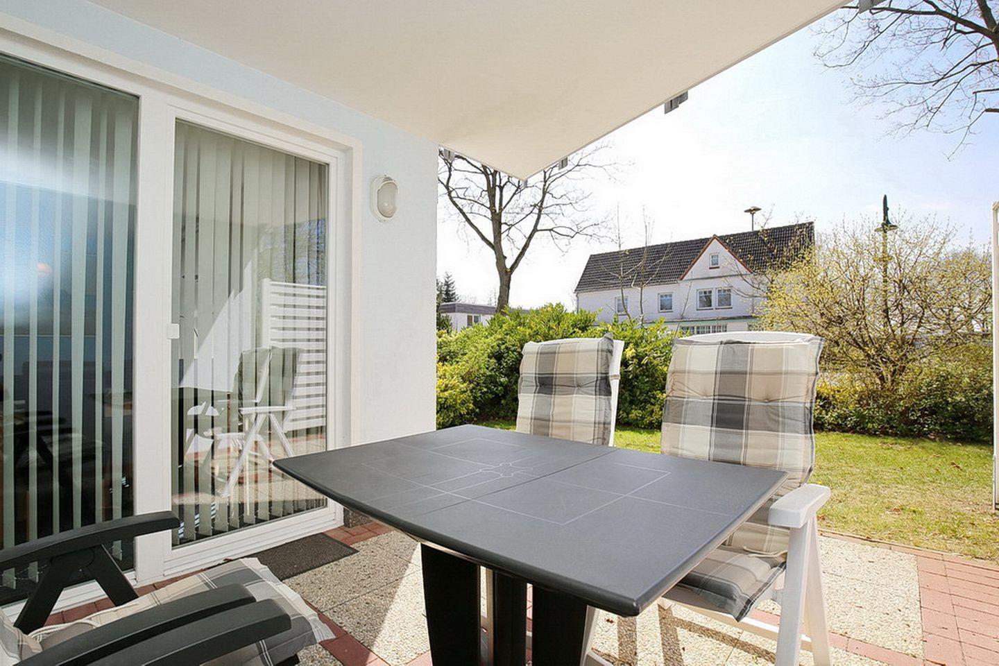 Die ca. 48 m² große Ferienwohnung liegt im Erdgeschoss und hat eine Terrasse in Südlage. Weiterhin verfügst du über ein Wohnzimmer mit Küchenzeile, ein Schlafzimmer und ein Duschbad. Zum Strand sind es nur 70 Meter.