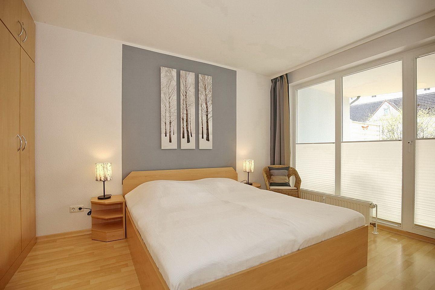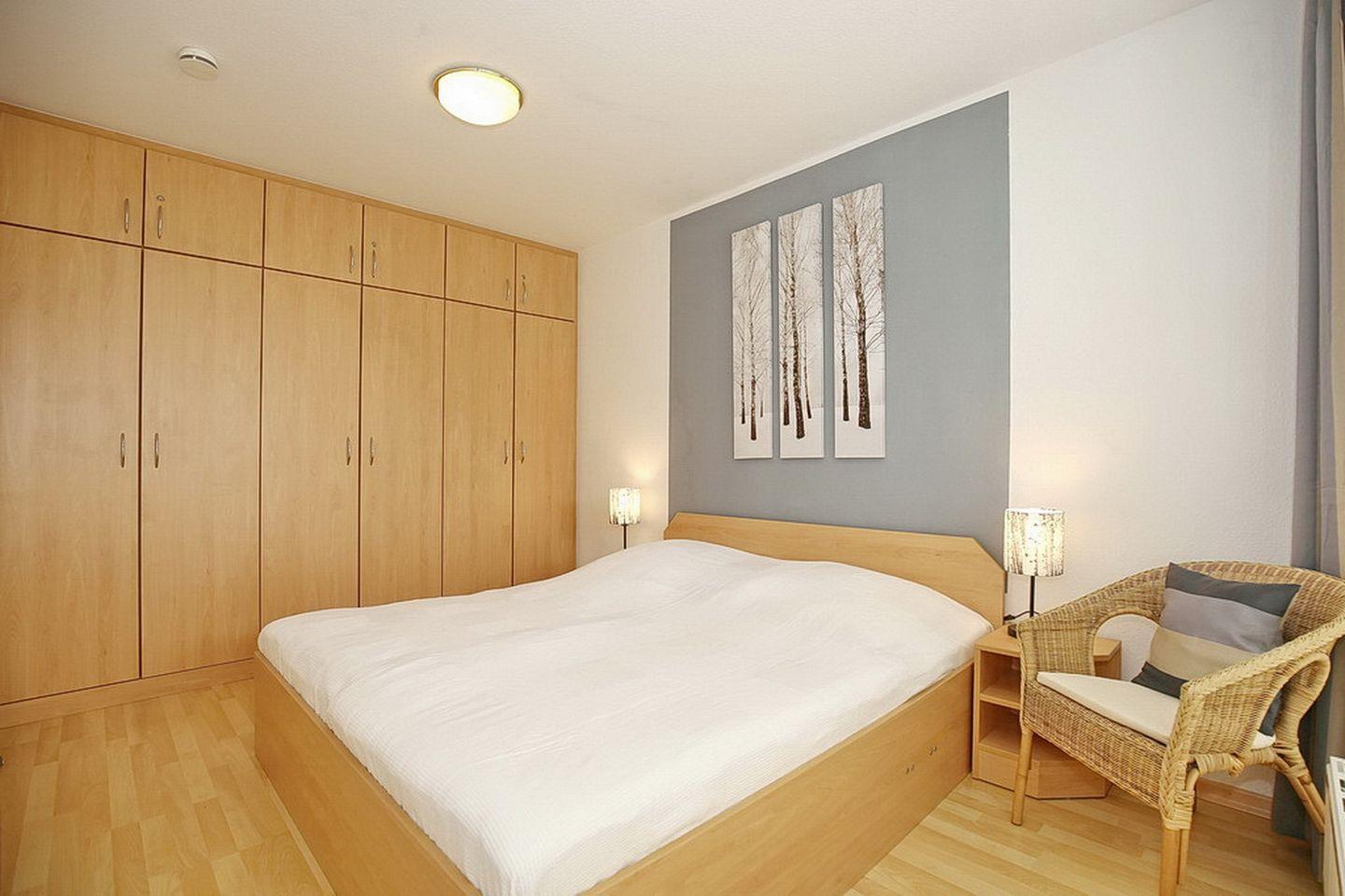 Das gemütliche Doppelbett (2 x 90 x 200 cm) im Schlafzimmer verspricht erholsamen Schlaf. Ein geräumiger Kleiderschrank für deine Urlaubsgarderobe ist natürlich auch vorhanden. Auch hier ist der Boden mit Laminat bedeckt. An den Fenstern sorgen helle Plissees für Privatsphäre und ein Verdunklungsvorhang für ungestörte Nachtruhe.