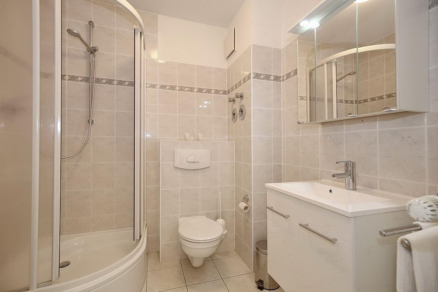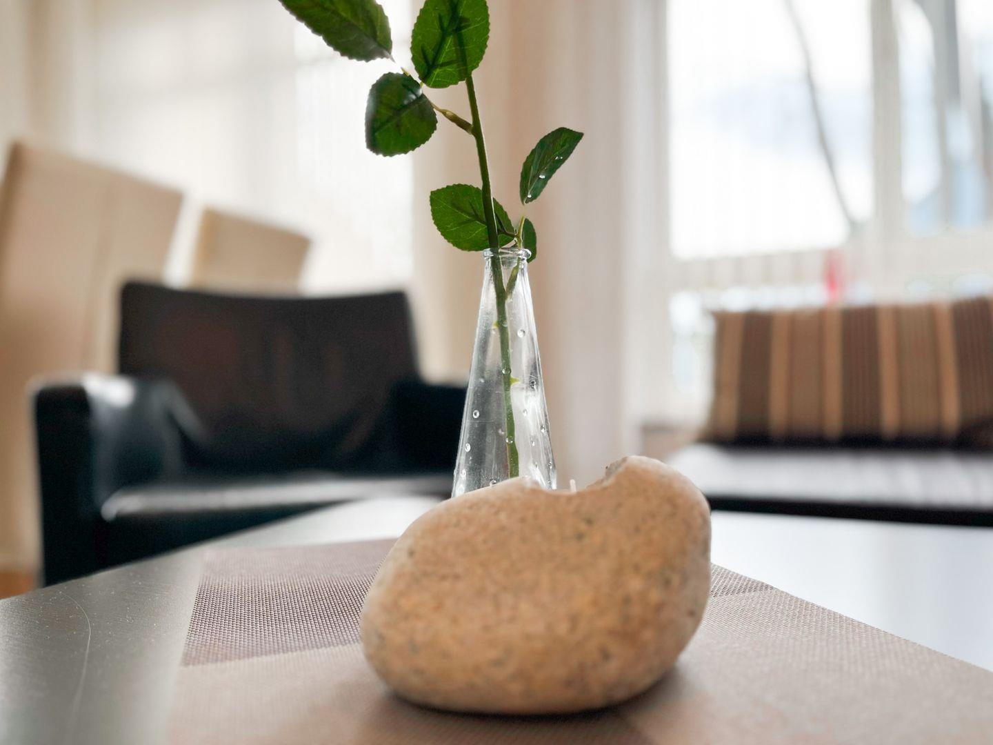 Die Küchenzeile ist voll ausgestattet mit Kühlschrank, Gefrierfach, Geschirrspüler, einem 4-Platten-Cerankochfeld mit Backofen, Mikrowelle und vielem mehr. Am gemütlichen Esstisch finden 4 Personen Platz. Für die kleinen Gäste stehen ein Kinderreisebett (ohne separate Matratze und ohne Bettzeug) und ein Kinderhochstuhl zur Verfügung. Ein gefliestes Duschbad/WC ist selbstverständlich auch vorhanden. In dieser Nichtraucherwohnung sind maximal zwei Haustiere erlaubt.