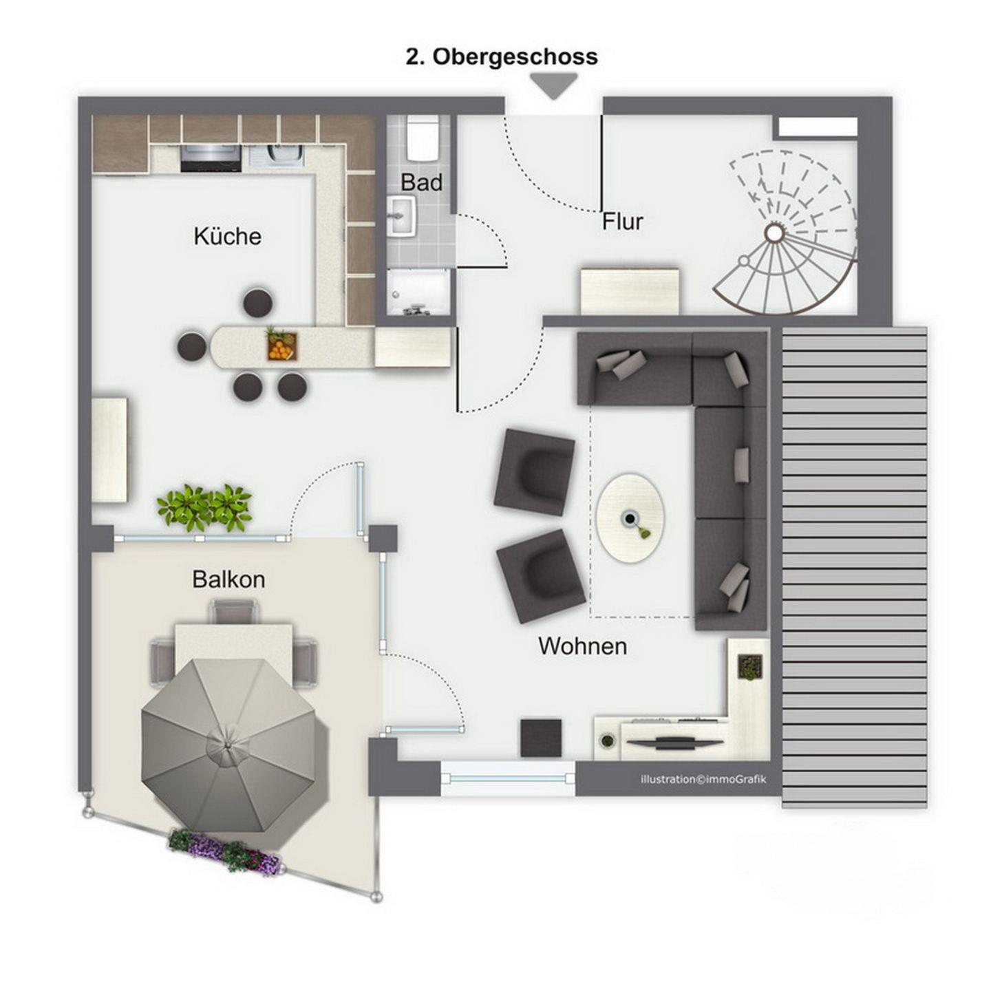 Auf jeder Etage ist ein überdachter Balkon zur Südseite. Hier kannst du die Sonne bis zum Untergang genießen.