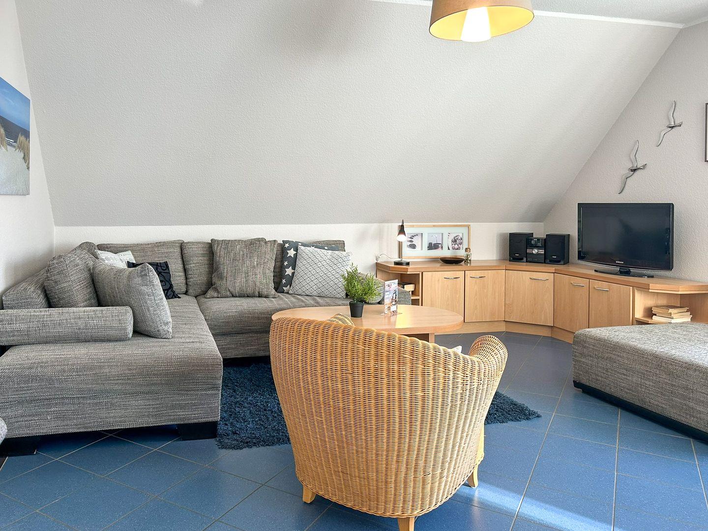 Dein gemütlicher, gefliester Wohnbereich mit großzügiger Sitzecke ist ausgestattet mit einer Schlafcouch (130 x 210 cm) und einem TV-Flatscreen.