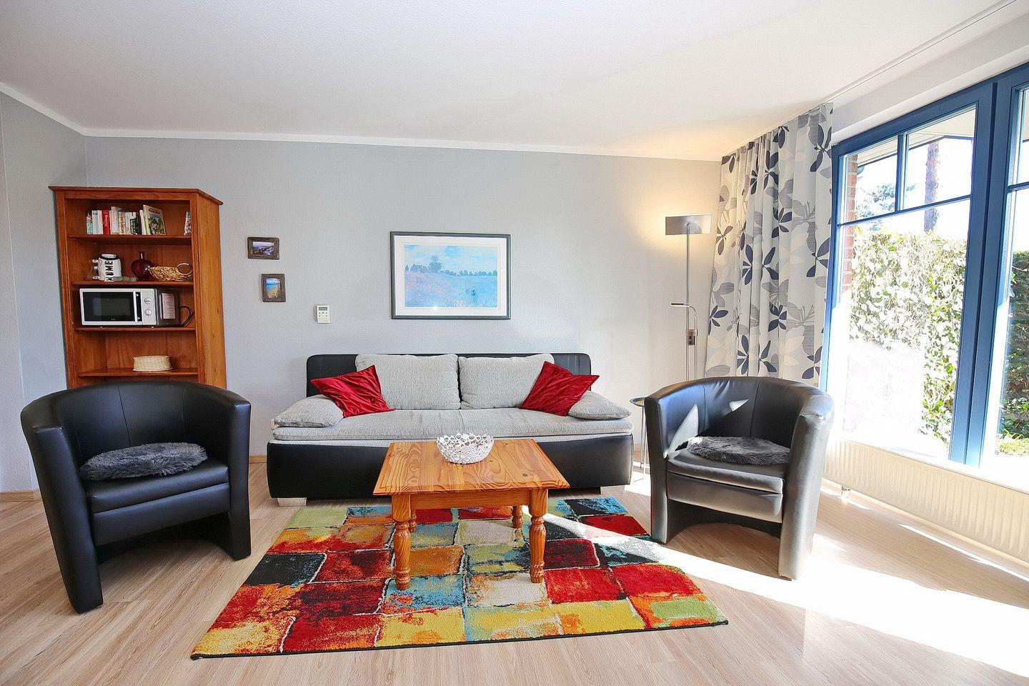 Am Ende des Hauses 18 erwartet dich ein behagliches Urlaubsquartier. Das ca. 55 m² große 2-Zi.-Appartement mit Terrasse in Süd-Ost Lage hat einen Wohn-und Essbereich, eine Küchenzeile, ein Schlafzimmer und ein Duschbad. Die Strandentfernung beträgt von der Ferienanlage Papillon nur ca. 250 m.