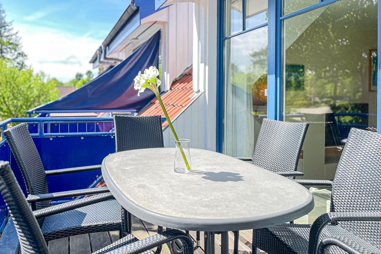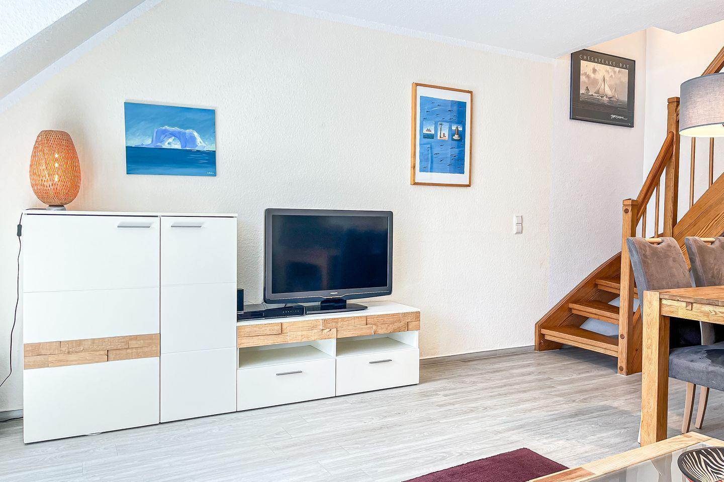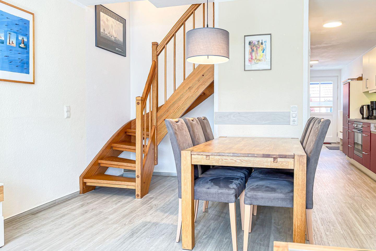 Deine Ferienwohnung "Kairos", ein 4-Zimmer-Apartment, ist in warmen Farben eingerichtet. Sie liegt im 1. OG des Hauses 18, 68 m². Wohnfläche verteilen sich auf zwei Etagen: Wohn- und Essbereich, Küchenzeile, Duschbad und drei Schlafzimmer. Der Balkon ist nach Süd-Ost ausgerichtet. Zum Strand sind es etwa 250 Meter.