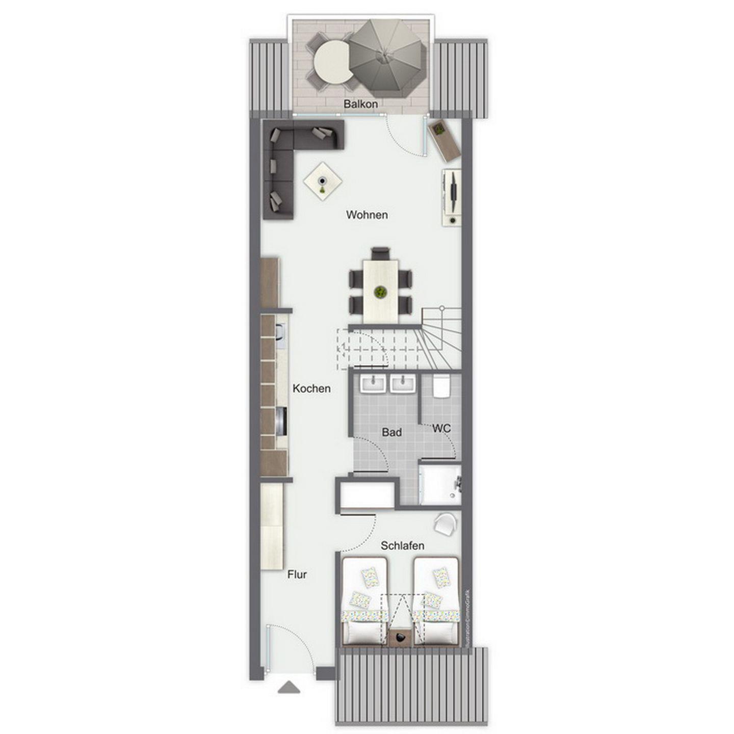 Auf der unteren Ebene befindet sich ein Schlafzimmer mit zwei Einzelbetten (90 x 200 cm) und einem Kleiderschrank. Über eine innenliegende Treppe erreichst du die beiden oberen Schlafräume mit jeweils einem Doppelbett (2 x 80 x 200 cm und 2 x 90 x 200 cm) und einem Kleiderschrank. Die Zimmer ermöglichen Rückzug und Ruhephasen auch tagsüber. In allen Schlafzimmern liegt Teppichboden. Die Fenster können mit Rollos verdunkelt werden.