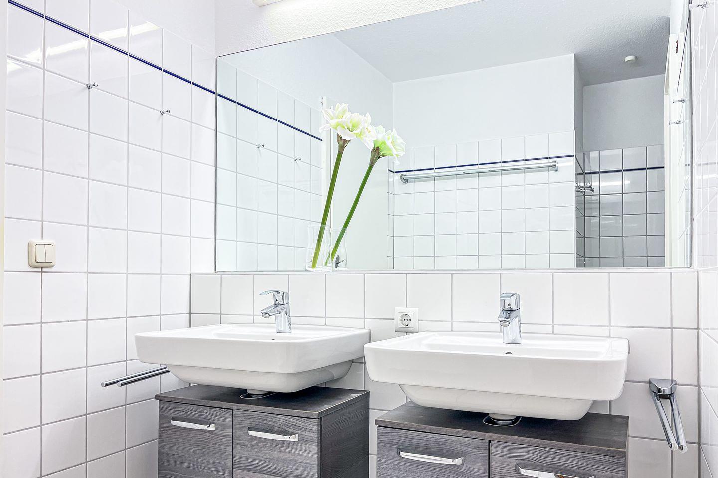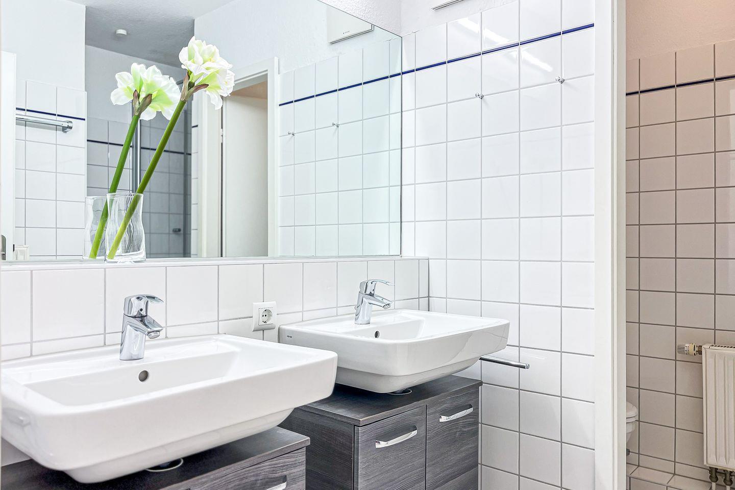 Im Duschbad gibt es zwei Waschbecken mit Unterschränken, das WC ist separat.