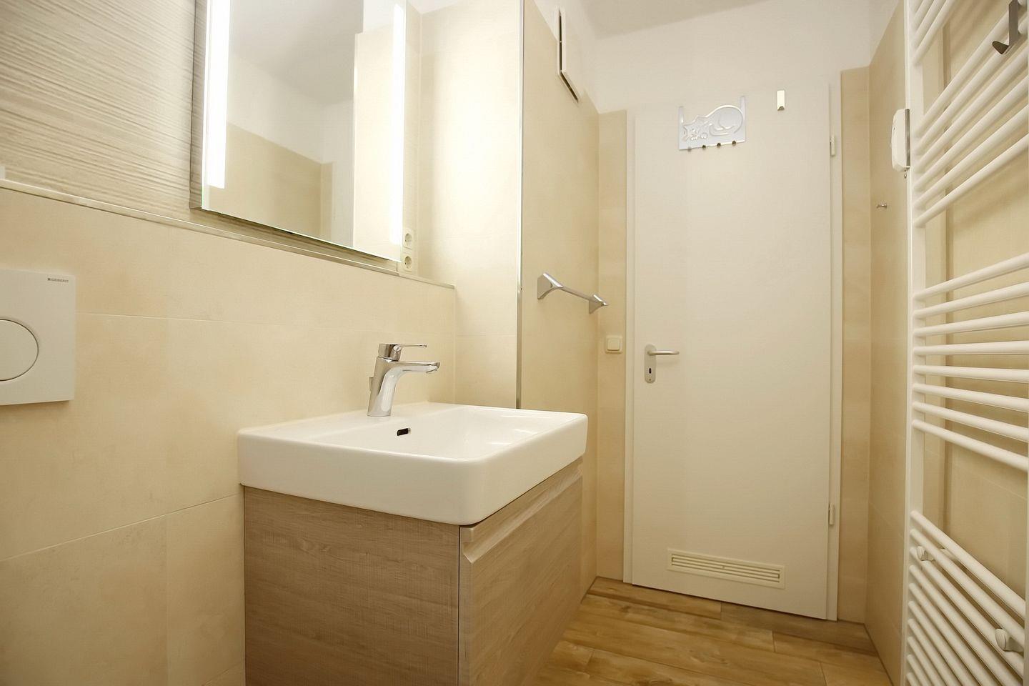 Das hell geflieste Duschbad bietet einen Waschtisch, eine Dusche und ein WC. In dieser Nichtraucherwohnung sind Haustiere nicht erlaubt. Ein Freistellplatz sorgt für die sichere Unterbringung deines Autos.