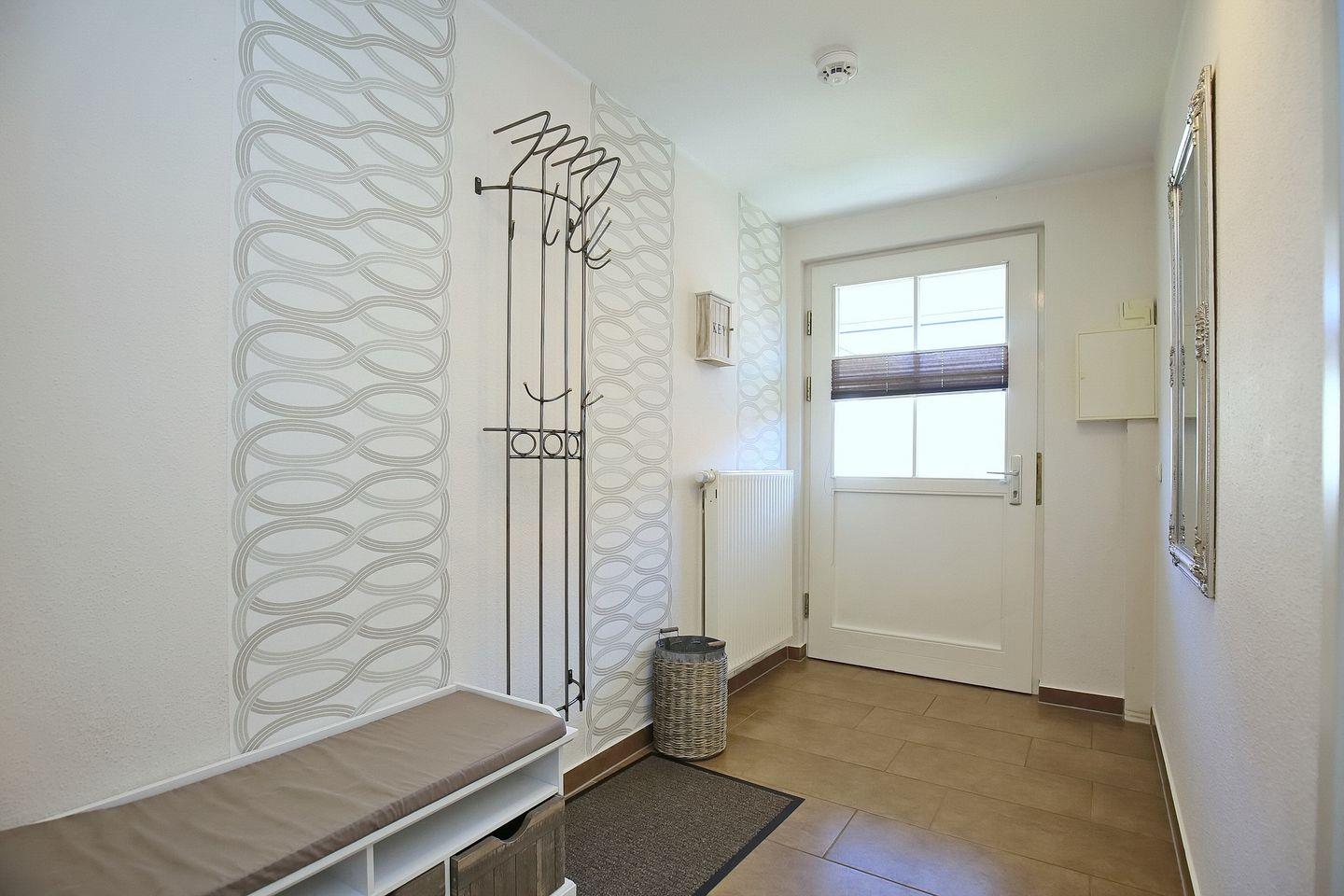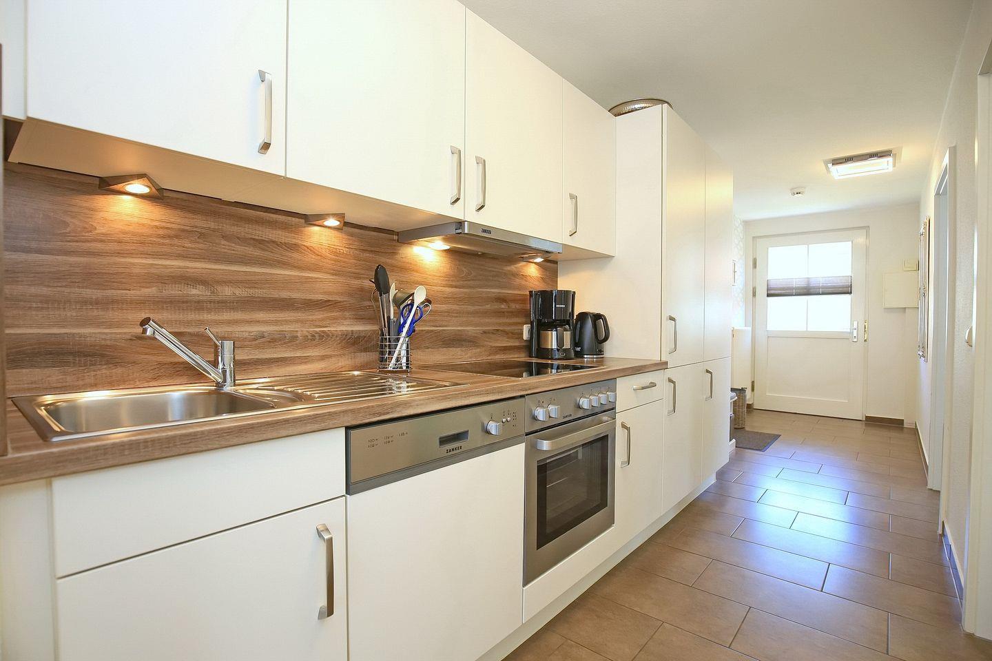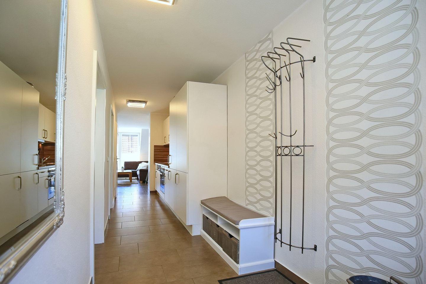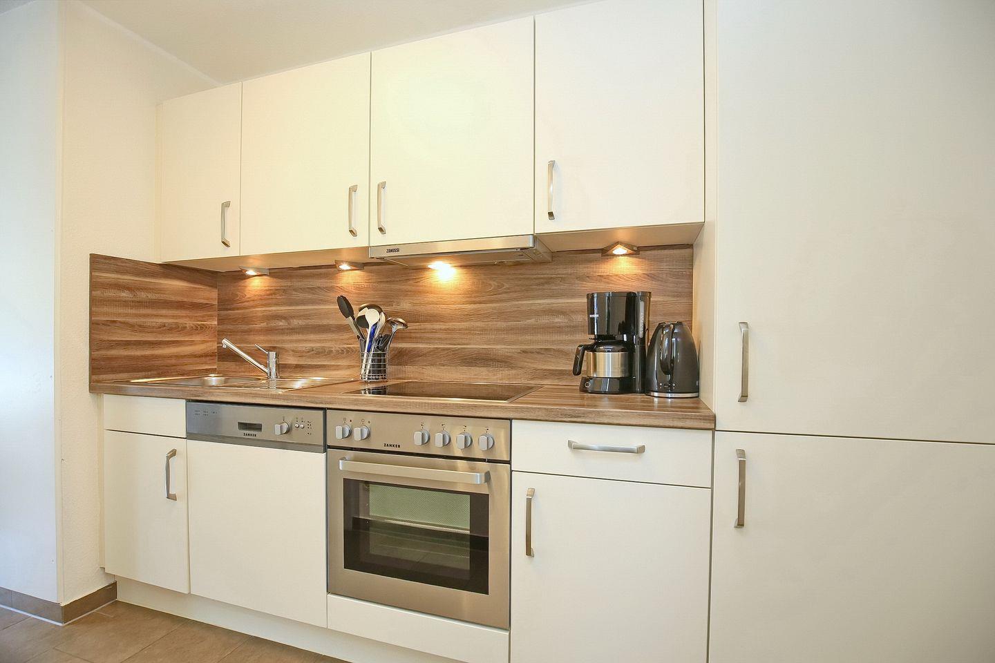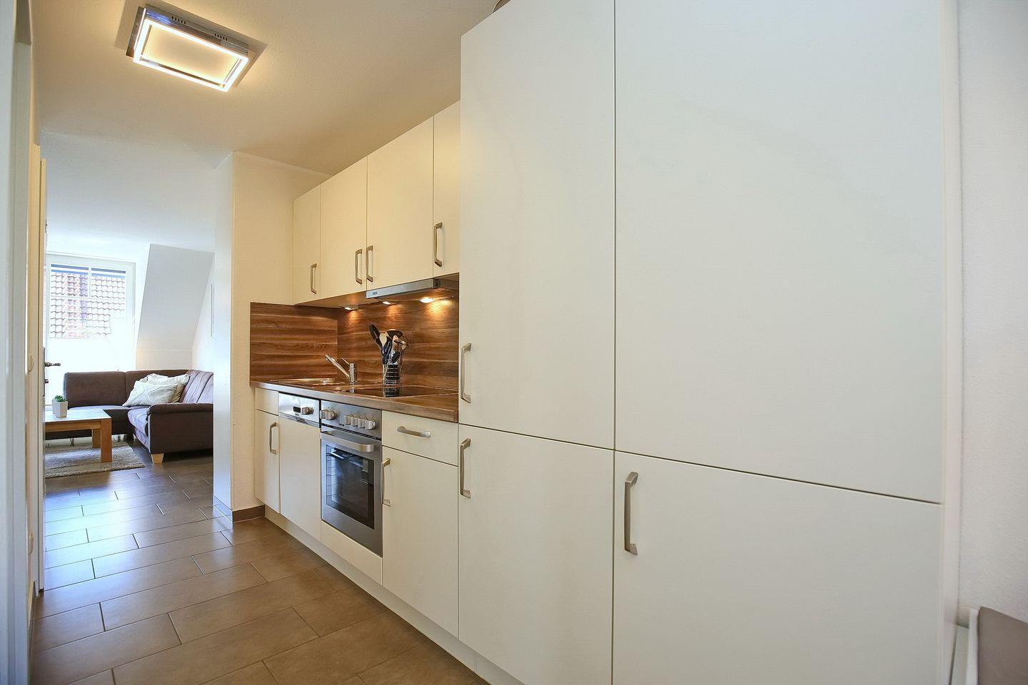 Die integrierte Küchenzeile ist vollständig ausgestattet mit Geschirrspüler, 4-Platten-Cerankochfeld, Backofen und Kühlschrank mit Gefrierfach. Im gesamten Wohn- und Eingangsbereich wurde als Bodenbelag Fliese gewählt.