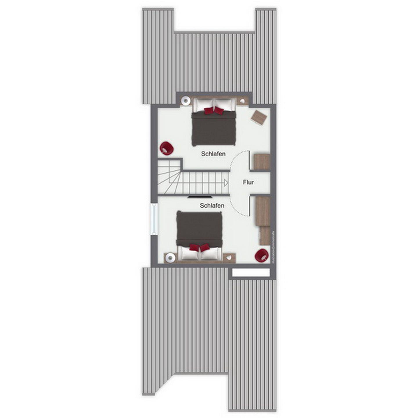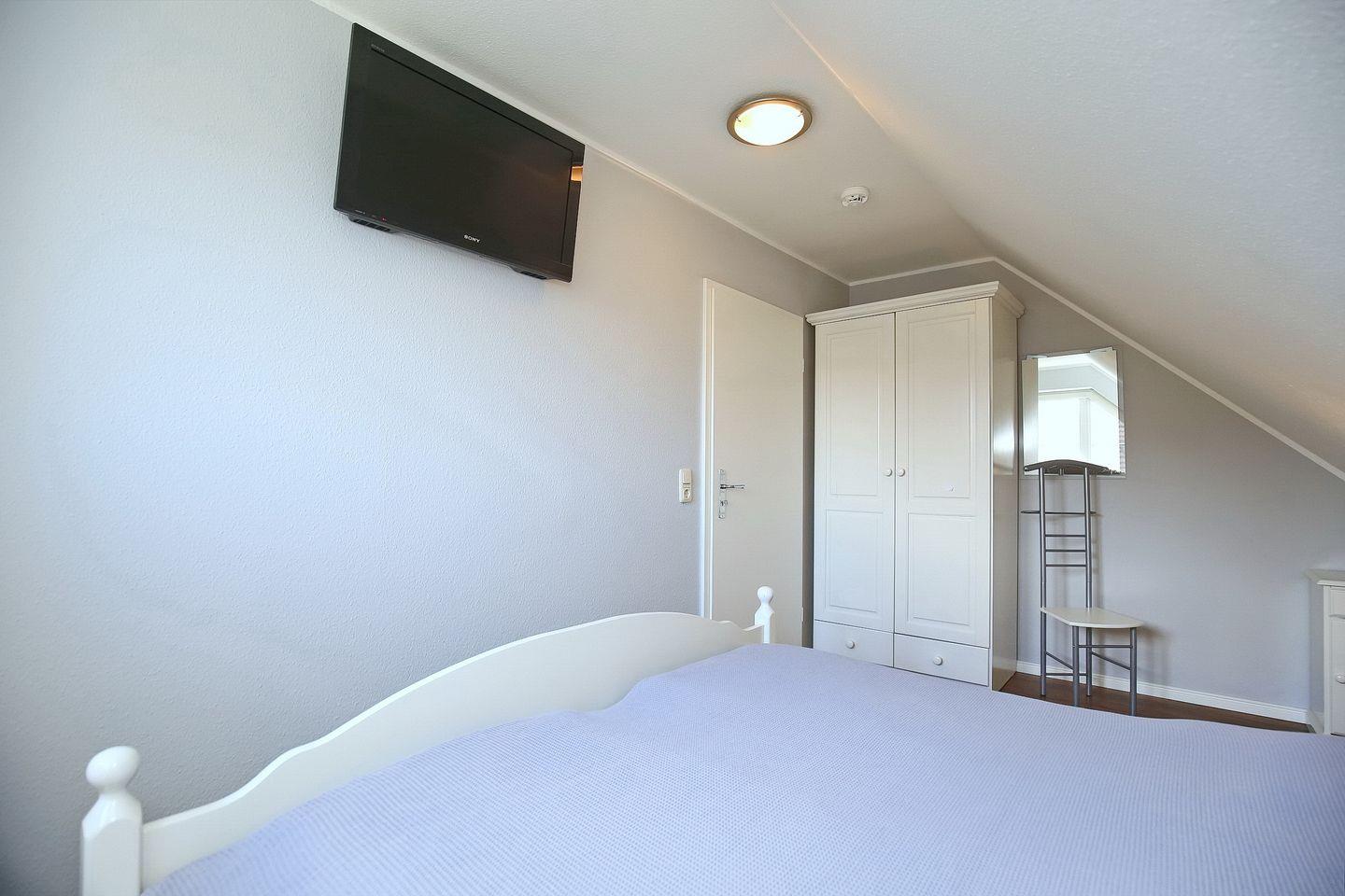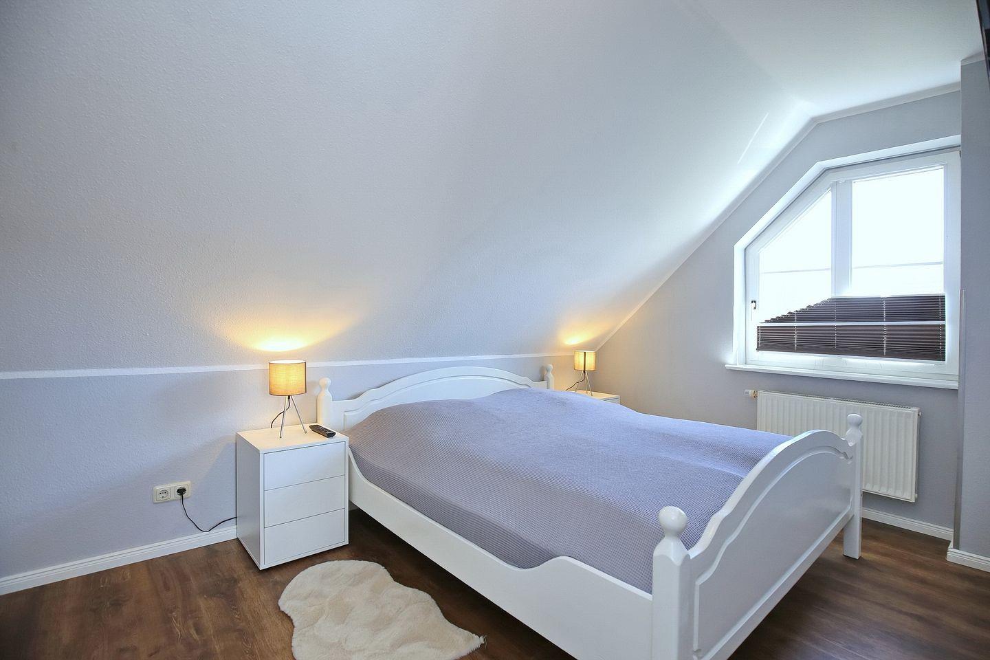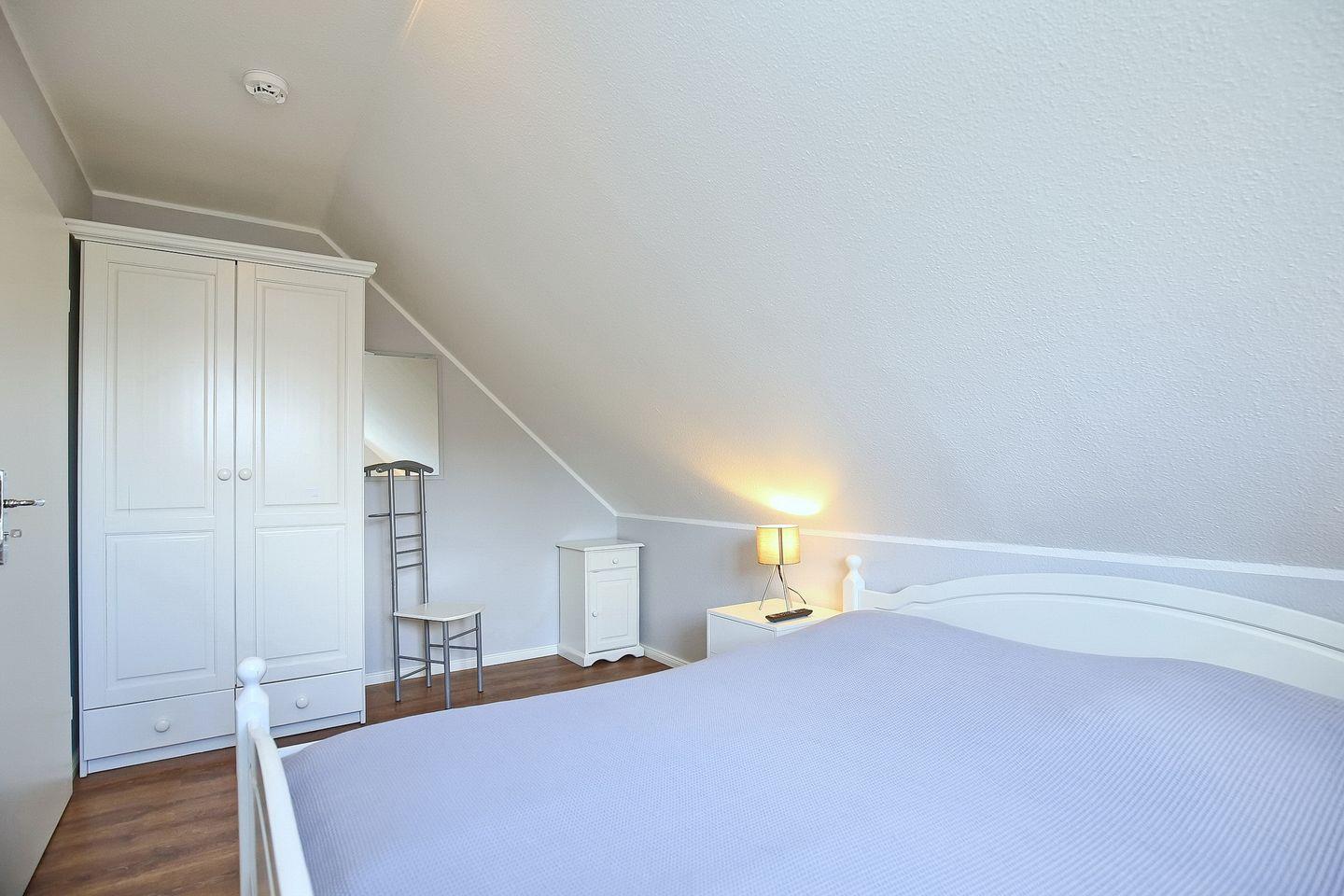 Im Schlafzimmer des 1. OG findest du neben zwei Einzelbetten (90 x 200 cm) auch einen Kleiderschrank vor. Beide Schlafzimmer im Dachgeschoss sind mit jeweils einem Doppelbett (2 x 90 x 200 cm und 2 x 80 x 200 cm) und einem Kleiderschrank eingerichtet. Hier kann ein zweiter Flachbild-TV genutzt werden. In den Schlafzimmern wurde Laminat ausgelegt. Zur Verdunkelung sind Rollos und teilweise Außenjalousien an den Fenstern angebracht.