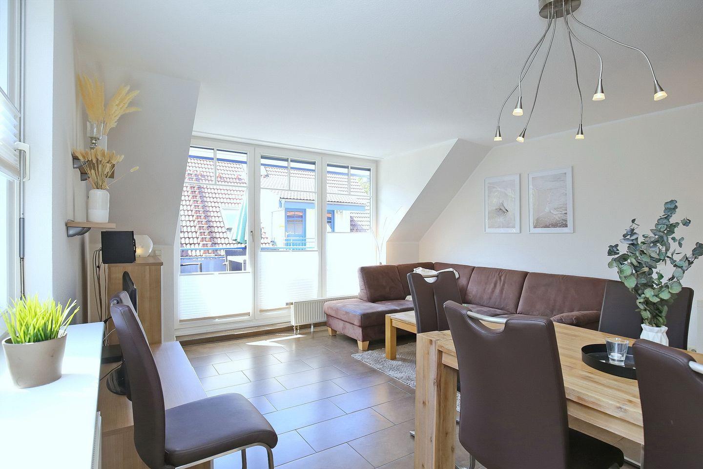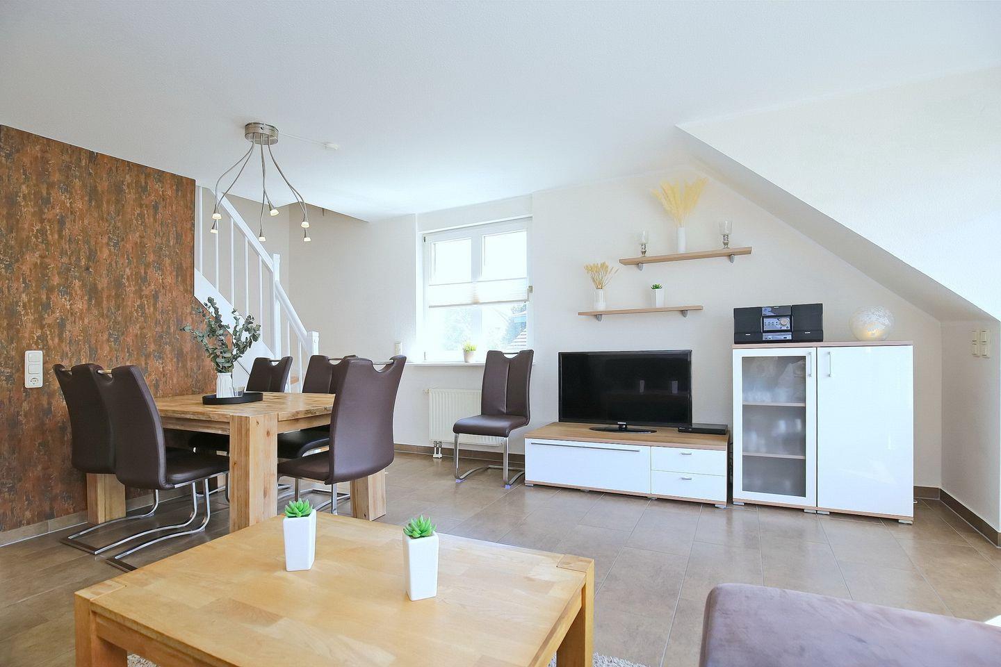 Das lichtdurchflutete Wohnzimmer auf der unteren Ebene ist mit einer gemütlicher Eck-Couch und einem einladenden Essbereich für sechs Personen ausgestattet. Für Abwechslung sorgen ein Flachbild-TV und ein Blu-ray-Player. Über eine innenliegende Treppe erreichst du die beiden Schlafzimmer im Dachgeschoss.