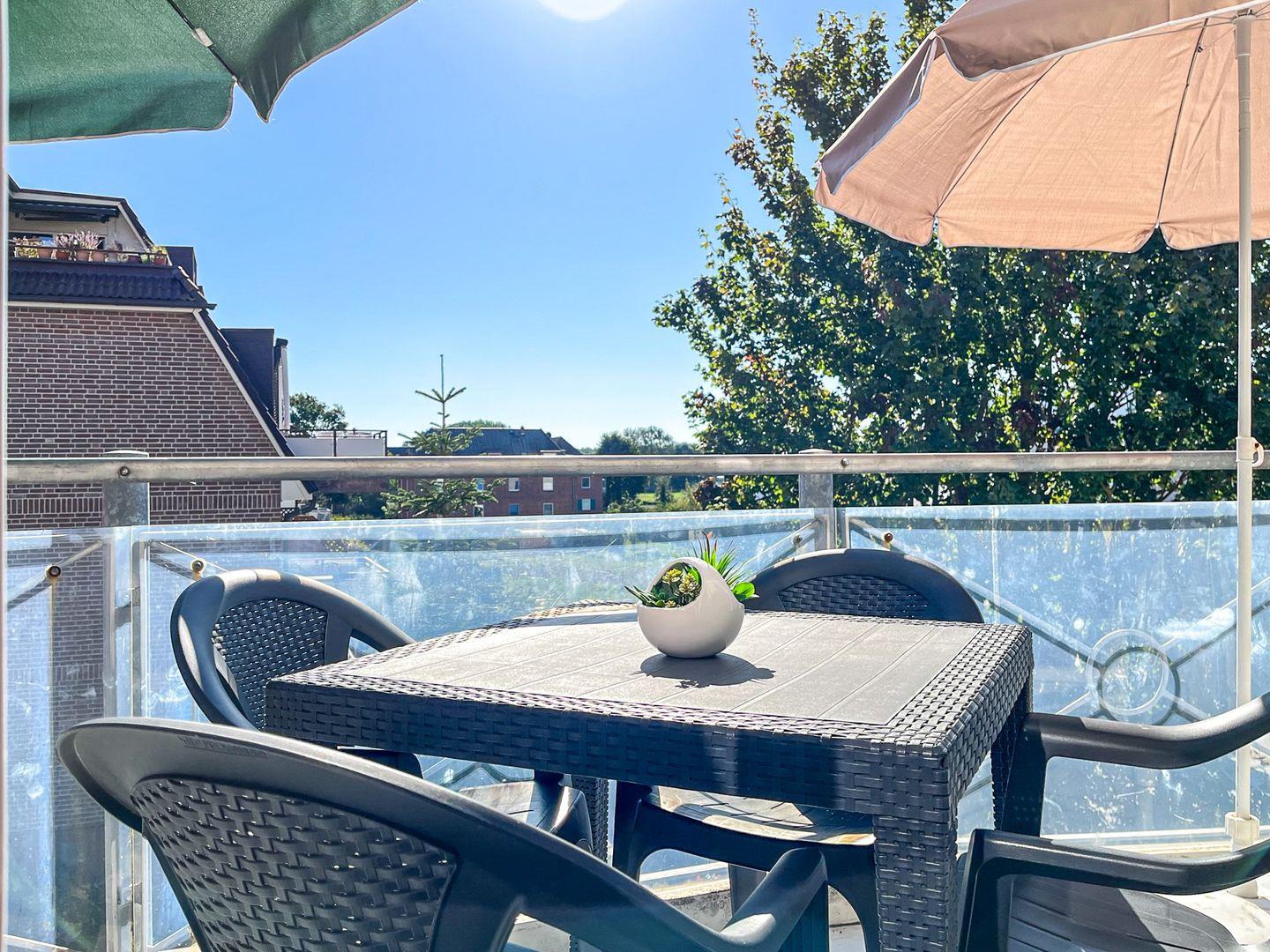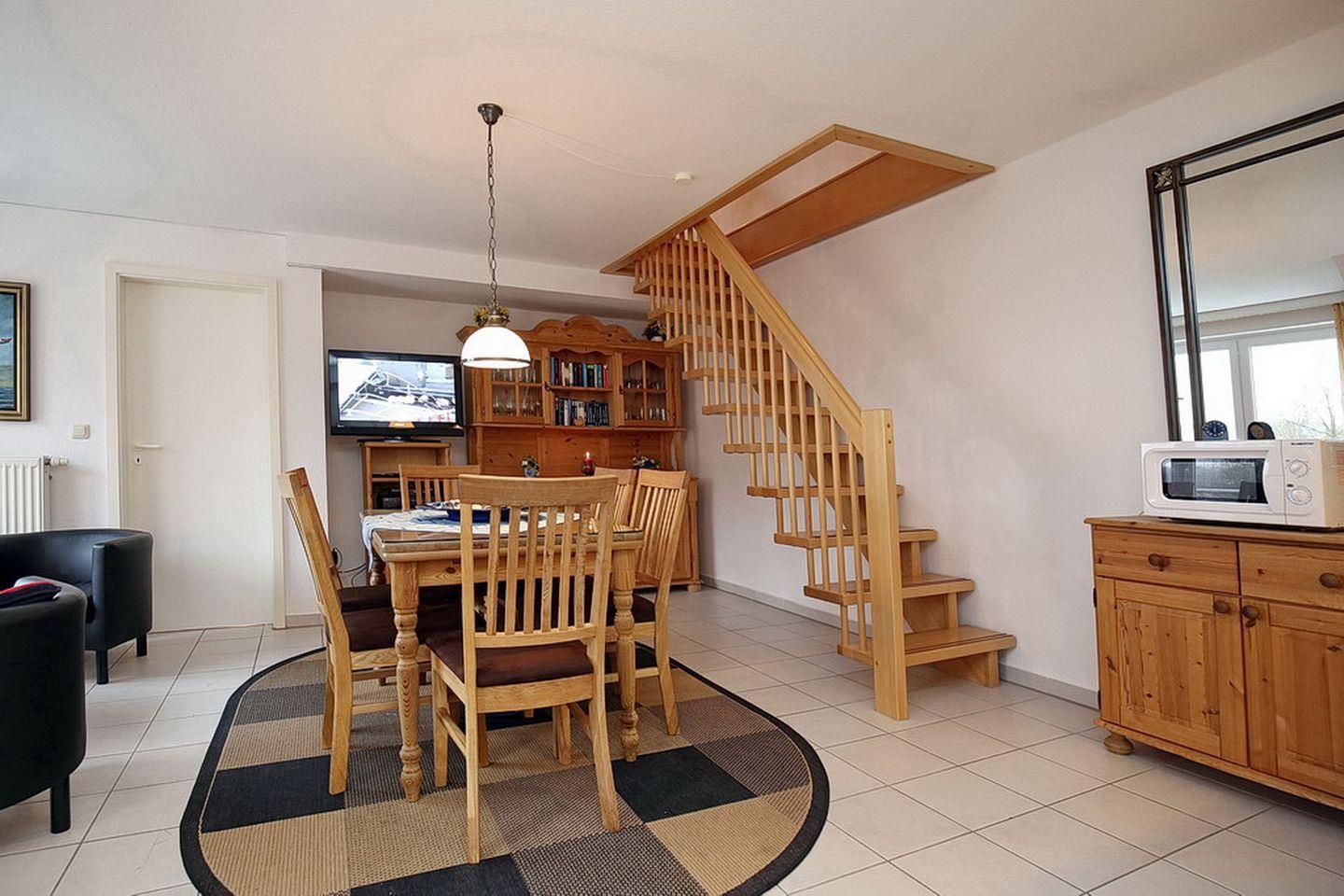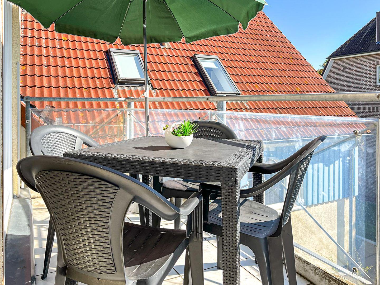 Die sonnige 3-Zimmer-Ferienwohnung liegt im zweiten Obergeschoss. In die dritte Ebene im Dachgeschoss kommst du über die Treppe. Im Wohnbereich bieten dir ein Flachbild-TV und ein Radio mit CD-Player Unterhaltung. Auch eine kleine Auswahl an Büchern und Filmen steht dir zur Verfügung. Auf dem Süd-Ost-Balkon kannst du den Tag Revue passieren lassen.