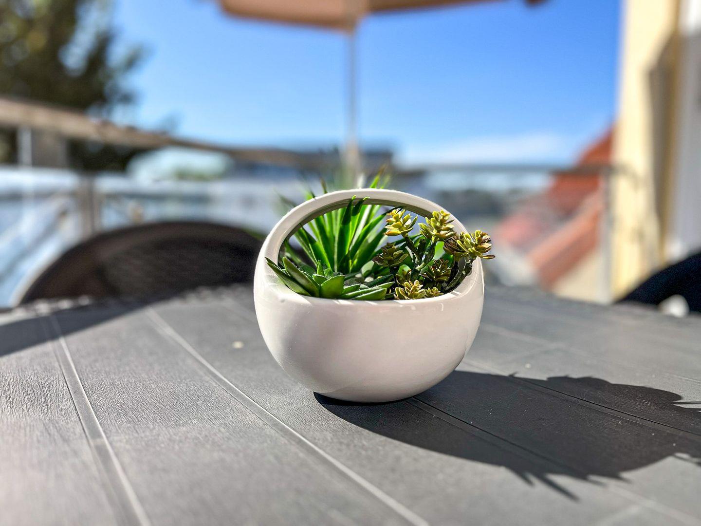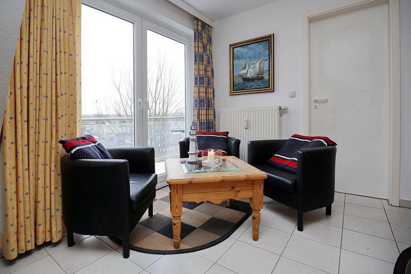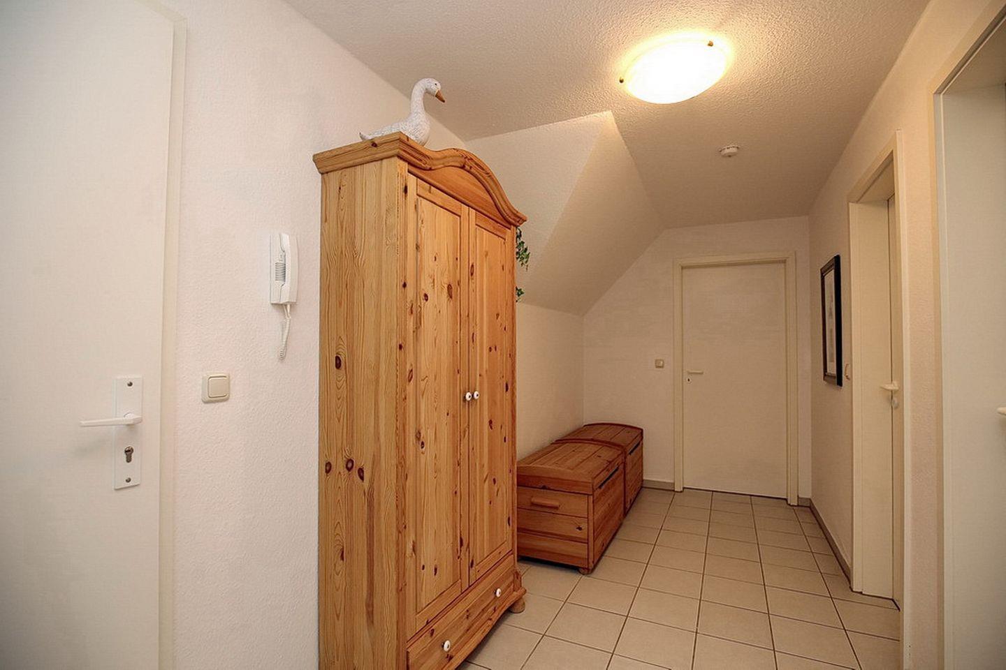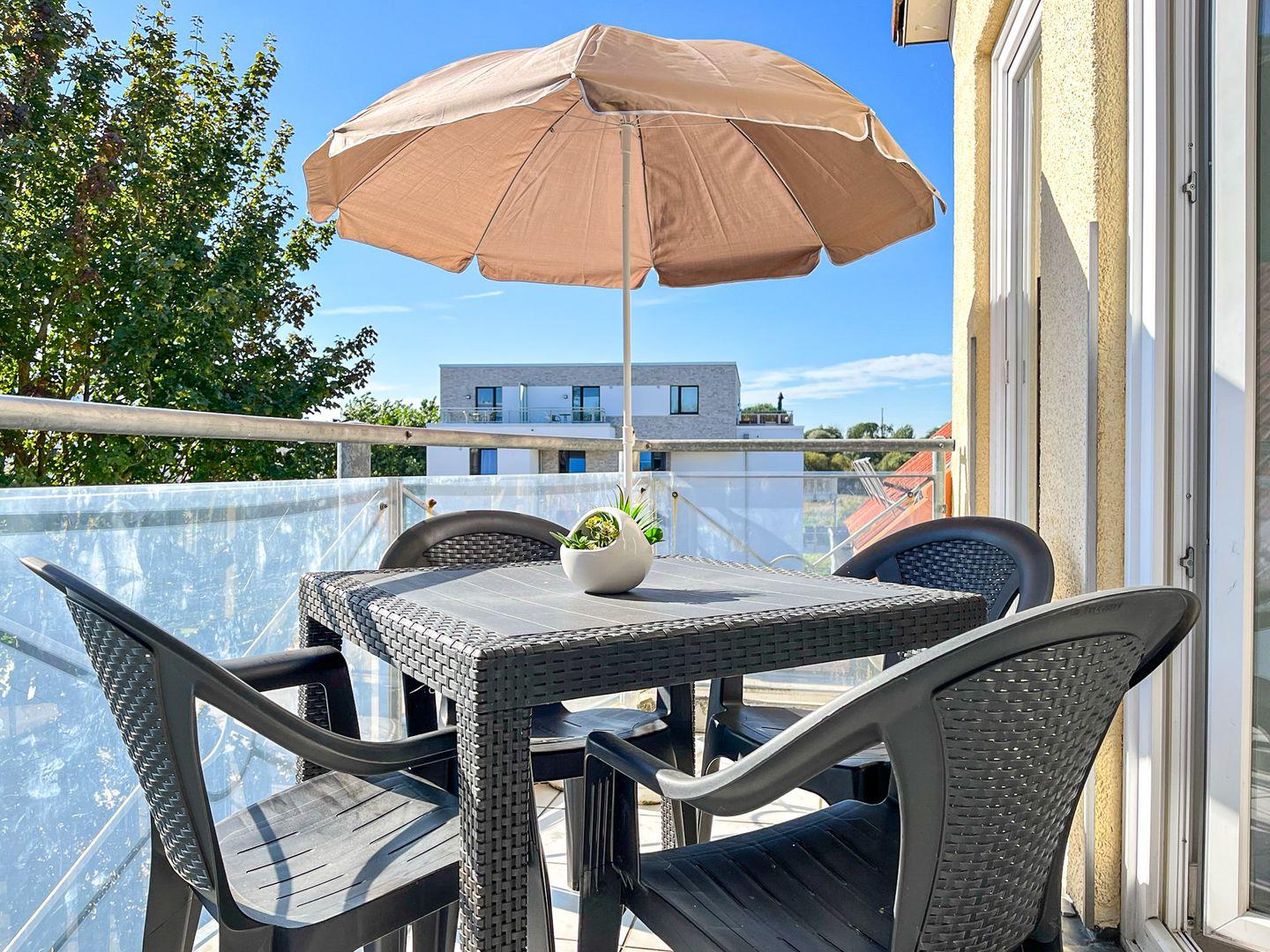 Die sonnige 3-Zimmer-Ferienwohnung liegt im zweiten Obergeschoss. In die dritte Ebene im Dachgeschoss kommst du über die Treppe. Im Wohnbereich bieten dir ein Flachbild-TV und ein Radio mit CD-Player Unterhaltung. Auch eine kleine Auswahl an Büchern und Filmen steht dir zur Verfügung. Auf dem Süd-Ost-Balkon kannst du den Tag Revue passieren lassen.