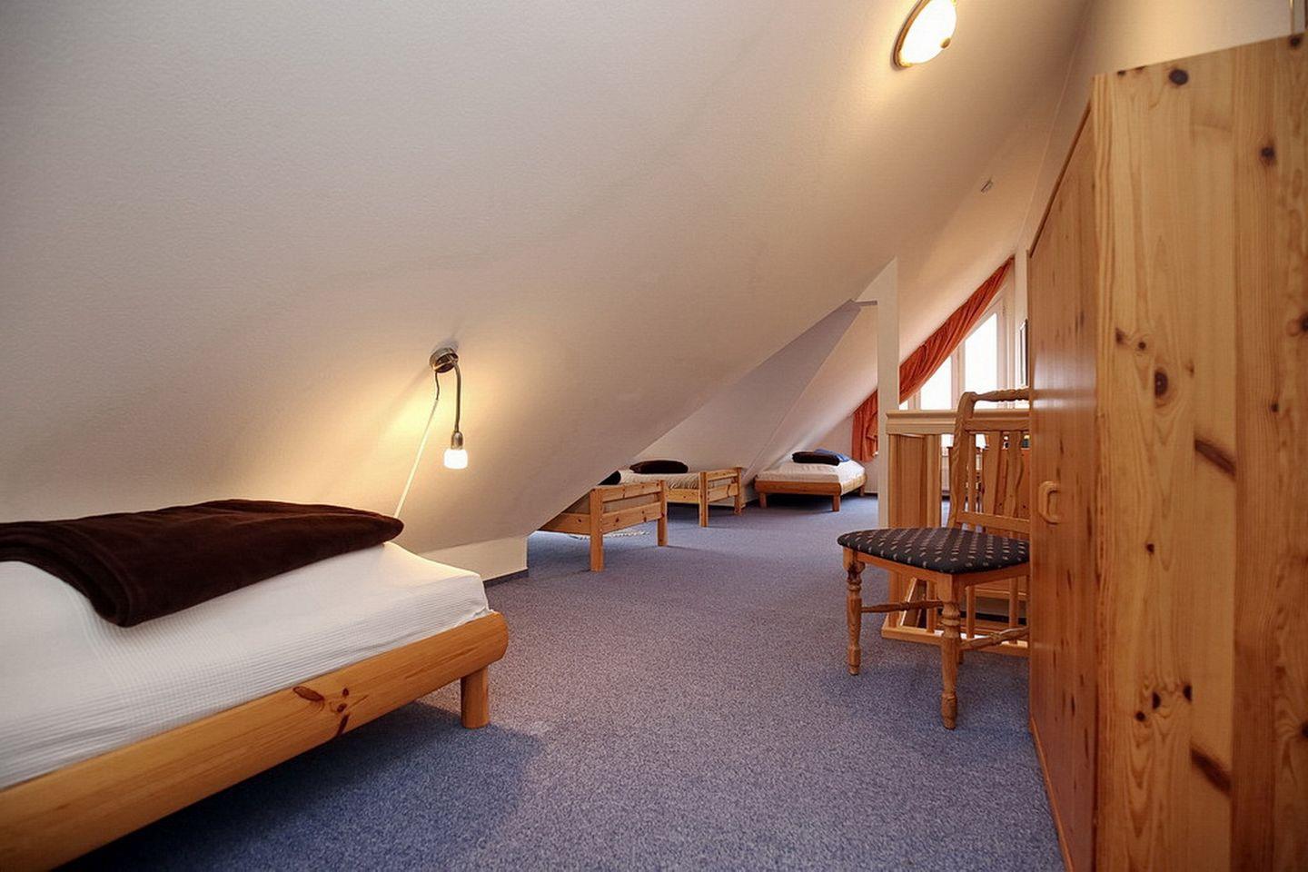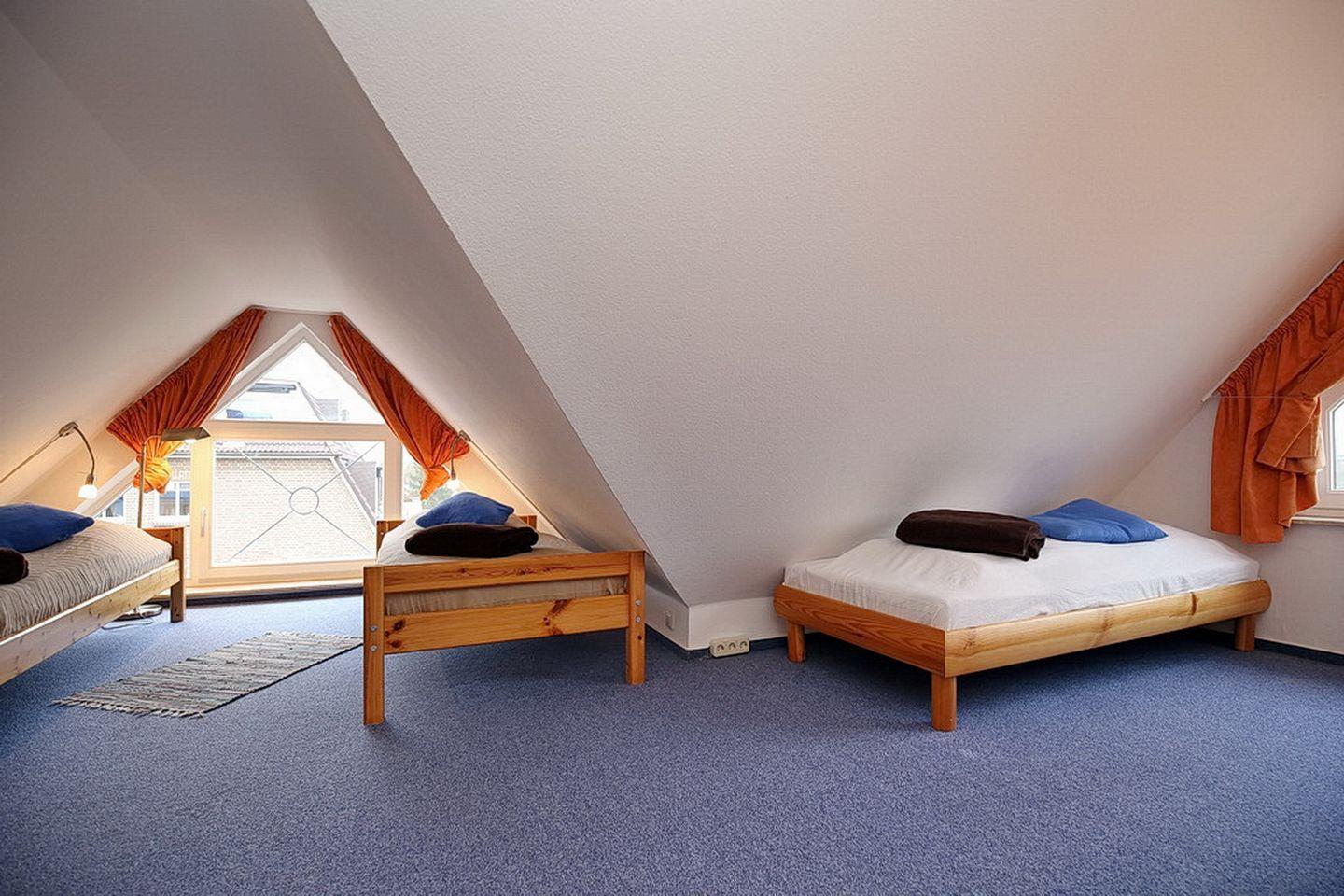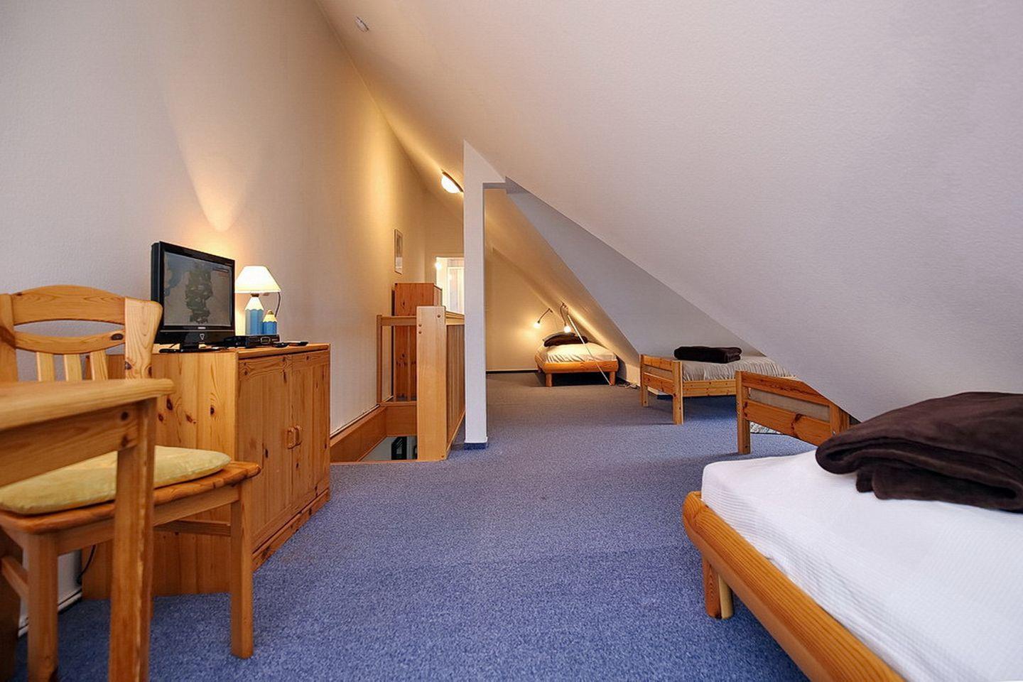 Im Dachgeschoss befinden sich das zweite Duschbad mit WC und eine kleine Sitzecke mit Flachbild-TV. Auch das zweite Schlafzimmer mit Teppichboden liegt hier. Als Schlafmöglichkeiten findest du hier vier Einzelbetten (je 90 x 200 cm). Im Schlafzimmer gibt es zur Unterhaltung einen zweiten Flachbild-TV.