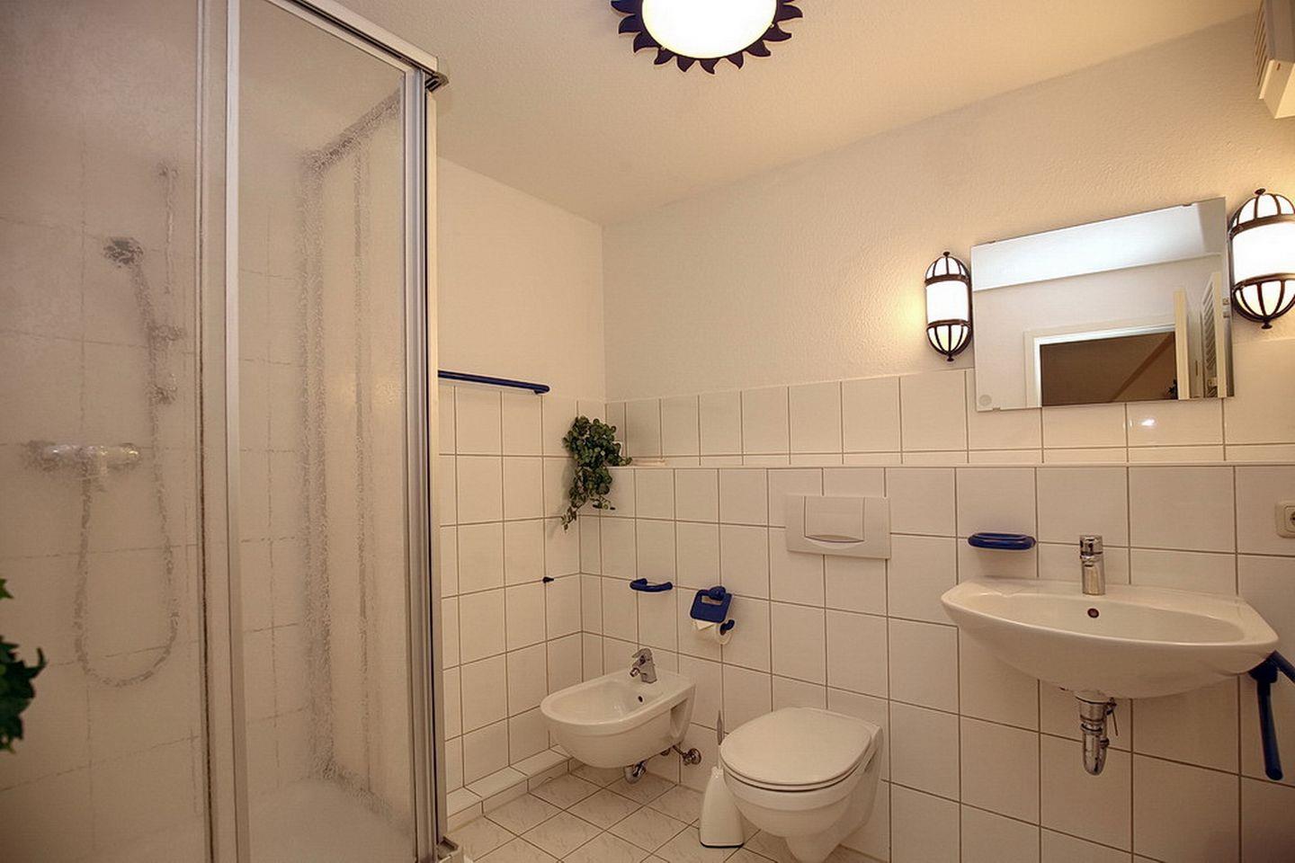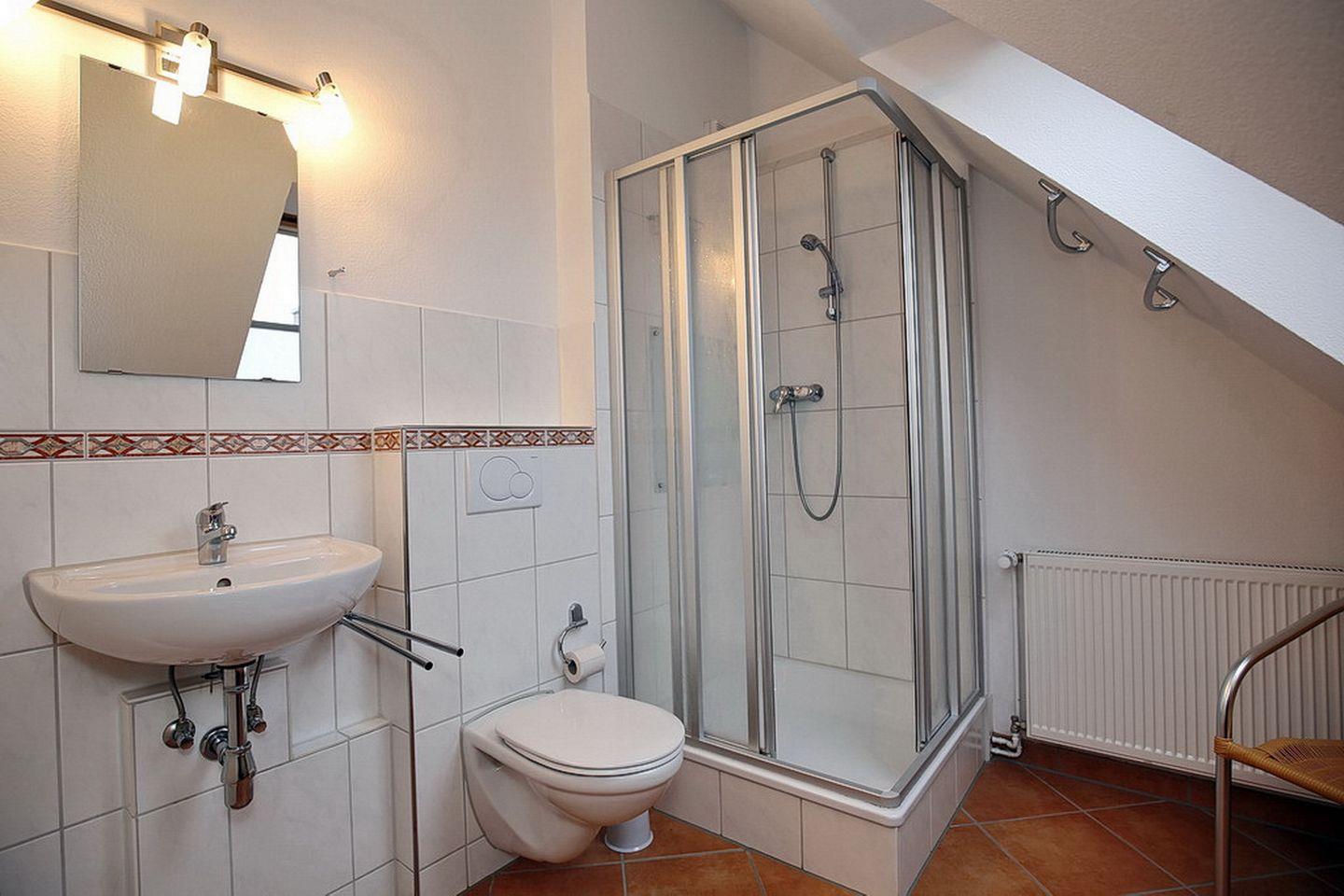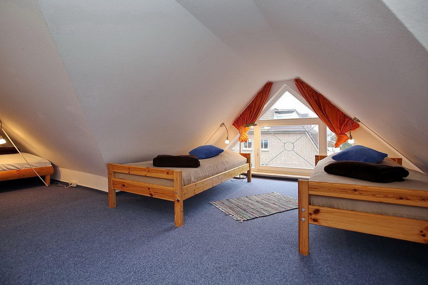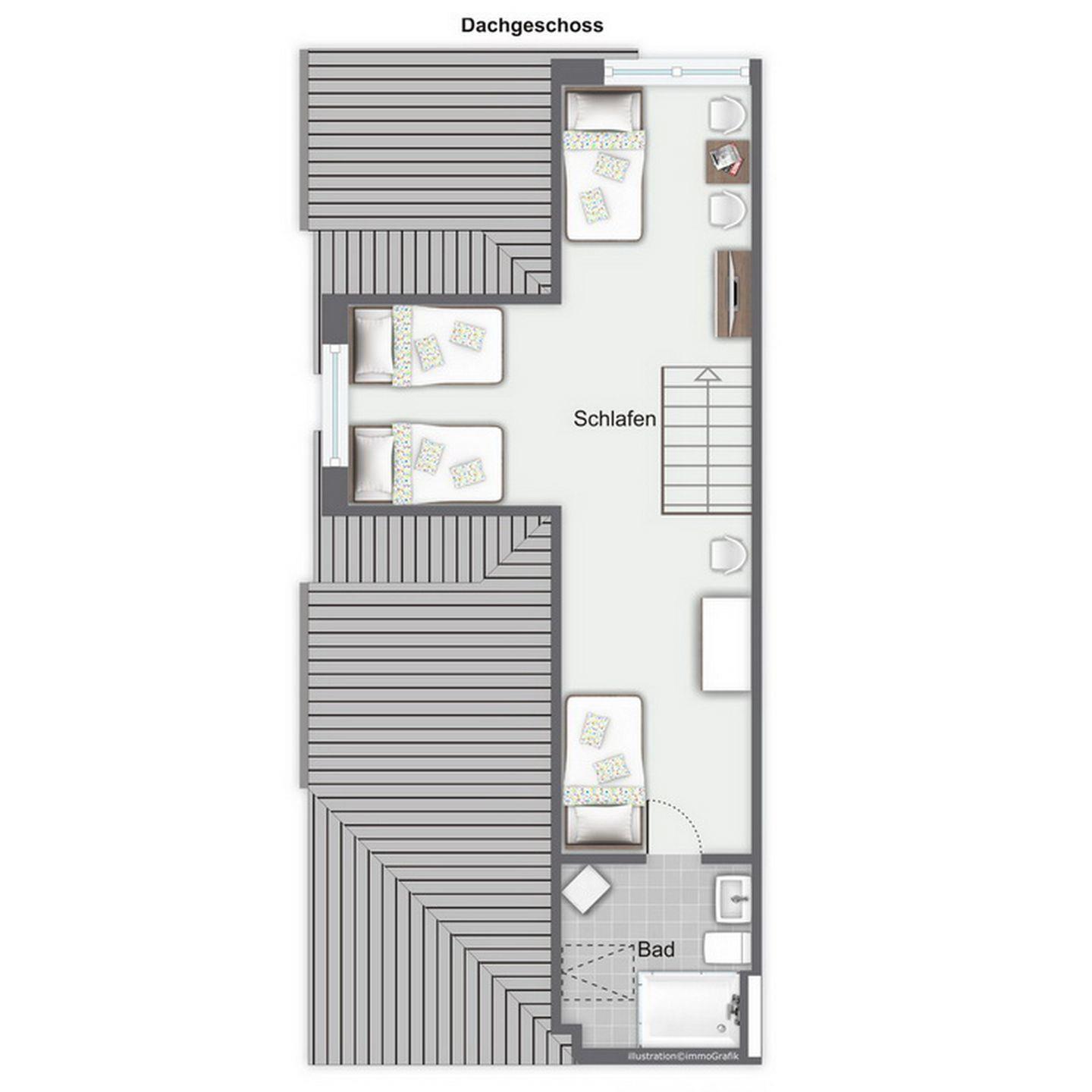 Im Dachgeschoss befinden sich das zweite Duschbad mit WC und eine kleine Sitzecke mit Flachbild-TV. Auch das zweite Schlafzimmer mit Teppichboden liegt hier. Als Schlafmöglichkeiten findest du hier vier Einzelbetten (je 90 x 200 cm). Im Schlafzimmer gibt es zur Unterhaltung einen zweiten Flachbild-TV.
