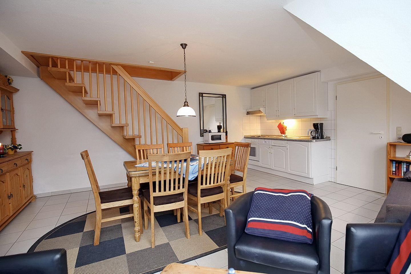 In den Wohnbereich integriert ist die Küchenzeile. Sie ist mit Herd, Backofen, 4-Plattenkochfeld, Kühlschrank mit Gefrierfach, Mikrowelle, Geschirrspüler und vielem mehr ausgestattet. An dem gemütlichen Esstisch haben 6 Personen Platz. Ein gefliestes Bad (2. OG) mit Dusche, Waschbecken, Bidet und WC ist selbstverständlich. In dieser Nichtraucherferienwohnung sind Haustiere nicht erwünscht.